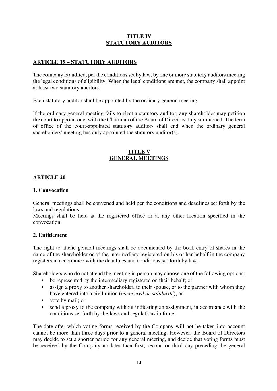 14 TITLE IV STATUTORY AUDITORS ARTICLE 19 – STATUTORY AUDITORS The company is audited, per the conditions set by law, by one or more statutory auditors meeting the legal conditions of eligibility. When the legal conditions are met, the company shall appoint at least two statutory auditors. Each statutory auditor shall be appointed by the ordinary general meeting. If the ordinary general meeting fails to elect a statutory auditor, any shareholder may petition the court to appoint one, with the Chairman of the Board of Directors duly summoned. The term of office of the court-appointed statutory auditors shall end when the ordinary general shareholders' meeting has duly appointed the statutory auditor(s). TITLE V GENERAL MEETINGS ARTICLE 20 1. Convocation General meetings shall be convened and held per the conditions and deadlines set forth by the laws and regulations. Meetings shall be held at the registered office or at any other location specified in the convocation. 2. Entitlement The right to attend general meetings shall be documented by the book entry of shares in the name of the shareholder or of the intermediary registered on his or her behalf in the company registers in accordance with the deadlines and conditions set forth by law. Shareholders who do not attend the meeting in person may choose one of the following options: • be represented by the intermediary registered on their behalf; or • assign a proxy to another shareholder, to their spouse, or to the partner with whom they have entered into a civil union (pacte civil de solidarité); or • vote by mail; or • send a proxy to the company without indicating an assignment, in accordance with the conditions set forth by the laws and regulations in force. The date after which voting forms received by the Company will not be taken into account cannot be more than three days prior to a general meeting. However, the Board of Directors may decide to set a shorter period for any general meeting, and decide that voting forms must be received by the Company no later than first, second or third day preceding the general