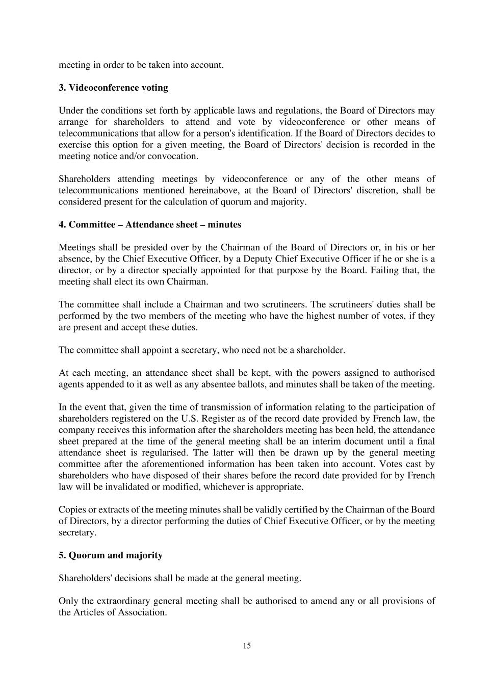 15 meeting in order to be taken into account. 3. Videoconference voting Under the conditions set forth by applicable laws and regulations, the Board of Directors may arrange for shareholders to attend and vote by videoconference or other means of telecommunications that allow for a person's identification. If the Board of Directors decides to exercise this option for a given meeting, the Board of Directors' decision is recorded in the meeting notice and/or convocation. Shareholders attending meetings by videoconference or any of the other means of telecommunications mentioned hereinabove, at the Board of Directors' discretion, shall be considered present for the calculation of quorum and majority. 4. Committee – Attendance sheet – minutes Meetings shall be presided over by the Chairman of the Board of Directors or, in his or her absence, by the Chief Executive Officer, by a Deputy Chief Executive Officer if he or she is a director, or by a director specially appointed for that purpose by the Board. Failing that, the meeting shall elect its own Chairman. The committee shall include a Chairman and two scrutineers. The scrutineers' duties shall be performed by the two members of the meeting who have the highest number of votes, if they are present and accept these duties. The committee shall appoint a secretary, who need not be a shareholder. At each meeting, an attendance sheet shall be kept, with the powers assigned to authorised agents appended to it as well as any absentee ballots, and minutes shall be taken of the meeting. In the event that, given the time of transmission of information relating to the participation of shareholders registered on the U.S. Register as of the record date provided by French law, the company receives this information after the shareholders meeting has been held, the attendance sheet prepared at the time of the general meeting shall be an interim document until a final attendance sheet is regularised. The latter will then be drawn up by the general meeting committee after the aforementioned information has been taken into account. Votes cast by shareholders who have disposed of their shares before the record date provided for by French law will be invalidated or modified, whichever is appropriate. Copies or extracts of the meeting minutes shall be validly certified by the Chairman of the Board of Directors, by a director performing the duties of Chief Executive Officer, or by the meeting secretary. 5. Quorum and majority Shareholders' decisions shall be made at the general meeting. Only the extraordinary general meeting shall be authorised to amend any or all provisions of the Articles of Association.