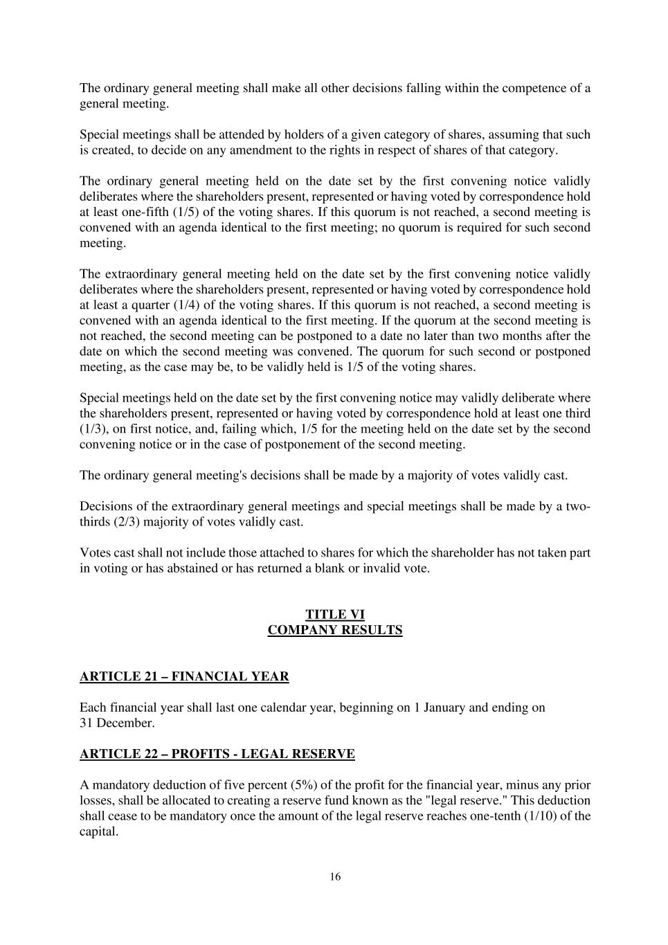 16 The ordinary general meeting shall make all other decisions falling within the competence of a general meeting. Special meetings shall be attended by holders of a given category of shares, assuming that such is created, to decide on any amendment to the rights in respect of shares of that category. The ordinary general meeting held on the date set by the first convening notice validly deliberates where the shareholders present, represented or having voted by correspondence hold at least one-fifth (1/5) of the voting shares. If this quorum is not reached, a second meeting is convened with an agenda identical to the first meeting; no quorum is required for such second meeting. The extraordinary general meeting held on the date set by the first convening notice validly deliberates where the shareholders present, represented or having voted by correspondence hold at least a quarter (1/4) of the voting shares. If this quorum is not reached, a second meeting is convened with an agenda identical to the first meeting. If the quorum at the second meeting is not reached, the second meeting can be postponed to a date no later than two months after the date on which the second meeting was convened. The quorum for such second or postponed meeting, as the case may be, to be validly held is 1/5 of the voting shares. Special meetings held on the date set by the first convening notice may validly deliberate where the shareholders present, represented or having voted by correspondence hold at least one third (1/3), on first notice, and, failing which, 1/5 for the meeting held on the date set by the second convening notice or in the case of postponement of the second meeting. The ordinary general meeting's decisions shall be made by a majority of votes validly cast. Decisions of the extraordinary general meetings and special meetings shall be made by a two- thirds (2/3) majority of votes validly cast. Votes cast shall not include those attached to shares for which the shareholder has not taken part in voting or has abstained or has returned a blank or invalid vote. TITLE VI COMPANY RESULTS ARTICLE 21 – FINANCIAL YEAR Each financial year shall last one calendar year, beginning on 1 January and ending on 31 December. ARTICLE 22 – PROFITS - LEGAL RESERVE A mandatory deduction of five percent (5%) of the profit for the financial year, minus any prior losses, shall be allocated to creating a reserve fund known as the "legal reserve." This deduction shall cease to be mandatory once the amount of the legal reserve reaches one-tenth (1/10) of the capital.