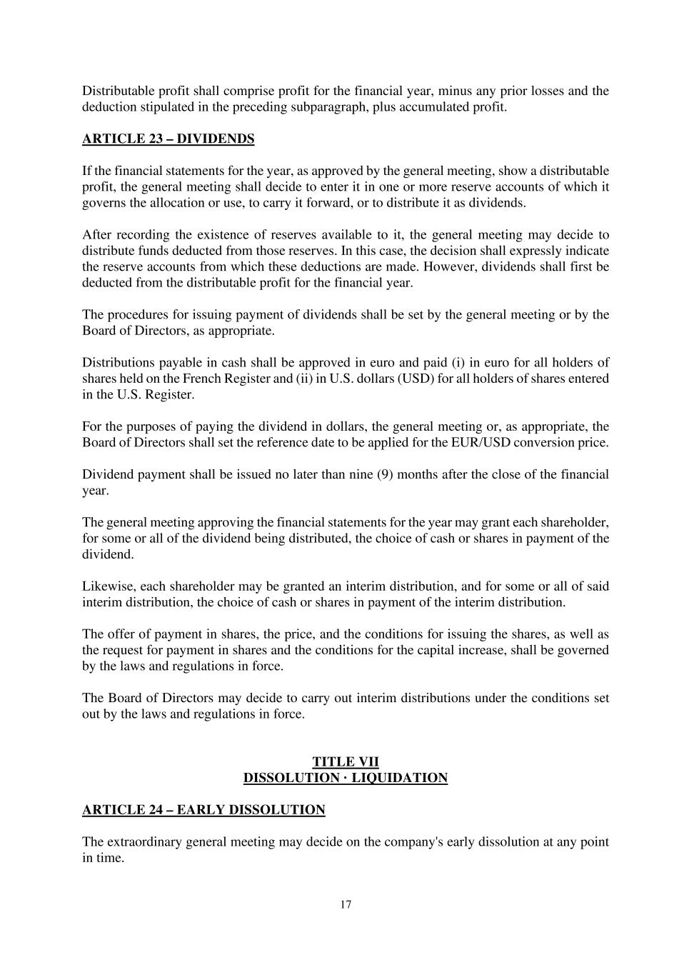 17 Distributable profit shall comprise profit for the financial year, minus any prior losses and the deduction stipulated in the preceding subparagraph, plus accumulated profit. ARTICLE 23 – DIVIDENDS If the financial statements for the year, as approved by the general meeting, show a distributable profit, the general meeting shall decide to enter it in one or more reserve accounts of which it governs the allocation or use, to carry it forward, or to distribute it as dividends. After recording the existence of reserves available to it, the general meeting may decide to distribute funds deducted from those reserves. In this case, the decision shall expressly indicate the reserve accounts from which these deductions are made. However, dividends shall first be deducted from the distributable profit for the financial year. The procedures for issuing payment of dividends shall be set by the general meeting or by the Board of Directors, as appropriate. Distributions payable in cash shall be approved in euro and paid (i) in euro for all holders of shares held on the French Register and (ii) in U.S. dollars (USD) for all holders of shares entered in the U.S. Register. For the purposes of paying the dividend in dollars, the general meeting or, as appropriate, the Board of Directors shall set the reference date to be applied for the EUR/USD conversion price. Dividend payment shall be issued no later than nine (9) months after the close of the financial year. The general meeting approving the financial statements for the year may grant each shareholder, for some or all of the dividend being distributed, the choice of cash or shares in payment of the dividend. Likewise, each shareholder may be granted an interim distribution, and for some or all of said interim distribution, the choice of cash or shares in payment of the interim distribution. The offer of payment in shares, the price, and the conditions for issuing the shares, as well as the request for payment in shares and the conditions for the capital increase, shall be governed by the laws and regulations in force. The Board of Directors may decide to carry out interim distributions under the conditions set out by the laws and regulations in force. TITLE VII DISSOLUTION · LIQUIDATION ARTICLE 24 – EARLY DISSOLUTION The extraordinary general meeting may decide on the company's early dissolution at any point in time.