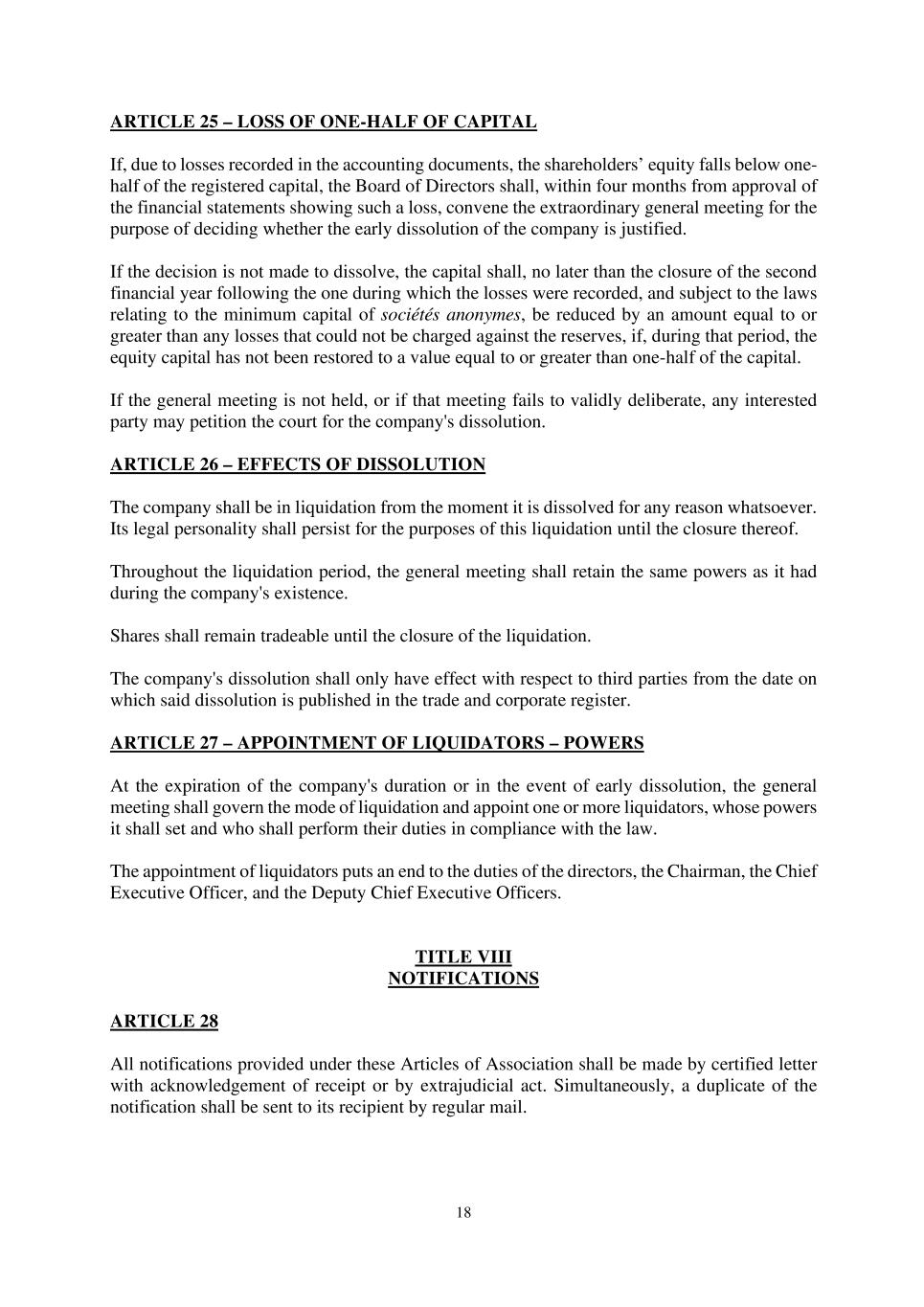 18 ARTICLE 25 – LOSS OF ONE-HALF OF CAPITAL If, due to losses recorded in the accounting documents, the shareholders’ equity falls below one- half of the registered capital, the Board of Directors shall, within four months from approval of the financial statements showing such a loss, convene the extraordinary general meeting for the purpose of deciding whether the early dissolution of the company is justified. If the decision is not made to dissolve, the capital shall, no later than the closure of the second financial year following the one during which the losses were recorded, and subject to the laws relating to the minimum capital of sociétés anonymes, be reduced by an amount equal to or greater than any losses that could not be charged against the reserves, if, during that period, the equity capital has not been restored to a value equal to or greater than one-half of the capital. If the general meeting is not held, or if that meeting fails to validly deliberate, any interested party may petition the court for the company's dissolution. ARTICLE 26 – EFFECTS OF DISSOLUTION The company shall be in liquidation from the moment it is dissolved for any reason whatsoever. Its legal personality shall persist for the purposes of this liquidation until the closure thereof. Throughout the liquidation period, the general meeting shall retain the same powers as it had during the company's existence. Shares shall remain tradeable until the closure of the liquidation. The company's dissolution shall only have effect with respect to third parties from the date on which said dissolution is published in the trade and corporate register. ARTICLE 27 – APPOINTMENT OF LIQUIDATORS – POWERS At the expiration of the company's duration or in the event of early dissolution, the general meeting shall govern the mode of liquidation and appoint one or more liquidators, whose powers it shall set and who shall perform their duties in compliance with the law. The appointment of liquidators puts an end to the duties of the directors, the Chairman, the Chief Executive Officer, and the Deputy Chief Executive Officers. TITLE VIII NOTIFICATIONS ARTICLE 28 All notifications provided under these Articles of Association shall be made by certified letter with acknowledgement of receipt or by extrajudicial act. Simultaneously, a duplicate of the notification shall be sent to its recipient by regular mail.