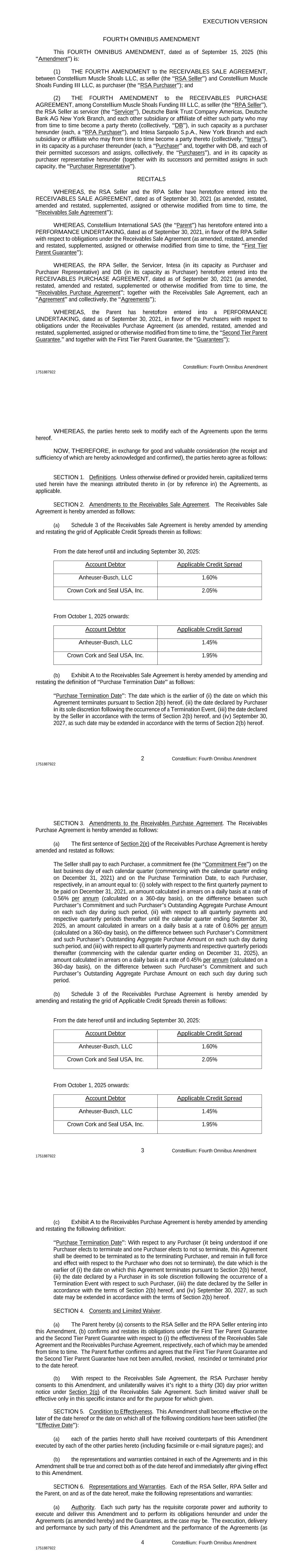 EXECUTION VERSION Constellium: Fourth Omnibus Amendment 1751887922 FOURTH OMNIBUS AMENDMENT This FOURTH OMNIBUS AMENDMENT, dated as of September 15, 2025 (this “Amendment”) is: (1) THE FOURTH AMENDMENT to the RECEIVABLES SALE AGREEMENT, between Constellium Muscle Shoals LLC, as seller (the “RSA Seller”) and Constellium Muscle Shoals Funding III LLC, as purchaser (the “RSA Purchaser”); and (2) THE FOURTH AMENDMENT to the RECEIVABLES PURCHASE AGREEMENT, among Constellium Muscle Shoals Funding III LLC, as seller (the “RPA Seller”), the RSA Seller as servicer (the “Servicer”), Deutsche Bank Trust Company Americas, Deutsche Bank AG New York Branch, and each other subsidiary or affiliate of either such party who may from time to time become a party thereto (collectively, “DB”), in such capacity as a purchaser hereunder (each, a “RPA Purchaser”), and Intesa Sanpaolo S.p.A., New York Branch and each subsidiary or affiliate who may from time to time become a party thereto (collectively, “Intesa”), in its capacity as a purchaser thereunder (each, a “Purchaser” and, together with DB, and each of their permitted successors and assigns, collectively, the “Purchasers”), and in its capacity as purchaser representative hereunder (together with its successors and permitted assigns in such capacity, the “Purchaser Representative”). RECITALS WHEREAS, the RSA Seller and the RPA Seller have heretofore entered into the RECEIVABLES SALE AGREEMENT, dated as of September 30, 2021 (as amended, restated, amended and restated, supplemented, assigned or otherwise modified from time to time, the “Receivables Sale Agreement”); WHEREAS, Constellium International SAS (the “Parent”) has heretofore entered into a PERFORMANCE UNDERTAKING, dated as of September 30, 2021, in favor of the RPA Seller with respect to obligations under the Receivables Sale Agreement (as amended, restated, amended and restated, supplemented, assigned or otherwise modified from time to time, the “First Tier Parent Guarantee”); WHEREAS, the RPA Seller, the Servicer, Intesa (in its capacity as Purchaser and Purchaser Representative) and DB (in its capacity as Purchaser) heretofore entered into the RECEIVABLES PURCHASE AGREEMENT, dated as of September 30, 2021 (as amended, restated, amended and restated, supplemented or otherwise modified from time to time, the “Receivables Purchase Agreement”; together with the Receivables Sale Agreement, each an “Agreement” and collectively, the “Agreements”); WHEREAS, the Parent has heretofore entered into a PERFORMANCE UNDERTAKING, dated as of September 30, 2021, in favor of the Purchasers with respect to obligations under the Receivables Purchase Agreement (as amended, restated, amended and restated, supplemented, assigned or otherwise modified from time to time, the “Second Tier Parent Guarantee,” and together with the First Tier Parent Guarantee, the “Guarantees”); 2 Constellium: Fourth Omnibus Amendment 1751887922 WHEREAS, the parties hereto seek to modify each of the Agreements upon the terms hereof. NOW, THEREFORE, in exchange for good and valuable consideration (the receipt and sufficiency of which are hereby acknowledged and confirmed), the parties hereto agree as follows: SECTION 1. Definitions. Unless otherwise defined or provided herein, capitalized terms used herein have the meanings attributed thereto in (or by reference in) the Agreements, as applicable. SECTION 2. Amendments to the Receivables Sale Agreement. The Receivables Sale Agreement is hereby amended as follows: (a) Schedule 3 of the Receivables Sale Agreement is hereby amended by amending and restating the grid of Applicable Credit Spreads therein as follows: From the date hereof until and including September 30, 2025: Account Debtor Applicable Credit Spread Anheuser-Busch, LLC 1.60% Crown Cork and Seal USA, Inc. 2.05% From October 1, 2025 onwards: Account Debtor Applicable Credit Spread Anheuser-Busch, LLC 1.45% Crown Cork and Seal USA, Inc. 1.95% (b) Exhibit A to the Receivables Sale Agreement is hereby amended by amending and restating the definition of “Purchase Termination Date” as follows: “Purchase Termination Date”: The date which is the earlier of (i) the date on which this Agreement terminates pursuant to Section 2(b) hereof, (ii) the date declared by Purchaser in its sole discretion following the occurrence of a Termination Event, (iii) the date declared by the Seller in accordance with the terms of Section 2(b) hereof, and (iv) September 30, 2027, as such date may be extended in accordance with the terms of Section 2(b) hereof. 3 Constellium: Fourth Omnibus Amendment 1751887922 SECTION 3. Amendments to the Receivables Purchase Agreement. The Receivables Purchase Agreement is hereby amended as follows: (a) The first sentence of Section 2(e) of the Receivables Purchase Agreement is hereby amended and restated as follows: The Seller shall pay to each Purchaser, a commitment fee (the “Commitment Fee”) on the last business day of each calendar quarter (commencing with the calendar quarter ending on December 31, 2021) and on the Purchase Termination Date, to each Purchaser, respectively, in an amount equal to: (i) solely with respect to the first quarterly payment to be paid on December 31, 2021, an amount calculated in arrears on a daily basis at a rate of 0.56% per annum (calculated on a 360-day basis), on the difference between such Purchaser’s Commitment and such Purchaser’s Outstanding Aggregate Purchase Amount on each such day during such period, (ii) with respect to all quarterly payments and respective quarterly periods thereafter until the calendar quarter ending September 30, 2025, an amount calculated in arrears on a daily basis at a rate of 0.60% per annum (calculated on a 360-day basis), on the difference between such Purchaser’s Commitment and such Purchaser’s Outstanding Aggregate Purchase Amount on each such day during such 