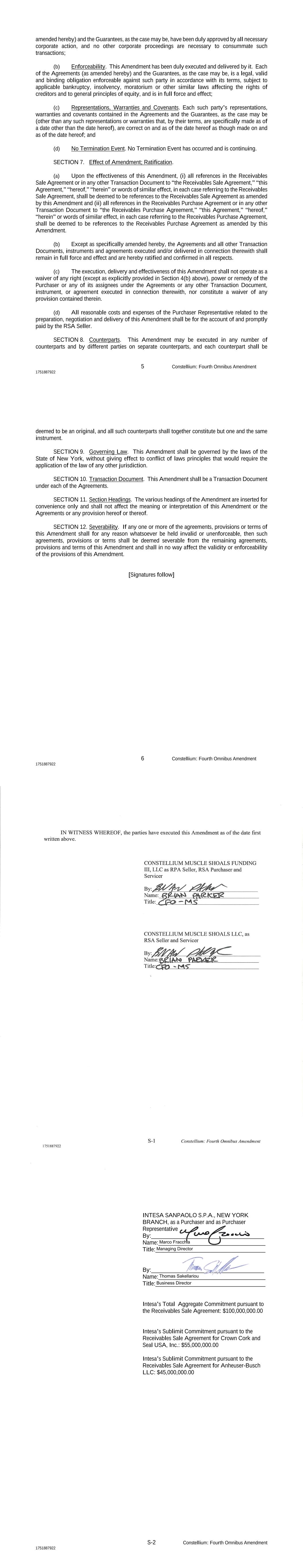 5 Constellium: Fourth Omnibus Amendment 1751887922 amended hereby) and the Guarantees, as the case may be, have been duly approved by all necessary corporate action, and no other corporate proceedings are necessary to consummate such transactions; (b) Enforceability. This Amendment has been duly executed and delivered by it. Each of the Agreements (as amended hereby) and the Guarantees, as the case may be, is a legal, valid and binding obligation enforceable against such party in accordance with its terms, subject to applicable bankruptcy, insolvency, moratorium or other similar laws affecting the rights of creditors and to general principles of equity, and is in full force and effect; (c) Representations, Warranties and Covenants. Each such party’s representations, warranties and covenants contained in the Agreements and the Guarantees, as the case may be (other than any such representations or warranties that, by their terms, are specifically made as of a date other than the date hereof), are correct on and as of the date hereof as though made on and as of the date hereof; and (d) No Termination Event. No Termination Event has occurred and is continuing. SECTION 7. Effect of Amendment; Ratification. (a) Upon the effectiveness of this Amendment, (i) all references in the Receivables Sale Agreement or in any other Transaction Document to “the Receivables Sale Agreement,” “this Agreement,” “hereof,” “herein” or words of similar effect, in each case referring to the Receivables Sale Agreement, shall be deemed to be references to the Receivables Sale Agreement as amended by this Amendment and (ii) all references in the Receivables Purchase Agreement or in any other Transaction Document to “the Receivables Purchase Agreement,” “this Agreement,” “hereof,” “herein” or words of similar effect, in each case referring to the Receivables Purchase Agreement, shall be deemed to be references to the Receivables Purchase Agreement as amended by this Amendment. (b) Except as specifically amended hereby, the Agreements and all other Transaction Documents, instruments and agreements executed and/or delivered in connection therewith shall remain in full force and effect and are hereby ratified and confirmed in all respects. (c) The execution, delivery and effectiveness of this Amendment shall not operate as a waiver of any right (except as explicitly provided in Section 4(b) above), power or remedy of the Purchaser or any of its assignees under the Agreements or any other Transaction Document, instrument, or agreement executed in connection therewith, nor constitute a waiver of any provision contained therein. (d) All reasonable costs and expenses of the Purchaser Representative related to the preparation, negotiation and delivery of this Amendment shall be for the account of and promptly paid by the RSA Seller. SECTION 8. Counterparts. This Amendment may be executed in any number of counterparts and by different parties on separate counterparts, and each counterpart shall be 6 Constellium: Fourth Omnibus Amendment 1751887922 deemed to be an original, and all such counterparts shall together constitute but one and the same instrument. SECTION 9. Governing Law. This Amendment shall be governed by the laws of the State of New York, without giving effect to conflict of laws principles that would require the application of the law of any other jurisdiction. SECTION 10. Transaction Document. This Amendment shall be a Transaction Document under each of the Agreements. SECTION 11. Section Headings. The various headings of the Amendment are inserted for convenience only and shall not affect the meaning or interpretation of this Amendment or the Agreements or any provision hereof or thereof. SECTION 12. Severability. If any one or more of the agreements, provisions or terms of this Amendment shall for any reason whatsoever be held invalid or unenforceable, then such agreements, provisions or terms shall be deemed severable from the remaining agreements, provisions and terms of this Amendment and shall in no way affect the validity or enforceability of the provisions of this Amendment. [Signatures follow] S-2 Constellium: Fourth Omnibus Amendment 1751887922 INTESA SANPAOLO S.P.A., NEW YORK BRANCH, as a Purchaser and as Purchaser Representative By:______________________________________ Name:____________________________________ Title:_____________________________________ By:______________________________________ Name:____________________________________ Title:_____________________________________ Intesa’s Total Aggregate Commitment pursuant to the Receivables Sale Agreement: $100,000,000.00 Intesa’s Sublimit Commitment pursuant to the Receivables Sale Agreement for Crown Cork and Seal USA, Inc.: $55,000,000.00 Intesa’s Sublimit Commitment pursuant to the Receivables Sale Agreement for Anheuser-Busch LLC: $45,000,000.00 Marco Fracchia Managing Director Thomas Sakellariou Business Director