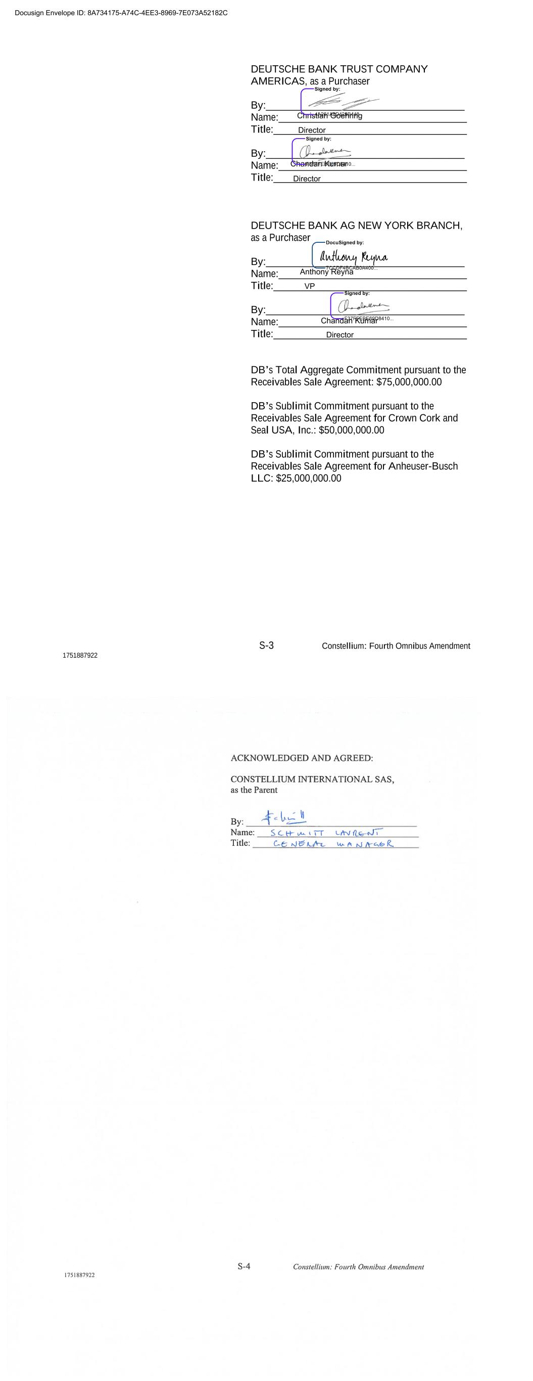 S-3 Constellium: Fourth Omnibus Amendment 1751887922 DEUTSCHE BANK TRUST COMPANY AMERICAS, as a Purchaser By:______________________________________ Name:____________________________________ Title:_____________________________________ By:______________________________________ Name:____________________________________ Title:_____________________________________ DEUTSCHE BANK AG NEW YORK BRANCH, as a Purchaser By:______________________________________ Name:____________________________________ Title:_____________________________________ By:______________________________________ Name:____________________________________ Title:_____________________________________ DB’s Total Aggregate Commitment pursuant to the Receivables Sale Agreement: $75,000,000.00 DB’s Sublimit Commitment pursuant to the Receivables Sale Agreement for Crown Cork and Seal USA, Inc.: $50,000,000.00 DB’s Sublimit Commitment pursuant to the Receivables Sale Agreement for Anheuser-Busch LLC: $25,000,000.00 Docusign Envelope ID: 8A734175-A74C-4EE3-8969-7E073A52182C VP Anthony Reyna Chandan Kumar Director Director Chandan Kumar Christian Goehring Director