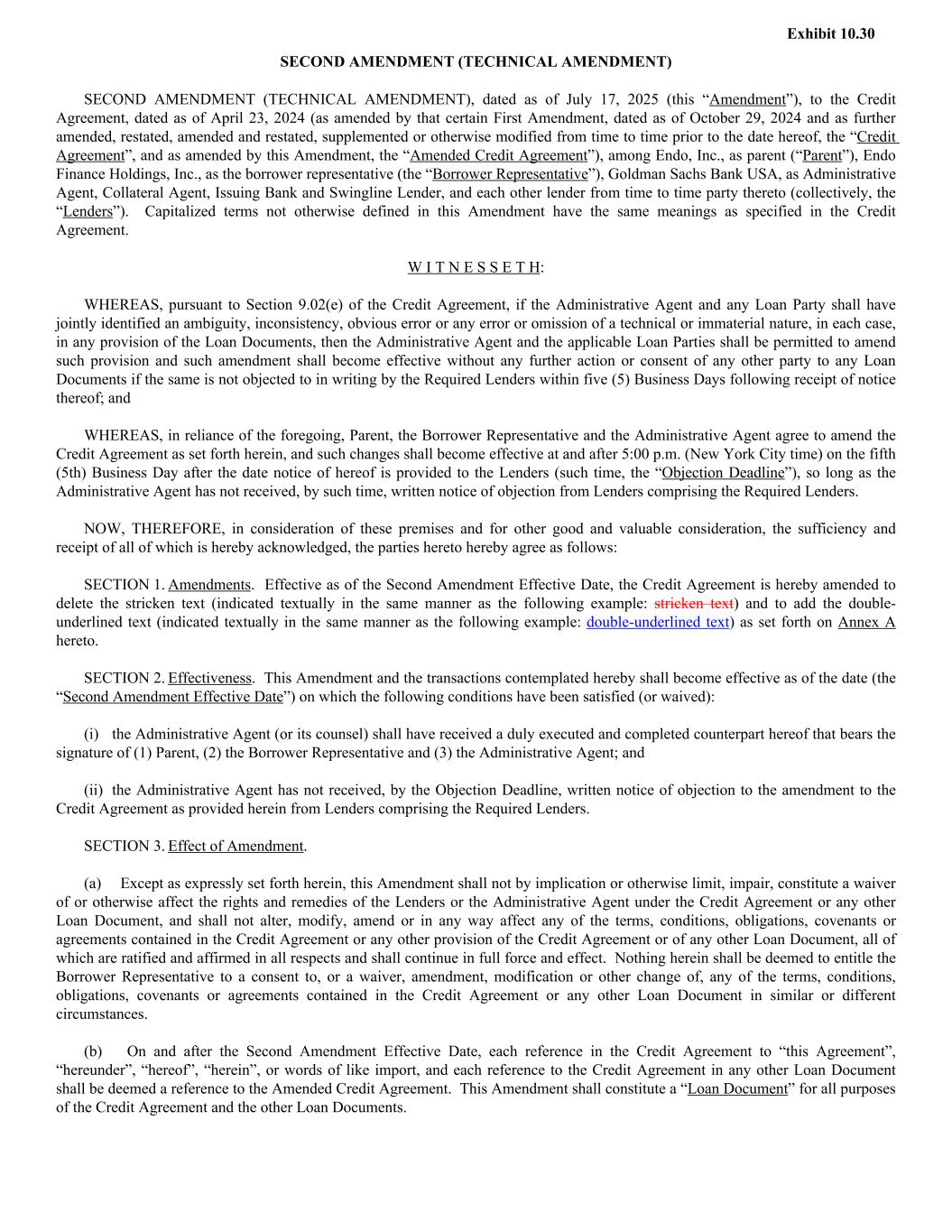 SECOND AMENDMENT (TECHNICAL AMENDMENT) SECOND AMENDMENT (TECHNICAL AMENDMENT), dated as of July 17, 2025 (this “Amendment”), to the Credit Agreement, dated as of April 23, 2024 (as amended by that certain First Amendment, dated as of October 29, 2024 and as further amended, restated, amended and restated, supplemented or otherwise modified from time to time prior to the date hereof, the “Credit Agreement”, and as amended by this Amendment, the “Amended Credit Agreement”), among Endo, Inc., as parent (“Parent”), Endo Finance Holdings, Inc., as the borrower representative (the “Borrower Representative”), Goldman Sachs Bank USA, as Administrative Agent, Collateral Agent, Issuing Bank and Swingline Lender, and each other lender from time to time party thereto (collectively, the “Lenders”). Capitalized terms not otherwise defined in this Amendment have the same meanings as specified in the Credit Agreement. W I T N E S S E T H: WHEREAS, pursuant to Section 9.02(e) of the Credit Agreement, if the Administrative Agent and any Loan Party shall have jointly identified an ambiguity, inconsistency, obvious error or any error or omission of a technical or immaterial nature, in each case, in any provision of the Loan Documents, then the Administrative Agent and the applicable Loan Parties shall be permitted to amend such provision and such amendment shall become effective without any further action or consent of any other party to any Loan Documents if the same is not objected to in writing by the Required Lenders within five (5) Business Days following receipt of notice thereof; and WHEREAS, in reliance of the foregoing, Parent, the Borrower Representative and the Administrative Agent agree to amend the Credit Agreement as set forth herein, and such changes shall become effective at and after 5:00 p.m. (New York City time) on the fifth (5th) Business Day after the date notice of hereof is provided to the Lenders (such time, the “Objection Deadline”), so long as the Administrative Agent has not received, by such time, written notice of objection from Lenders comprising the Required Lenders. NOW, THEREFORE, in consideration of these premises and for other good and valuable consideration, the sufficiency and receipt of all of which is hereby acknowledged, the parties hereto hereby agree as follows: SECTION 1. Amendments. Effective as of the Second Amendment Effective Date, the Credit Agreement is hereby amended to delete the stricken text (indicated textually in the same manner as the following example: stricken text) and to add the double- underlined text (indicated textually in the same manner as the following example: double-underlined text) as set forth on Annex A hereto. SECTION 2. Effectiveness. This Amendment and the transactions contemplated hereby shall become effective as of the date (the “Second Amendment Effective Date”) on which the following conditions have been satisfied (or waived): (i) the Administrative Agent (or its counsel) shall have received a duly executed and completed counterpart hereof that bears the signature of (1) Parent, (2) the Borrower Representative and (3) the Administrative Agent; and (ii) the Administrative Agent has not received, by the Objection Deadline, written notice of objection to the amendment to the Credit Agreement as provided herein from Lenders comprising the Required Lenders. SECTION 3. Effect of Amendment. (a) Except as expressly set forth herein, this Amendment shall not by implication or otherwise limit, impair, constitute a waiver of or otherwise affect the rights and remedies of the Lenders or the Administrative Agent under the Credit Agreement or any other Loan Document, and shall not alter, modify, amend or in any way affect any of the terms, conditions, obligations, covenants or agreements contained in the Credit Agreement or any other provision of the Credit Agreement or of any other Loan Document, all of which are ratified and affirmed in all respects and shall continue in full force and effect. Nothing herein shall be deemed to entitle the Borrower Representative to a consent to, or a waiver, amendment, modification or other change of, any of the terms, conditions, obligations, covenants or agreements contained in the Credit Agreement or any other Loan Document in similar or different circumstances. (b) On and after the Second Amendment Effective Date, each reference in the Credit Agreement to “this Agreement”, “hereunder”, “hereof”, “herein”, or words of like import, and each reference to the Credit Agreement in any other Loan Document shall be deemed a reference to the Amended Credit Agreement. This Amendment shall constitute a “Loan Document” for all purposes of the Credit Agreement and the other Loan Documents. Exhibit 10.30
