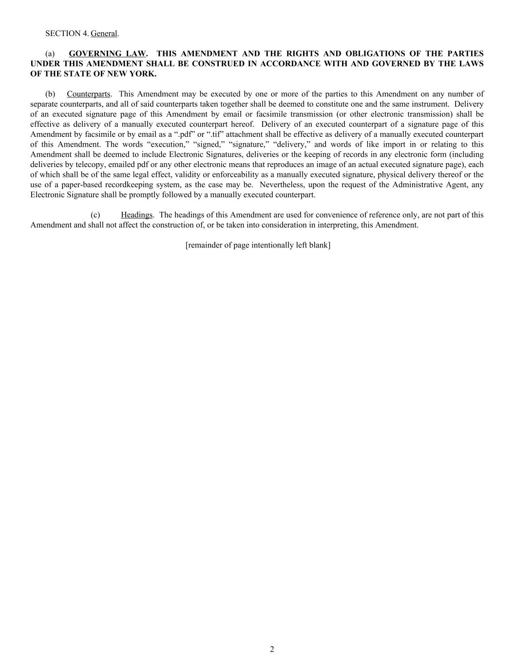 SECTION 4. General. (a) GOVERNING LAW. THIS AMENDMENT AND THE RIGHTS AND OBLIGATIONS OF THE PARTIES UNDER THIS AMENDMENT SHALL BE CONSTRUED IN ACCORDANCE WITH AND GOVERNED BY THE LAWS OF THE STATE OF NEW YORK. (b) Counterparts. This Amendment may be executed by one or more of the parties to this Amendment on any number of separate counterparts, and all of said counterparts taken together shall be deemed to constitute one and the same instrument. Delivery of an executed signature page of this Amendment by email or facsimile transmission (or other electronic transmission) shall be effective as delivery of a manually executed counterpart hereof. Delivery of an executed counterpart of a signature page of this Amendment by facsimile or by email as a “.pdf” or “.tif” attachment shall be effective as delivery of a manually executed counterpart of this Amendment. The words “execution,” “signed,” “signature,” “delivery,” and words of like import in or relating to this Amendment shall be deemed to include Electronic Signatures, deliveries or the keeping of records in any electronic form (including deliveries by telecopy, emailed pdf or any other electronic means that reproduces an image of an actual executed signature page), each of which shall be of the same legal effect, validity or enforceability as a manually executed signature, physical delivery thereof or the use of a paper-based recordkeeping system, as the case may be. Nevertheless, upon the request of the Administrative Agent, any Electronic Signature shall be promptly followed by a manually executed counterpart. (c) Headings. The headings of this Amendment are used for convenience of reference only, are not part of this Amendment and shall not affect the construction of, or be taken into consideration in interpreting, this Amendment. [remainder of page intentionally left blank] 2