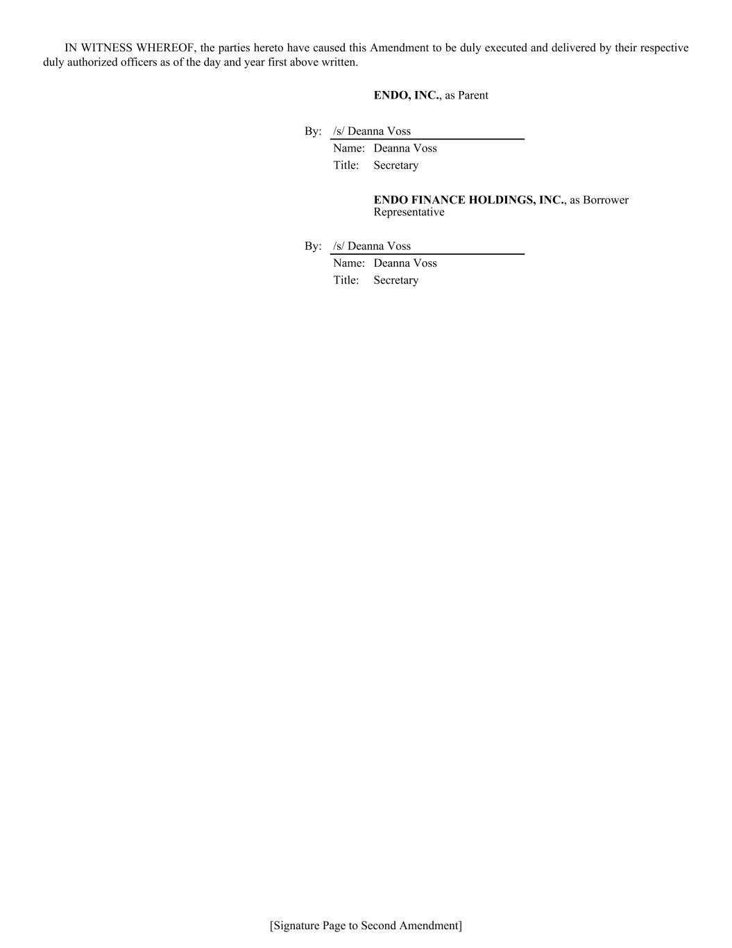 IN WITNESS WHEREOF, the parties hereto have caused this Amendment to be duly executed and delivered by their respective duly authorized officers as of the day and year first above written. ENDO, INC., as Parent By: /s/ Deanna Voss Name: Deanna Voss Title: Secretary ENDO FINANCE HOLDINGS, INC., as Borrower Representative By: /s/ Deanna Voss Name: Deanna Voss Title: Secretary [Signature Page to Second Amendment]