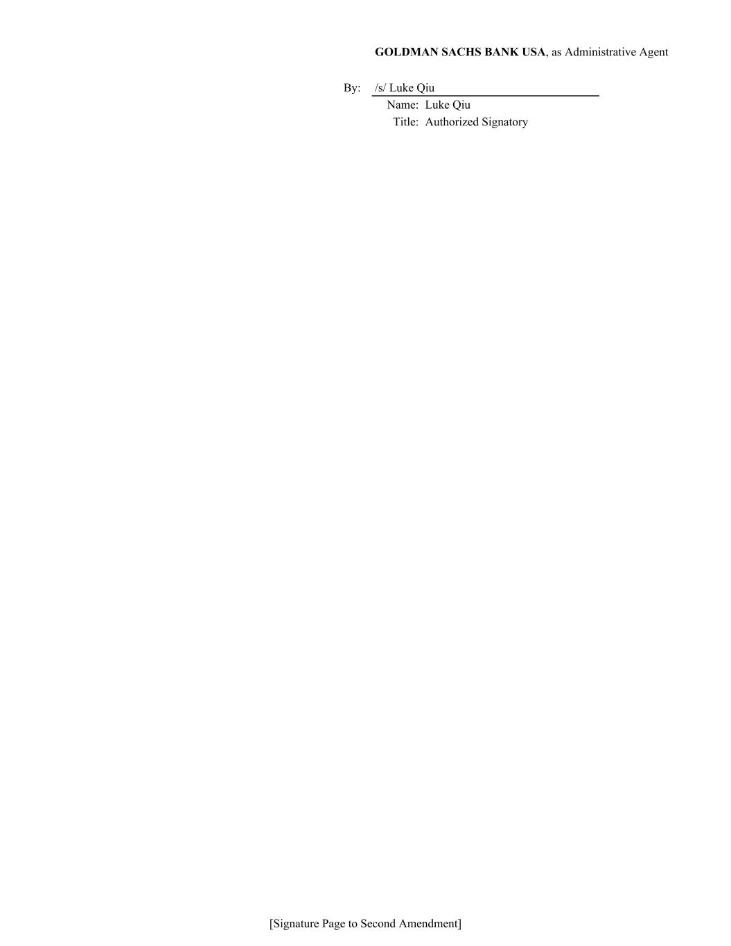GOLDMAN SACHS BANK USA, as Administrative Agent By: /s/ Luke Qiu Name: Luke Qiu Title: Authorized Signatory [Signature Page to Second Amendment]