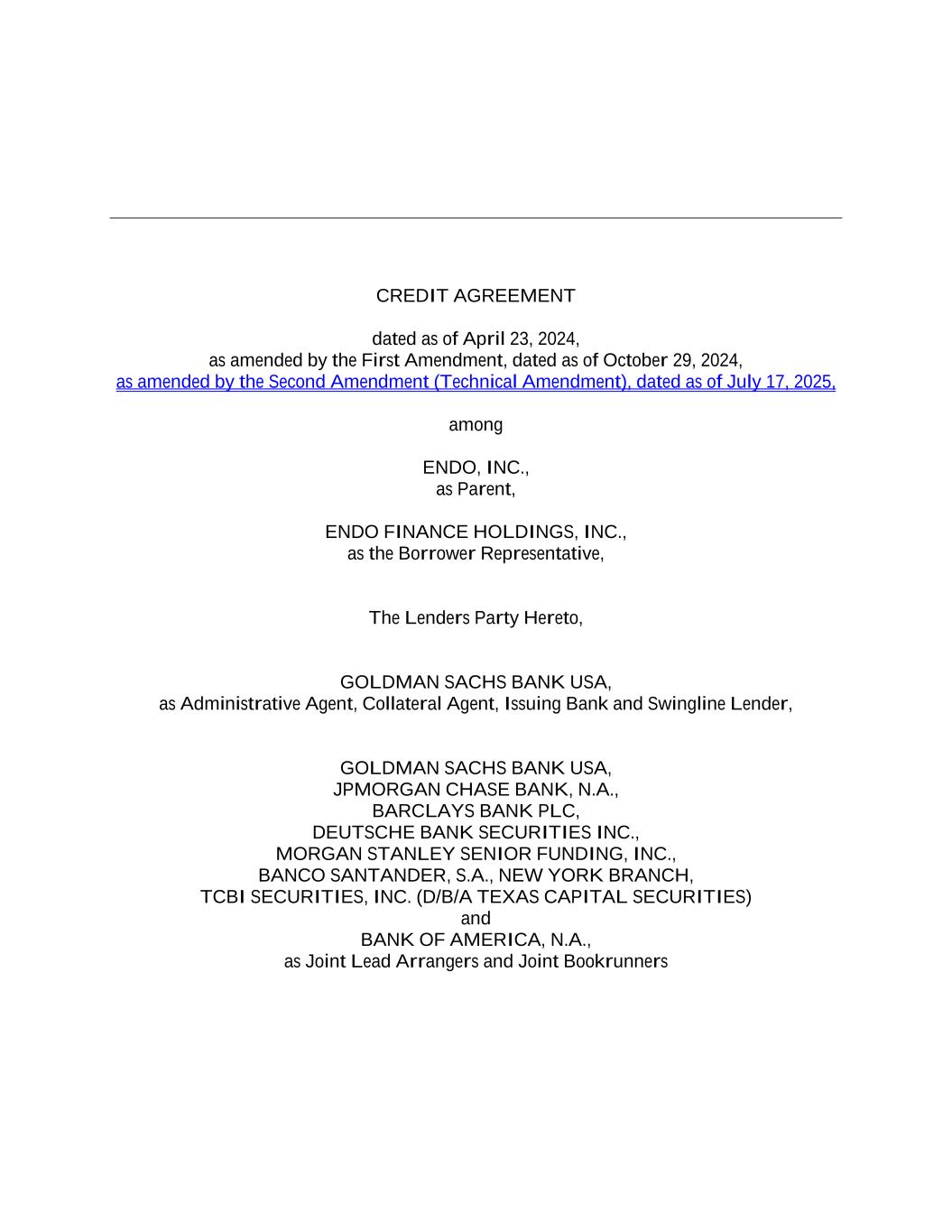 CREDIT AGREEMENT dated as of April 23, 2024, as amended by the First Amendment, dated as of October 29, 2024, as amended by the Second Amendment (Technical Amendment), dated as of July 17, 2025, among ENDO, INC., as Parent, ENDO FINANCE HOLDINGS, INC., as the Borrower Representative, The Lenders Party Hereto, GOLDMAN SACHS BANK USA, as Administrative Agent, Collateral Agent, Issuing Bank and Swingline Lender, GOLDMAN SACHS BANK USA, JPMORGAN CHASE BANK, N.A., BARCLAYS BANK PLC, DEUTSCHE BANK SECURITIES INC., MORGAN STANLEY SENIOR FUNDING, INC., BANCO SANTANDER, S.A., NEW YORK BRANCH, TCBI SECURITIES, INC. (D/B/A TEXAS CAPITAL SECURITIES) and BANK OF AMERICA, N.A., as Joint Lead Arrangers and Joint Bookrunners