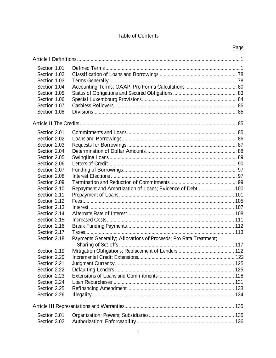 i Table of Contents Page Article I Definitions ........................................................................................................................ 1 Section 1.01 Defined Terms ................................................................................................... 1 Section 1.02 Classification of Loans and Borrowings ......................................................... 78 Section 1.03 Terms Generally .............................................................................................. 78 Section 1.04 Accounting Terms; GAAP; Pro Forma Calculations ...................................... 80 Section 1.05 Status of Obligations and Secured Obligations ............................................... 83 Section 1.06 Special Luxembourg Provisions ...................................................................... 84 Section 1.07 Cashless Rollovers ........................................................................................... 85 Section 1.08 Divisions .......................................................................................................... 85 Article II The Credits .................................................................................................................... 85 Section 2.01 Commitments and Loans ................................................................................. 85 Section 2.02 Loans and Borrowings ..................................................................................... 86 Section 2.03 Requests for Borrowings ................................................................................. 87 Section 2.04 Determination of Dollar Amounts ................................................................... 88 Section 2.05 Swingline Loans .............................................................................................. 89 Section 2.06 Letters of Credit ............................................................................................... 90 Section 2.07 Funding of Borrowings .................................................................................... 97 Section 2.08 Interest Elections ............................................................................................. 97 Section 2.09 Termination and Reduction of Commitments ................................................. 99 Section 2.10 Repayment and Amortization of Loans; Evidence of Debt ........................... 100 Section 2.11 Prepayment of Loans ..................................................................................... 101 Section 2.12 Fees ................................................................................................................ 105 Section 2.13 Interest ........................................................................................................... 107 Section 2.14 Alternate Rate of Interest ............................................................................... 108 Section 2.15 Increased Costs .............................................................................................. 111 Section 2.16 Break Funding Payments ............................................................................... 112 Section 2.17 Taxes .............................................................................................................. 113 Section 2.18 Payments Generally; Allocations of Proceeds; Pro Rata Treatment; Sharing of Set-offs ..................................................................................... 117 Section 2.19 Mitigation Obligations; Replacement of Lenders ......................................... 122 Section 2.20 Incremental Credit Extensions....................................................................... 122 Section 2.21 Judgment Currency ........................................................................................ 125 Section 2.22 Defaulting Lenders ........................................................................................ 125 Section 2.23 Extensions of Loans and Commitments ........................................................ 128 Section 2.24 Loan Repurchases .......................................................................................... 131 Section 2.25 Refinancing Amendment ............................................................................... 133 Section 2.26 Illegality ......................................................................................................... 134 Article III Representations and Warranties ................................................................................. 135 Section 3.01 Organization; Powers; Subsidiaries ............................................................... 135 Section 3.02 Authorization; Enforceability ........................................................................ 136