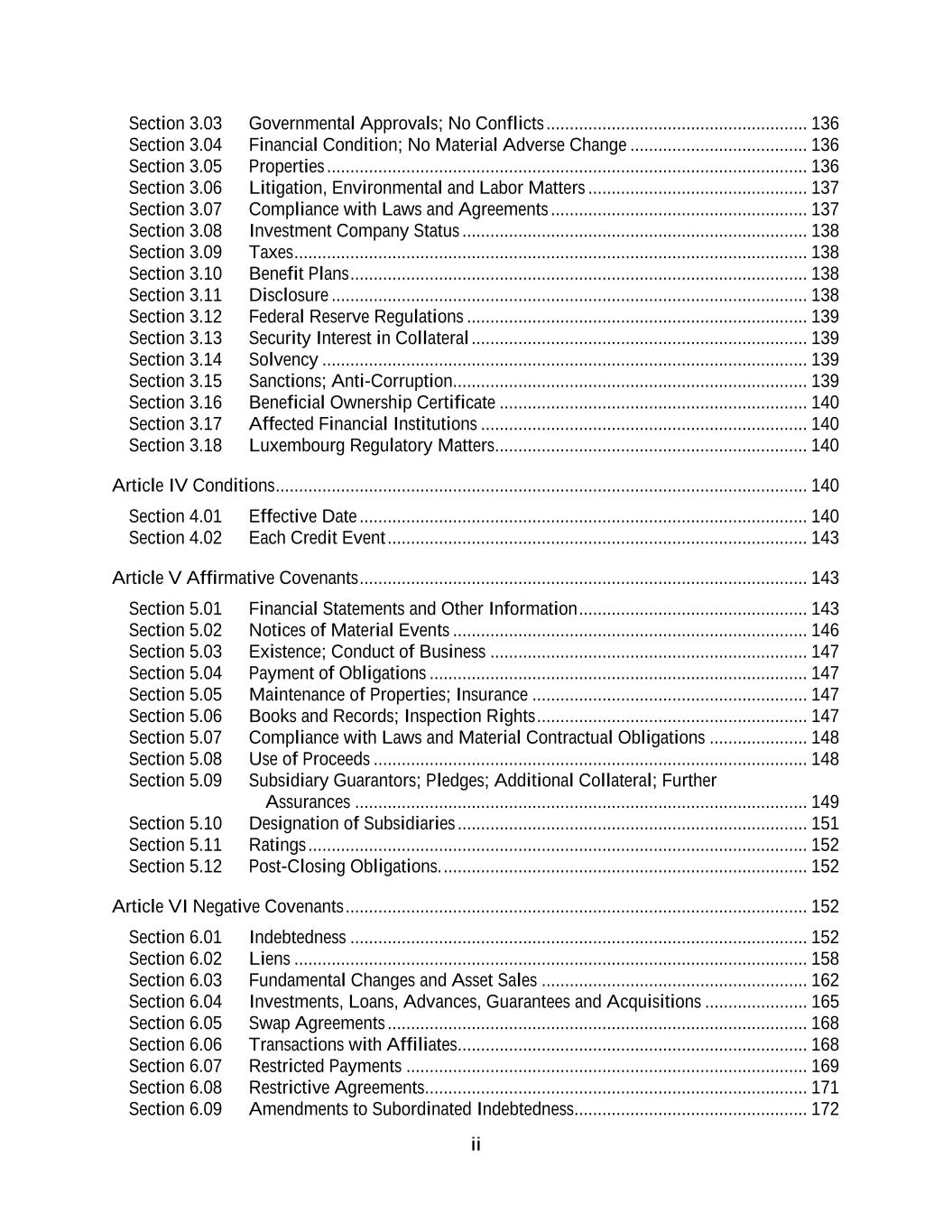 ii Section 3.03 Governmental Approvals; No Conflicts ........................................................ 136 Section 3.04 Financial Condition; No Material Adverse Change ...................................... 136 Section 3.05 Properties ....................................................................................................... 136 Section 3.06 Litigation, Environmental and Labor Matters ............................................... 137 Section 3.07 Compliance with Laws and Agreements ....................................................... 137 Section 3.08 Investment Company Status .......................................................................... 138 Section 3.09 Taxes .............................................................................................................. 138 Section 3.10 Benefit Plans .................................................................................................. 138 Section 3.11 Disclosure ...................................................................................................... 138 Section 3.12 Federal Reserve Regulations ......................................................................... 139 Section 3.13 Security Interest in Collateral ........................................................................ 139 Section 3.14 Solvency ........................................................................................................ 139 Section 3.15 Sanctions; Anti-Corruption............................................................................ 139 Section 3.16 Beneficial Ownership Certificate .................................................................. 140 Section 3.17 Affected Financial Institutions ...................................................................... 140 Section 3.18 Luxembourg Regulatory Matters ................................................................... 140 Article IV Conditions .................................................................................................................. 140 Section 4.01 Effective Date ................................................................................................ 140 Section 4.02 Each Credit Event .......................................................................................... 143 Article V Affirmative Covenants ................................................................................................ 143 Section 5.01 Financial Statements and Other Information ................................................. 143 Section 5.02 Notices of Material Events ............................................................................ 146 Section 5.03 Existence; Conduct of Business .................................................................... 147 Section 5.04 Payment of Obligations ................................................................................. 147 Section 5.05 Maintenance of Properties; Insurance ........................................................... 147 Section 5.06 Books and Records; Inspection Rights .......................................................... 147 Section 5.07 Compliance with Laws and Material Contractual Obligations ..................... 148 Section 5.08 Use of Proceeds ............................................................................................. 148 Section 5.09 Subsidiary Guarantors; Pledges; Additional Collateral; Further Assurances ................................................................................................. 149 Section 5.10 Designation of Subsidiaries ........................................................................... 151 Section 5.11 Ratings ........................................................................................................... 152 Section 5.12 Post-Closing Obligations. .............................................................................. 152 Article VI Negative Covenants ................................................................................................... 152 Section 6.01 Indebtedness .................................................................................................. 152 Section 6.02 Liens .............................................................................................................. 158 Section 6.03 Fundamental Changes and Asset Sales ......................................................... 162 Section 6.04 Investments, Loans, Advances, Guarantees and Acquisitions ...................... 165 Section 6.05 Swap Agreements .......................................................................................... 168 Section 6.06 Transactions with Affiliates ........................................................................... 168 Section 6.07 Restricted Payments ...................................................................................... 169 Section 6.08 Restrictive Agreements .................................................................................. 171 Section 6.09 Amendments to Subordinated Indebtedness.................................................. 172