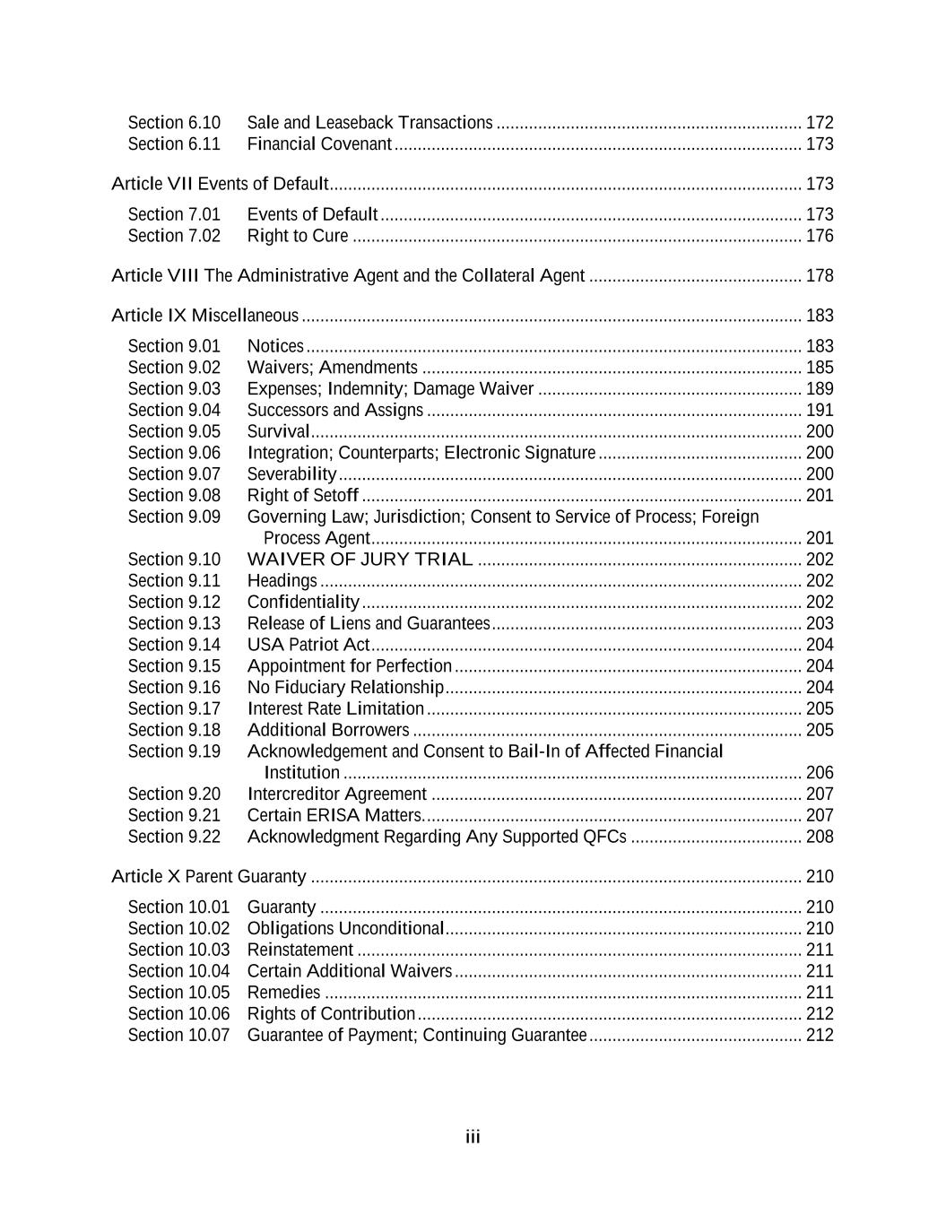 iii Section 6.10 Sale and Leaseback Transactions .................................................................. 172 Section 6.11 Financial Covenant ........................................................................................ 173 Article VII Events of Default ...................................................................................................... 173 Section 7.01 Events of Default ........................................................................................... 173 Section 7.02 Right to Cure ................................................................................................. 176 Article VIII The Administrative Agent and the Collateral Agent .............................................. 178 Article IX Miscellaneous ............................................................................................................ 183 Section 9.01 Notices ........................................................................................................... 183 Section 9.02 Waivers; Amendments .................................................................................. 185 Section 9.03 Expenses; Indemnity; Damage Waiver ......................................................... 189 Section 9.04 Successors and Assigns ................................................................................. 191 Section 9.05 Survival .......................................................................................................... 200 Section 9.06 Integration; Counterparts; Electronic Signature ............................................ 200 Section 9.07 Severability .................................................................................................... 200 Section 9.08 Right of Setoff ............................................................................................... 201 Section 9.09 Governing Law; Jurisdiction; Consent to Service of Process; Foreign Process Agent ............................................................................................. 201 Section 9.10 WAIVER OF JURY TRIAL ...................................................................... 202 Section 9.11 Headings ........................................................................................................ 202 Section 9.12 Confidentiality ............................................................................................... 202 Section 9.13 Release of Liens and Guarantees ................................................................... 203 Section 9.14 USA Patriot Act ............................................................................................. 204 Section 9.15 Appointment for Perfection ........................................................................... 204 Section 9.16 No Fiduciary Relationship ............................................................................. 204 Section 9.17 Interest Rate Limitation ................................................................................. 205 Section 9.18 Additional Borrowers .................................................................................... 205 Section 9.19 Acknowledgement and Consent to Bail-In of Affected Financial Institution ................................................................................................... 206 Section 9.20 Intercreditor Agreement ................................................................................ 207 Section 9.21 Certain ERISA Matters. ................................................................................. 207 Section 9.22 Acknowledgment Regarding Any Supported QFCs ..................................... 208 Article X Parent Guaranty .......................................................................................................... 210 Section 10.01 Guaranty ........................................................................................................ 210 Section 10.02 Obligations Unconditional ............................................................................. 210 Section 10.03 Reinstatement ................................................................................................ 211 Section 10.04 Certain Additional Waivers ........................................................................... 211 Section 10.05 Remedies ....................................................................................................... 211 Section 10.06 Rights of Contribution ................................................................................... 212 Section 10.07 Guarantee of Payment; Continuing Guarantee .............................................. 212