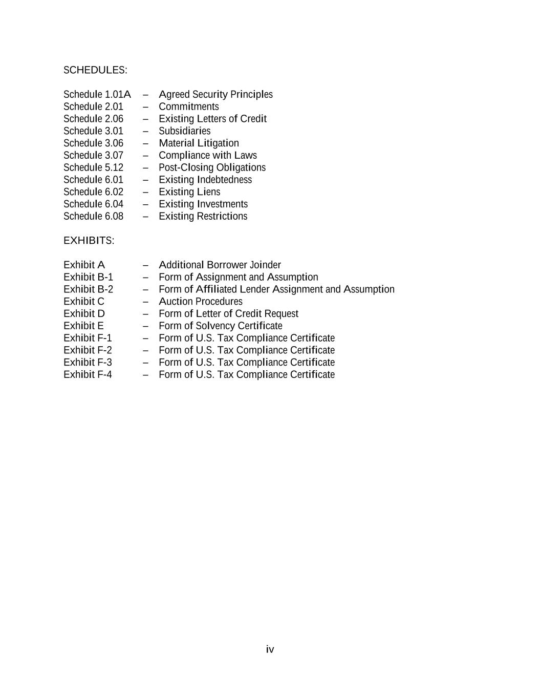 iv SCHEDULES: Schedule 1.01A – Agreed Security Principles Schedule 2.01 – Commitments Schedule 2.06 – Existing Letters of Credit Schedule 3.01 – Subsidiaries Schedule 3.06 – Material Litigation Schedule 3.07 – Compliance with Laws Schedule 5.12 – Post-Closing Obligations Schedule 6.01 – Existing Indebtedness Schedule 6.02 – Existing Liens Schedule 6.04 – Existing Investments Schedule 6.08 – Existing Restrictions EXHIBITS: Exhibit A – Additional Borrower Joinder Exhibit B-1 – Form of Assignment and Assumption Exhibit B-2 – Form of Affiliated Lender Assignment and Assumption Exhibit C – Auction Procedures Exhibit D – Form of Letter of Credit Request Exhibit E – Form of Solvency Certificate Exhibit F-1 – Form of U.S. Tax Compliance Certificate Exhibit F-2 – Form of U.S. Tax Compliance Certificate Exhibit F-3 – Form of U.S. Tax Compliance Certificate Exhibit F-4 – Form of U.S. Tax Compliance Certificate