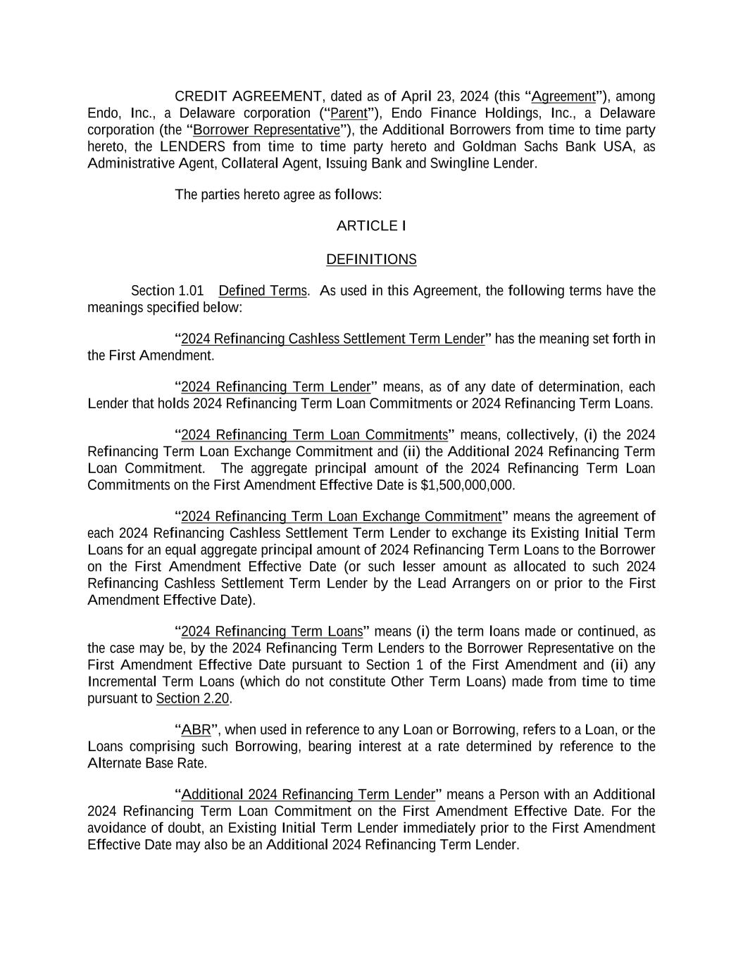 CREDIT AGREEMENT, dated as of April 23, 2024 (this “Agreement”), among Endo, Inc., a Delaware corporation (“Parent”), Endo Finance Holdings, Inc., a Delaware corporation (the “Borrower Representative”), the Additional Borrowers from time to time party hereto, the LENDERS from time to time party hereto and Goldman Sachs Bank USA, as Administrative Agent, Collateral Agent, Issuing Bank and Swingline Lender. The parties hereto agree as follows: ARTICLE I DEFINITIONS Section 1.01 Defined Terms. As used in this Agreement, the following terms have the meanings specified below: “2024 Refinancing Cashless Settlement Term Lender” has the meaning set forth in the First Amendment. “2024 Refinancing Term Lender” means, as of any date of determination, each Lender that holds 2024 Refinancing Term Loan Commitments or 2024 Refinancing Term Loans. “2024 Refinancing Term Loan Commitments” means, collectively, (i) the 2024 Refinancing Term Loan Exchange Commitment and (ii) the Additional 2024 Refinancing Term Loan Commitment. The aggregate principal amount of the 2024 Refinancing Term Loan Commitments on the First Amendment Effective Date is $1,500,000,000. “2024 Refinancing Term Loan Exchange Commitment” means the agreement of each 2024 Refinancing Cashless Settlement Term Lender to exchange its Existing Initial Term Loans for an equal aggregate principal amount of 2024 Refinancing Term Loans to the Borrower on the First Amendment Effective Date (or such lesser amount as allocated to such 2024 Refinancing Cashless Settlement Term Lender by the Lead Arrangers on or prior to the First Amendment Effective Date). “2024 Refinancing Term Loans” means (i) the term loans made or continued, as the case may be, by the 2024 Refinancing Term Lenders to the Borrower Representative on the First Amendment Effective Date pursuant to Section 1 of the First Amendment and (ii) any Incremental Term Loans (which do not constitute Other Term Loans) made from time to time pursuant to Section 2.20. “ABR”, when used in reference to any Loan or Borrowing, refers to a Loan, or the Loans comprising such Borrowing, bearing interest at a rate determined by reference to the Alternate Base Rate. “Additional 2024 Refinancing Term Lender” means a Person with an Additional 2024 Refinancing Term Loan Commitment on the First Amendment Effective Date. For the avoidance of doubt, an Existing Initial Term Lender immediately prior to the First Amendment Effective Date may also be an Additional 2024 Refinancing Term Lender.