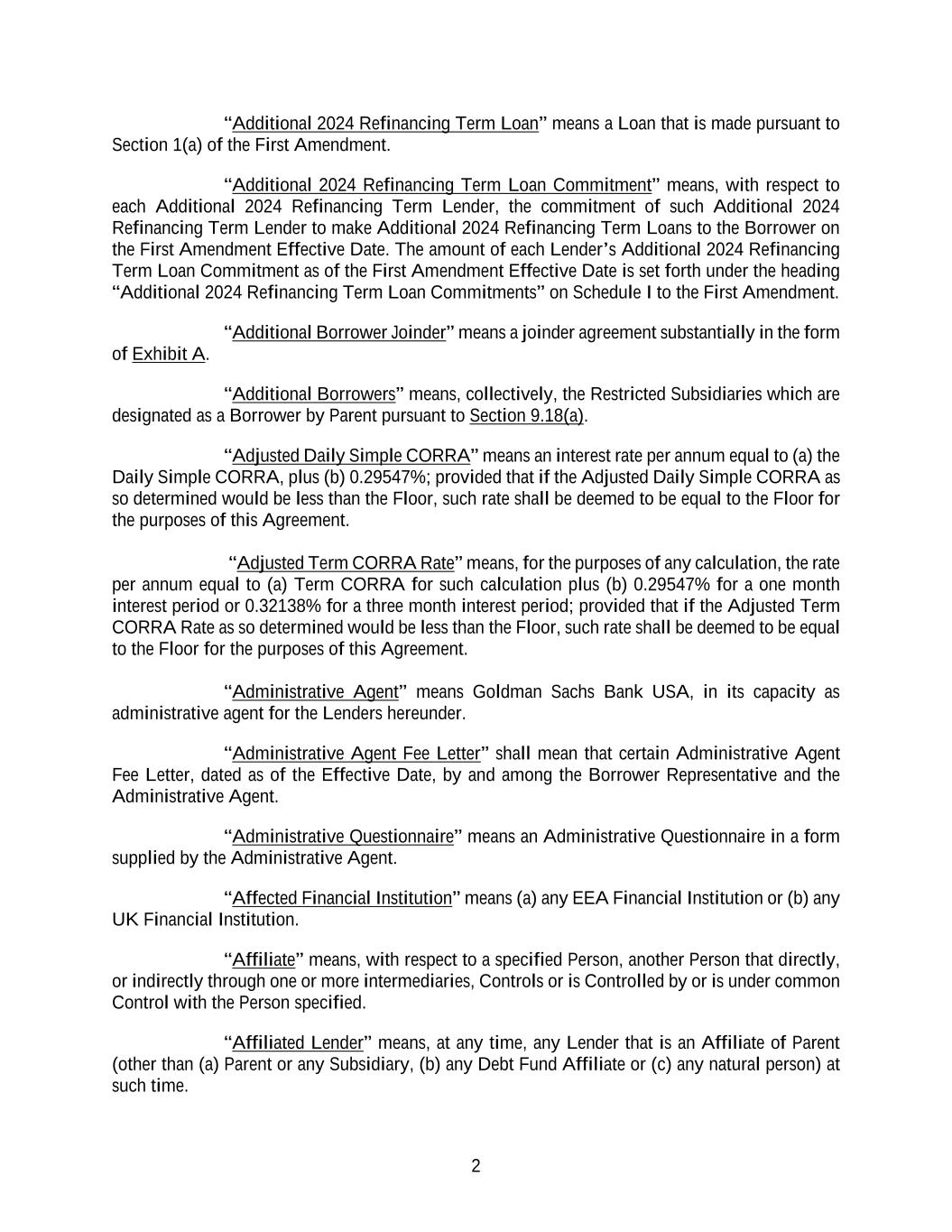 2 “Additional 2024 Refinancing Term Loan” means a Loan that is made pursuant to Section 1(a) of the First Amendment. “Additional 2024 Refinancing Term Loan Commitment” means, with respect to each Additional 2024 Refinancing Term Lender, the commitment of such Additional 2024 Refinancing Term Lender to make Additional 2024 Refinancing Term Loans to the Borrower on the First Amendment Effective Date. The amount of each Lender’s Additional 2024 Refinancing Term Loan Commitment as of the First Amendment Effective Date is set forth under the heading “Additional 2024 Refinancing Term Loan Commitments” on Schedule I to the First Amendment. “Additional Borrower Joinder” means a joinder agreement substantially in the form of Exhibit A. “Additional Borrowers” means, collectively, the Restricted Subsidiaries which are designated as a Borrower by Parent pursuant to Section 9.18(a). “Adjusted Daily Simple CORRA” means an interest rate per annum equal to (a) the Daily Simple CORRA, plus (b) 0.29547%; provided that if the Adjusted Daily Simple CORRA as so determined would be less than the Floor, such rate shall be deemed to be equal to the Floor for the purposes of this Agreement. “Adjusted Term CORRA Rate” means, for the purposes of any calculation, the rate per annum equal to (a) Term CORRA for such calculation plus (b) 0.29547% for a one month interest period or 0.32138% for a three month interest period; provided that if the Adjusted Term CORRA Rate as so determined would be less than the Floor, such rate shall be deemed to be equal to the Floor for the purposes of this Agreement. “Administrative Agent” means Goldman Sachs Bank USA, in its capacity as administrative agent for the Lenders hereunder. “Administrative Agent Fee Letter” shall mean that certain Administrative Agent Fee Letter, dated as of the Effective Date, by and among the Borrower Representative and the Administrative Agent. “Administrative Questionnaire” means an Administrative Questionnaire in a form supplied by the Administrative Agent. “Affected Financial Institution” means (a) any EEA Financial Institution or (b) any UK Financial Institution. “Affiliate” means, with respect to a specified Person, another Person that directly, or indirectly through one or more intermediaries, Controls or is Controlled by or is under common Control with the Person specified. “Affiliated Lender” means, at any time, any Lender that is an Affiliate of Parent (other than (a) Parent or any Subsidiary, (b) any Debt Fund Affiliate or (c) any natural person) at such time.