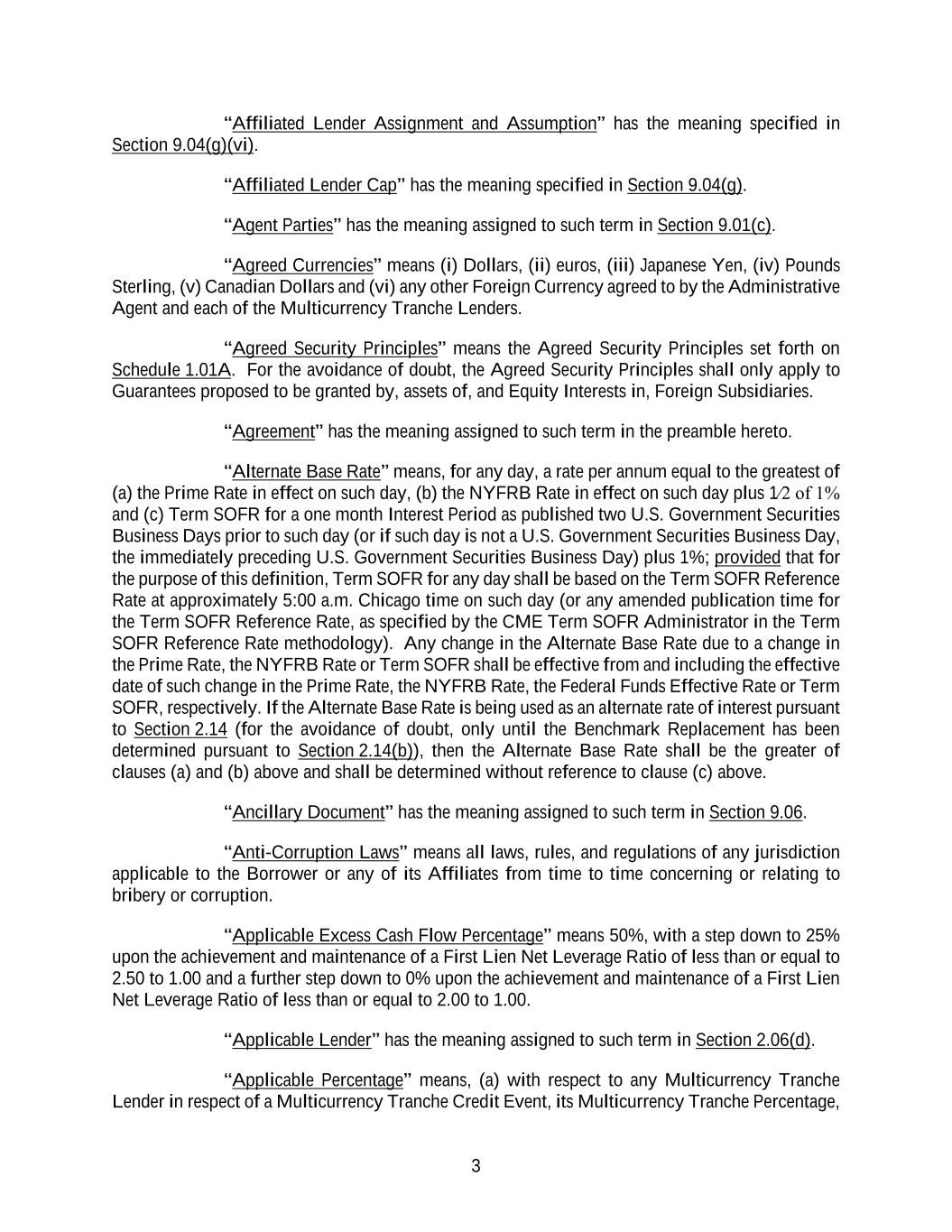3 “Affiliated Lender Assignment and Assumption” has the meaning specified in Section 9.04(g)(vi). “Affiliated Lender Cap” has the meaning specified in Section 9.04(g). “Agent Parties” has the meaning assigned to such term in Section 9.01(c). “Agreed Currencies” means (i) Dollars, (ii) euros, (iii) Japanese Yen, (iv) Pounds Sterling, (v) Canadian Dollars and (vi) any other Foreign Currency agreed to by the Administrative Agent and each of the Multicurrency Tranche Lenders. “Agreed Security Principles” means the Agreed Security Principles set forth on Schedule 1.01A. For the avoidance of doubt, the Agreed Security Principles shall only apply to Guarantees proposed to be granted by, assets of, and Equity Interests in, Foreign Subsidiaries. “Agreement” has the meaning assigned to such term in the preamble hereto. “Alternate Base Rate” means, for any day, a rate per annum equal to the greatest of (a) the Prime Rate in effect on such day, (b) the NYFRB Rate in effect on such day plus 1⁄2 of 1% and (c) Term SOFR for a one month Interest Period as published two U.S. Government Securities Business Days prior to such day (or if such day is not a U.S. Government Securities Business Day, the immediately preceding U.S. Government Securities Business Day) plus 1%; provided that for the purpose of this definition, Term SOFR for any day shall be based on the Term SOFR Reference Rate at approximately 5:00 a.m. Chicago time on such day (or any amended publication time for the Term SOFR Reference Rate, as specified by the CME Term SOFR Administrator in the Term SOFR Reference Rate methodology). Any change in the Alternate Base Rate due to a change in the Prime Rate, the NYFRB Rate or Term SOFR shall be effective from and including the effective date of such change in the Prime Rate, the NYFRB Rate, the Federal Funds Effective Rate or Term SOFR, respectively. If the Alternate Base Rate is being used as an alternate rate of interest pursuant to Section 2.14 (for the avoidance of doubt, only until the Benchmark Replacement has been determined pursuant to Section 2.14(b)), then the Alternate Base Rate shall be the greater of clauses (a) and (b) above and shall be determined without reference to clause (c) above. “Ancillary Document” has the meaning assigned to such term in Section 9.06. “Anti-Corruption Laws” means all laws, rules, and regulations of any jurisdiction applicable to the Borrower or any of its Affiliates from time to time concerning or relating to bribery or corruption. “Applicable Excess Cash Flow Percentage” means 50%, with a step down to 25% upon the achievement and maintenance of a First Lien Net Leverage Ratio of less than or equal to 2.50 to 1.00 and a further step down to 0% upon the achievement and maintenance of a First Lien Net Leverage Ratio of less than or equal to 2.00 to 1.00. “Applicable Lender” has the meaning assigned to such term in Section 2.06(d). “Applicable Percentage” means, (a) with respect to any Multicurrency Tranche Lender in respect of a Multicurrency Tranche Credit Event, its Multicurrency Tranche Percentage,