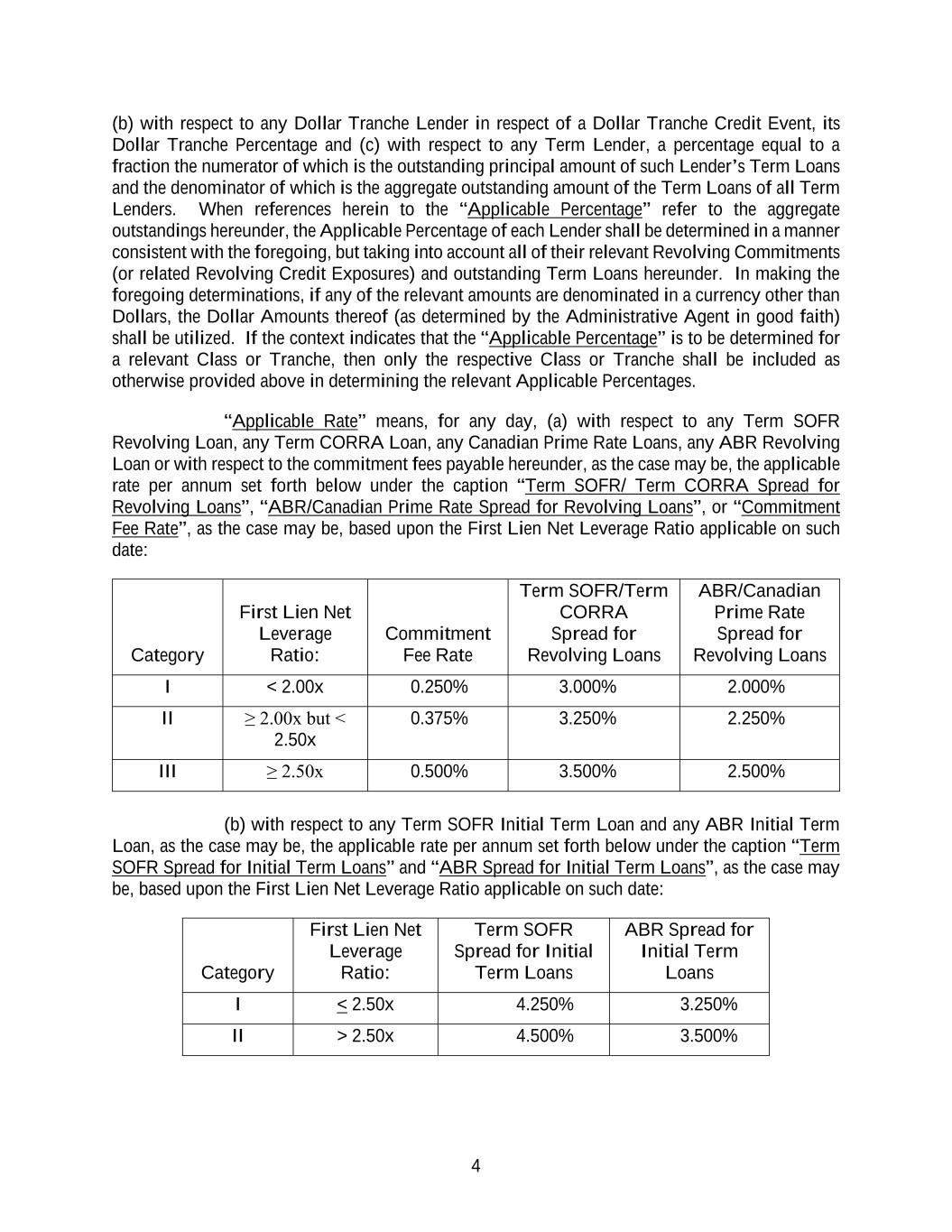 4 (b) with respect to any Dollar Tranche Lender in respect of a Dollar Tranche Credit Event, its Dollar Tranche Percentage and (c) with respect to any Term Lender, a percentage equal to a fraction the numerator of which is the outstanding principal amount of such Lender’s Term Loans and the denominator of which is the aggregate outstanding amount of the Term Loans of all Term Lenders. When references herein to the “Applicable Percentage” refer to the aggregate outstandings hereunder, the Applicable Percentage of each Lender shall be determined in a manner consistent with the foregoing, but taking into account all of their relevant Revolving Commitments (or related Revolving Credit Exposures) and outstanding Term Loans hereunder. In making the foregoing determinations, if any of the relevant amounts are denominated in a currency other than Dollars, the Dollar Amounts thereof (as determined by the Administrative Agent in good faith) shall be utilized. If the context indicates that the “Applicable Percentage” is to be determined for a relevant Class or Tranche, then only the respective Class or Tranche shall be included as otherwise provided above in determining the relevant Applicable Percentages. “Applicable Rate” means, for any day, (a) with respect to any Term SOFR Revolving Loan, any Term CORRA Loan, any Canadian Prime Rate Loans, any ABR Revolving Loan or with respect to the commitment fees payable hereunder, as the case may be, the applicable rate per annum set forth below under the caption “Term SOFR/ Term CORRA Spread for Revolving Loans”, “ABR/Canadian Prime Rate Spread for Revolving Loans”, or “Commitment Fee Rate”, as the case may be, based upon the First Lien Net Leverage Ratio applicable on such date: Category First Lien Net Leverage Ratio: Commitment Fee Rate Term SOFR/Term CORRA Spread for Revolving Loans ABR/Canadian Prime Rate Spread for Revolving Loans I < 2.00x 0.250% 3.000% 2.000% II ≥ 2.00x but < 2.50x 0.375% 3.250% 2.250% III ≥ 2.50x 0.500% 3.500% 2.500% (b) with respect to any Term SOFR Initial Term Loan and any ABR Initial Term Loan, as the case may be, the applicable rate per annum set forth below under the caption “Term SOFR Spread for Initial Term Loans” and “ABR Spread for Initial Term Loans”, as the case may be, based upon the First Lien Net Leverage Ratio applicable on such date: Category First Lien Net Leverage Ratio: Term SOFR Spread for Initial Term Loans ABR Spread for Initial Term Loans I < 2.50x 4.250% 3.250% II > 2.50x 4.500% 3.500%