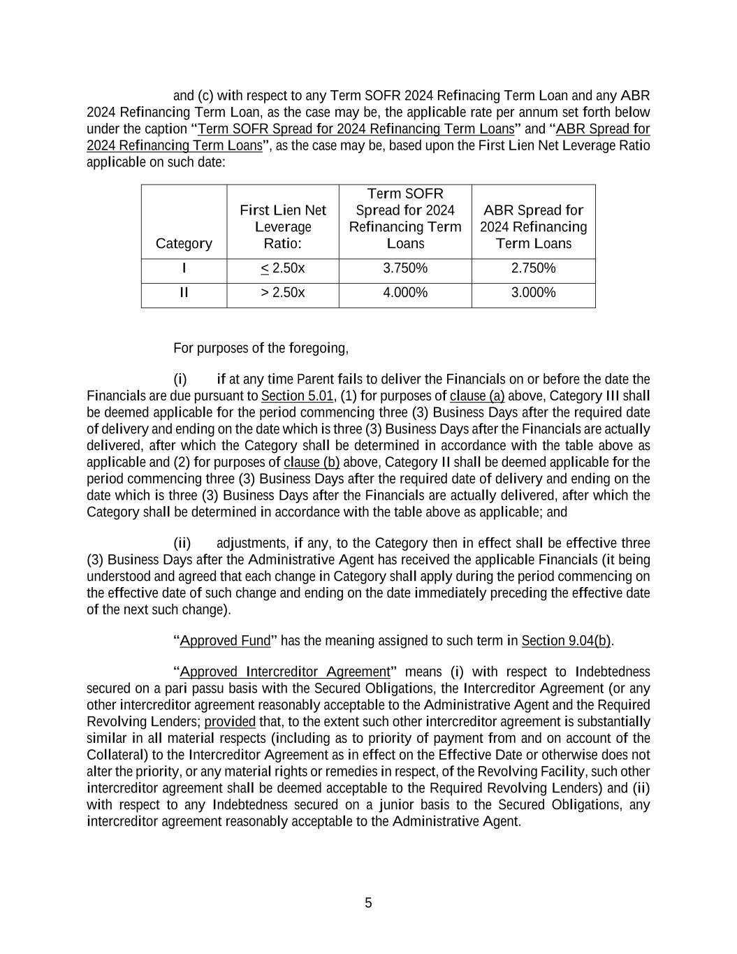 5 and (c) with respect to any Term SOFR 2024 Refinacing Term Loan and any ABR 2024 Refinancing Term Loan, as the case may be, the applicable rate per annum set forth below under the caption “Term SOFR Spread for 2024 Refinancing Term Loans” and “ABR Spread for 2024 Refinancing Term Loans”, as the case may be, based upon the First Lien Net Leverage Ratio applicable on such date: Category First Lien Net Leverage Ratio: Term SOFR Spread for 2024 Refinancing Term Loans ABR Spread for 2024 Refinancing Term Loans I < 2.50x 3.750% 2.750% II > 2.50x 4.000% 3.000% For purposes of the foregoing, (i) if at any time Parent fails to deliver the Financials on or before the date the Financials are due pursuant to Section 5.01, (1) for purposes of clause (a) above, Category III shall be deemed applicable for the period commencing three (3) Business Days after the required date of delivery and ending on the date which is three (3) Business Days after the Financials are actually delivered, after which the Category shall be determined in accordance with the table above as applicable and (2) for purposes of clause (b) above, Category II shall be deemed applicable for the period commencing three (3) Business Days after the required date of delivery and ending on the date which is three (3) Business Days after the Financials are actually delivered, after which the Category shall be determined in accordance with the table above as applicable; and (ii) adjustments, if any, to the Category then in effect shall be effective three (3) Business Days after the Administrative Agent has received the applicable Financials (it being understood and agreed that each change in Category shall apply during the period commencing on the effective date of such change and ending on the date immediately preceding the effective date of the next such change). “Approved Fund” has the meaning assigned to such term in Section 9.04(b). “Approved Intercreditor Agreement” means (i) with respect to Indebtedness secured on a pari passu basis with the Secured Obligations, the Intercreditor Agreement (or any other intercreditor agreement reasonably acceptable to the Administrative Agent and the Required Revolving Lenders; provided that, to the extent such other intercreditor agreement is substantially similar in all material respects (including as to priority of payment from and on account of the Collateral) to the Intercreditor Agreement as in effect on the Effective Date or otherwise does not alter the priority, or any material rights or remedies in respect, of the Revolving Facility, such other intercreditor agreement shall be deemed acceptable to the Required Revolving Lenders) and (ii) with respect to any Indebtedness secured on a junior basis to the Secured Obligations, any intercreditor agreement reasonably acceptable to the Administrative Agent.