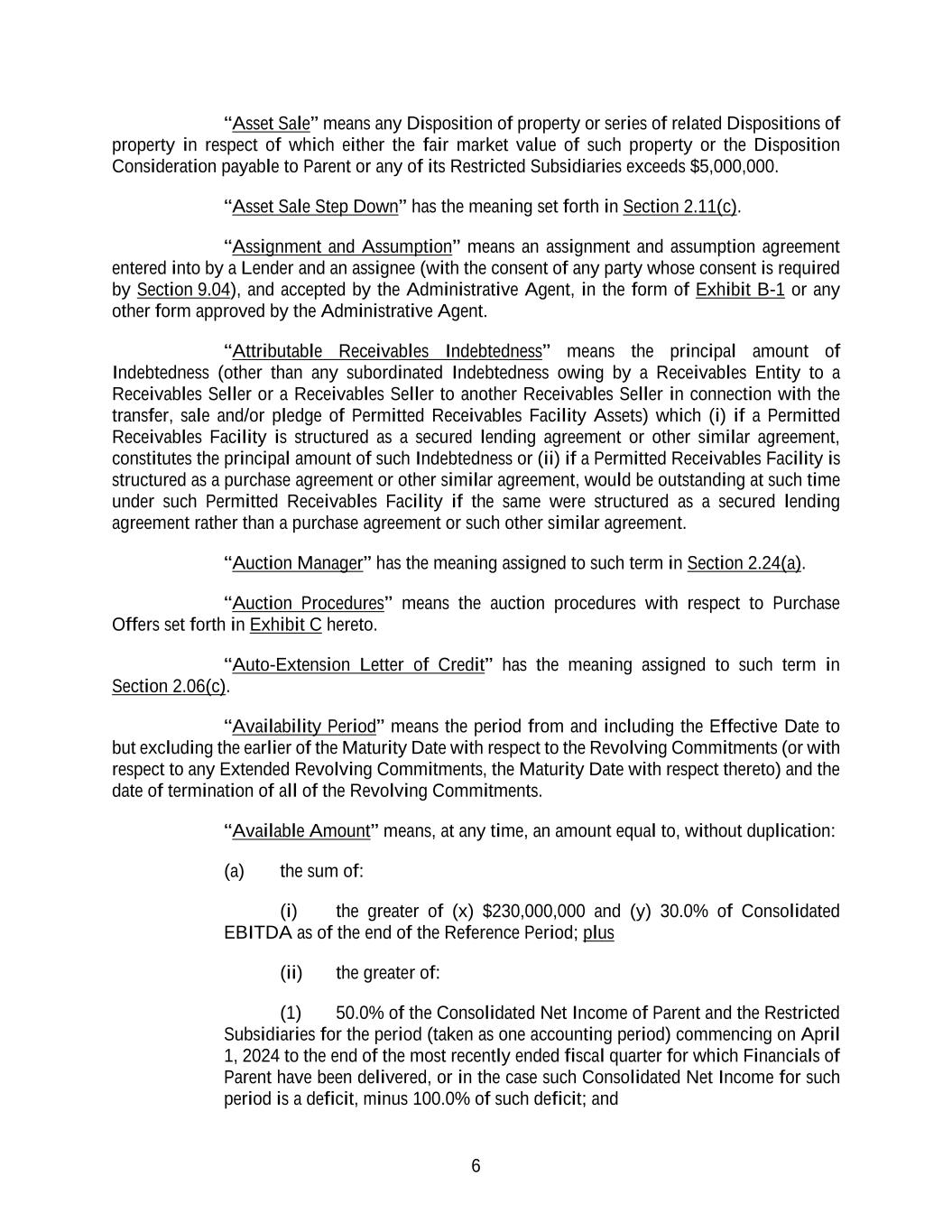 6 “Asset Sale” means any Disposition of property or series of related Dispositions of property in respect of which either the fair market value of such property or the Disposition Consideration payable to Parent or any of its Restricted Subsidiaries exceeds $5,000,000. “Asset Sale Step Down” has the meaning set forth in Section 2.11(c). “Assignment and Assumption” means an assignment and assumption agreement entered into by a Lender and an assignee (with the consent of any party whose consent is required by Section 9.04), and accepted by the Administrative Agent, in the form of Exhibit B-1 or any other form approved by the Administrative Agent. “Attributable Receivables Indebtedness” means the principal amount of Indebtedness (other than any subordinated Indebtedness owing by a Receivables Entity to a Receivables Seller or a Receivables Seller to another Receivables Seller in connection with the transfer, sale and/or pledge of Permitted Receivables Facility Assets) which (i) if a Permitted Receivables Facility is structured as a secured lending agreement or other similar agreement, constitutes the principal amount of such Indebtedness or (ii) if a Permitted Receivables Facility is structured as a purchase agreement or other similar agreement, would be outstanding at such time under such Permitted Receivables Facility if the same were structured as a secured lending agreement rather than a purchase agreement or such other similar agreement. “Auction Manager” has the meaning assigned to such term in Section 2.24(a). “Auction Procedures” means the auction procedures with respect to Purchase Offers set forth in Exhibit C hereto. “Auto-Extension Letter of Credit” has the meaning assigned to such term in Section 2.06(c). “Availability Period” means the period from and including the Effective Date to but excluding the earlier of the Maturity Date with respect to the Revolving Commitments (or with respect to any Extended Revolving Commitments, the Maturity Date with respect thereto) and the date of termination of all of the Revolving Commitments. “Available Amount” means, at any time, an amount equal to, without duplication: (a) the sum of: (i) the greater of (x) $230,000,000 and (y) 30.0% of Consolidated EBITDA as of the end of the Reference Period; plus (ii) the greater of: (1) 50.0% of the Consolidated Net Income of Parent and the Restricted Subsidiaries for the period (taken as one accounting period) commencing on April 1, 2024 to the end of the most recently ended fiscal quarter for which Financials of Parent have been delivered, or in the case such Consolidated Net Income for such period is a deficit, minus 100.0% of such deficit; and