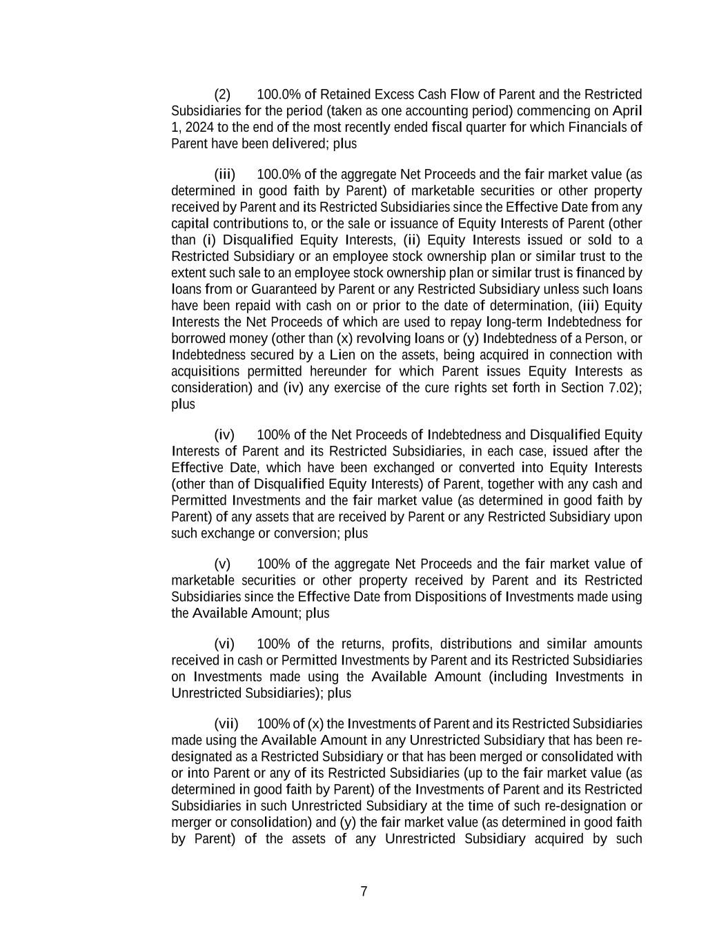 7 (2) 100.0% of Retained Excess Cash Flow of Parent and the Restricted Subsidiaries for the period (taken as one accounting period) commencing on April 1, 2024 to the end of the most recently ended fiscal quarter for which Financials of Parent have been delivered; plus (iii) 100.0% of the aggregate Net Proceeds and the fair market value (as determined in good faith by Parent) of marketable securities or other property received by Parent and its Restricted Subsidiaries since the Effective Date from any capital contributions to, or the sale or issuance of Equity Interests of Parent (other than (i) Disqualified Equity Interests, (ii) Equity Interests issued or sold to a Restricted Subsidiary or an employee stock ownership plan or similar trust to the extent such sale to an employee stock ownership plan or similar trust is financed by loans from or Guaranteed by Parent or any Restricted Subsidiary unless such loans have been repaid with cash on or prior to the date of determination, (iii) Equity Interests the Net Proceeds of which are used to repay long-term Indebtedness for borrowed money (other than (x) revolving loans or (y) Indebtedness of a Person, or Indebtedness secured by a Lien on the assets, being acquired in connection with acquisitions permitted hereunder for which Parent issues Equity Interests as consideration) and (iv) any exercise of the cure rights set forth in Section 7.02); plus (iv) 100% of the Net Proceeds of Indebtedness and Disqualified Equity Interests of Parent and its Restricted Subsidiaries, in each case, issued after the Effective Date, which have been exchanged or converted into Equity Interests (other than of Disqualified Equity Interests) of Parent, together with any cash and Permitted Investments and the fair market value (as determined in good faith by Parent) of any assets that are received by Parent or any Restricted Subsidiary upon such exchange or conversion; plus (v) 100% of the aggregate Net Proceeds and the fair market value of marketable securities or other property received by Parent and its Restricted Subsidiaries since the Effective Date from Dispositions of Investments made using the Available Amount; plus (vi) 100% of the returns, profits, distributions and similar amounts received in cash or Permitted Investments by Parent and its Restricted Subsidiaries on Investments made using the Available Amount (including Investments in Unrestricted Subsidiaries); plus (vii) 100% of (x) the Investments of Parent and its Restricted Subsidiaries made using the Available Amount in any Unrestricted Subsidiary that has been re- designated as a Restricted Subsidiary or that has been merged or consolidated with or into Parent or any of its Restricted Subsidiaries (up to the fair market value (as determined in good faith by Parent) of the Investments of Parent and its Restricted Subsidiaries in such Unrestricted Subsidiary at the time of such re-designation or merger or consolidation) and (y) the fair market value (as determined in good faith by Parent) of the assets of any Unrestricted Subsidiary acquired by such