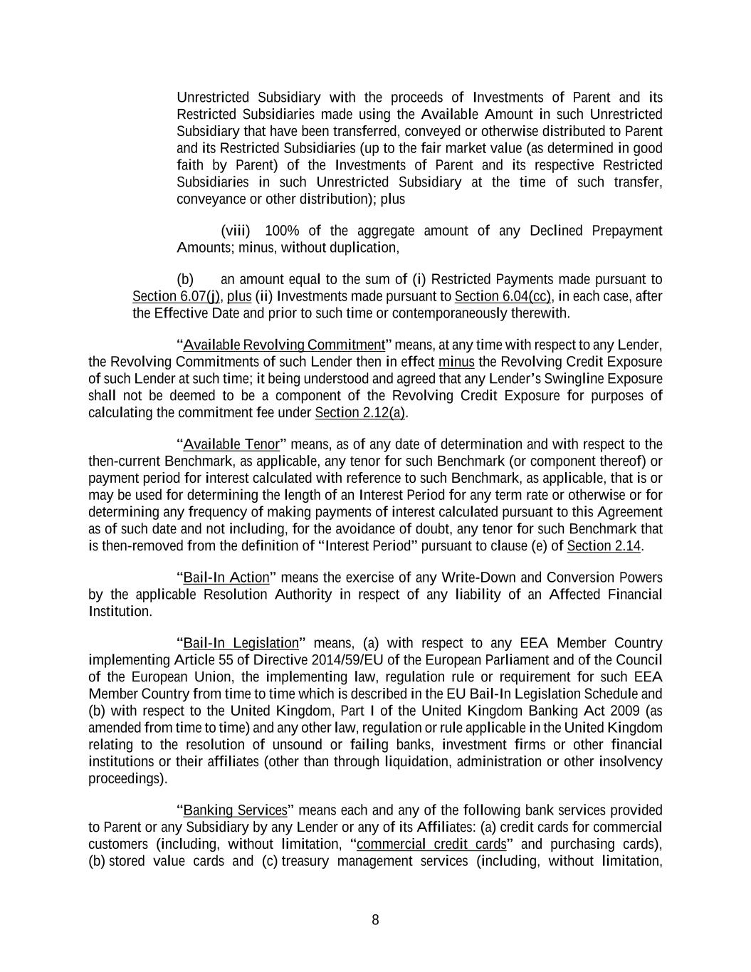 8 Unrestricted Subsidiary with the proceeds of Investments of Parent and its Restricted Subsidiaries made using the Available Amount in such Unrestricted Subsidiary that have been transferred, conveyed or otherwise distributed to Parent and its Restricted Subsidiaries (up to the fair market value (as determined in good faith by Parent) of the Investments of Parent and its respective Restricted Subsidiaries in such Unrestricted Subsidiary at the time of such transfer, conveyance or other distribution); plus (viii) 100% of the aggregate amount of any Declined Prepayment Amounts; minus, without duplication, (b) an amount equal to the sum of (i) Restricted Payments made pursuant to Section 6.07(j), plus (ii) Investments made pursuant to Section 6.04(cc), in each case, after the Effective Date and prior to such time or contemporaneously therewith. “Available Revolving Commitment” means, at any time with respect to any Lender, the Revolving Commitments of such Lender then in effect minus the Revolving Credit Exposure of such Lender at such time; it being understood and agreed that any Lender’s Swingline Exposure shall not be deemed to be a component of the Revolving Credit Exposure for purposes of calculating the commitment fee under Section 2.12(a). “Available Tenor” means, as of any date of determination and with respect to the then-current Benchmark, as applicable, any tenor for such Benchmark (or component thereof) or payment period for interest calculated with reference to such Benchmark, as applicable, that is or may be used for determining the length of an Interest Period for any term rate or otherwise or for determining any frequency of making payments of interest calculated pursuant to this Agreement as of such date and not including, for the avoidance of doubt, any tenor for such Benchmark that is then-removed from the definition of “Interest Period” pursuant to clause (e) of Section 2.14. “Bail-In Action” means the exercise of any Write-Down and Conversion Powers by the applicable Resolution Authority in respect of any liability of an Affected Financial Institution. “Bail-In Legislation” means, (a) with respect to any EEA Member Country implementing Article 55 of Directive 2014/59/EU of the European Parliament and of the Council of the European Union, the implementing law, regulation rule or requirement for such EEA Member Country from time to time which is described in the EU Bail-In Legislation Schedule and (b) with respect to the United Kingdom, Part I of the United Kingdom Banking Act 2009 (as amended from time to time) and any other law, regulation or rule applicable in the United Kingdom relating to the resolution of unsound or failing banks, investment firms or other financial institutions or their affiliates (other than through liquidation, administration or other insolvency proceedings). “Banking Services” means each and any of the following bank services provided to Parent or any Subsidiary by any Lender or any of its Affiliates: (a) credit cards for commercial customers (including, without limitation, “commercial credit cards” and purchasing cards), (b) stored value cards and (c) treasury management services (including, without limitation,