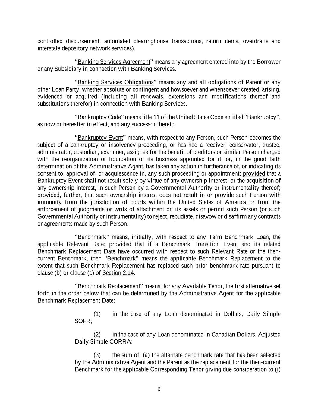 9 controlled disbursement, automated clearinghouse transactions, return items, overdrafts and interstate depository network services). “Banking Services Agreement” means any agreement entered into by the Borrower or any Subsidiary in connection with Banking Services. “Banking Services Obligations” means any and all obligations of Parent or any other Loan Party, whether absolute or contingent and howsoever and whensoever created, arising, evidenced or acquired (including all renewals, extensions and modifications thereof and substitutions therefor) in connection with Banking Services. “Bankruptcy Code” means title 11 of the United States Code entitled “Bankruptcy”, as now or hereafter in effect, and any successor thereto. “Bankruptcy Event” means, with respect to any Person, such Person becomes the subject of a bankruptcy or insolvency proceeding, or has had a receiver, conservator, trustee, administrator, custodian, examiner, assignee for the benefit of creditors or similar Person charged with the reorganization or liquidation of its business appointed for it, or, in the good faith determination of the Administrative Agent, has taken any action in furtherance of, or indicating its consent to, approval of, or acquiescence in, any such proceeding or appointment; provided that a Bankruptcy Event shall not result solely by virtue of any ownership interest, or the acquisition of any ownership interest, in such Person by a Governmental Authority or instrumentality thereof; provided, further, that such ownership interest does not result in or provide such Person with immunity from the jurisdiction of courts within the United States of America or from the enforcement of judgments or writs of attachment on its assets or permit such Person (or such Governmental Authority or instrumentality) to reject, repudiate, disavow or disaffirm any contracts or agreements made by such Person. “Benchmark” means, initially, with respect to any Term Benchmark Loan, the applicable Relevant Rate; provided that if a Benchmark Transition Event and its related Benchmark Replacement Date have occurred with respect to such Relevant Rate or the then- current Benchmark, then “Benchmark” means the applicable Benchmark Replacement to the extent that such Benchmark Replacement has replaced such prior benchmark rate pursuant to clause (b) or clause (c) of Section 2.14. “Benchmark Replacement” means, for any Available Tenor, the first alternative set forth in the order below that can be determined by the Administrative Agent for the applicable Benchmark Replacement Date: (1) in the case of any Loan denominated in Dollars, Daily Simple SOFR; (2) in the case of any Loan denominated in Canadian Dollars, Adjusted Daily Simple CORRA; (3) the sum of: (a) the alternate benchmark rate that has been selected by the Administrative Agent and the Parent as the replacement for the then-current Benchmark for the applicable Corresponding Tenor giving due consideration to (i)