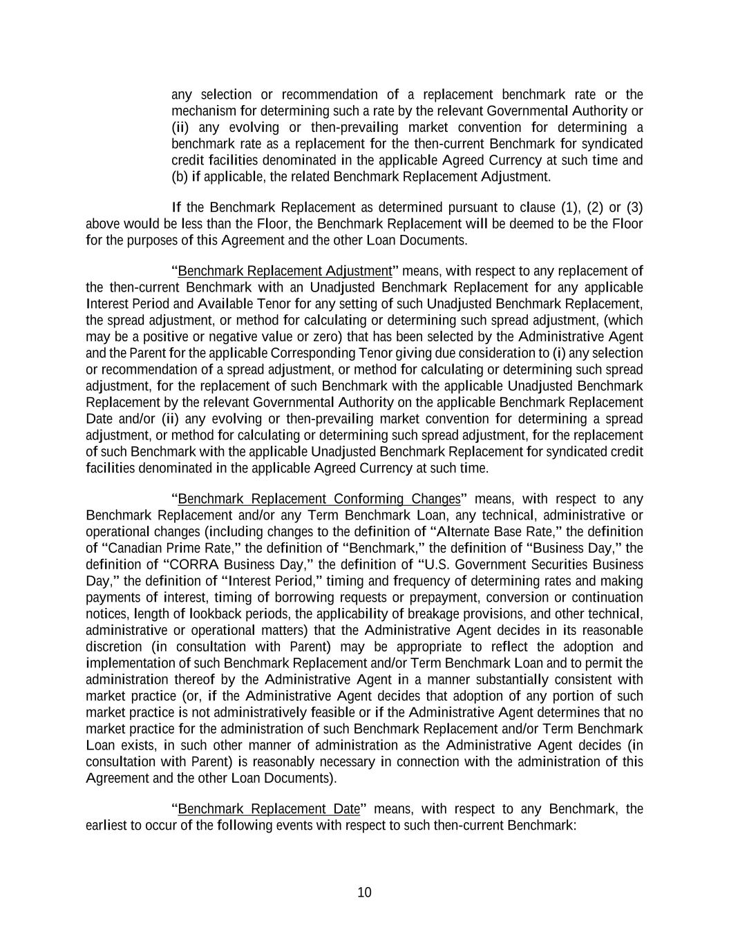 10 any selection or recommendation of a replacement benchmark rate or the mechanism for determining such a rate by the relevant Governmental Authority or (ii) any evolving or then-prevailing market convention for determining a benchmark rate as a replacement for the then-current Benchmark for syndicated credit facilities denominated in the applicable Agreed Currency at such time and (b) if applicable, the related Benchmark Replacement Adjustment. If the Benchmark Replacement as determined pursuant to clause (1), (2) or (3) above would be less than the Floor, the Benchmark Replacement will be deemed to be the Floor for the purposes of this Agreement and the other Loan Documents. “Benchmark Replacement Adjustment” means, with respect to any replacement of the then-current Benchmark with an Unadjusted Benchmark Replacement for any applicable Interest Period and Available Tenor for any setting of such Unadjusted Benchmark Replacement, the spread adjustment, or method for calculating or determining such spread adjustment, (which may be a positive or negative value or zero) that has been selected by the Administrative Agent and the Parent for the applicable Corresponding Tenor giving due consideration to (i) any selection or recommendation of a spread adjustment, or method for calculating or determining such spread adjustment, for the replacement of such Benchmark with the applicable Unadjusted Benchmark Replacement by the relevant Governmental Authority on the applicable Benchmark Replacement Date and/or (ii) any evolving or then-prevailing market convention for determining a spread adjustment, or method for calculating or determining such spread adjustment, for the replacement of such Benchmark with the applicable Unadjusted Benchmark Replacement for syndicated credit facilities denominated in the applicable Agreed Currency at such time. “Benchmark Replacement Conforming Changes” means, with respect to any Benchmark Replacement and/or any Term Benchmark Loan, any technical, administrative or operational changes (including changes to the definition of “Alternate Base Rate,” the definition of “Canadian Prime Rate,” the definition of “Benchmark,” the definition of “Business Day,” the definition of “CORRA Business Day,” the definition of “U.S. Government Securities Business Day,” the definition of “Interest Period,” timing and frequency of determining rates and making payments of interest, timing of borrowing requests or prepayment, conversion or continuation notices, length of lookback periods, the applicability of breakage provisions, and other technical, administrative or operational matters) that the Administrative Agent decides in its reasonable discretion (in consultation with Parent) may be appropriate to reflect the adoption and implementation of such Benchmark Replacement and/or Term Benchmark Loan and to permit the administration thereof by the Administrative Agent in a manner substantially consistent with market practice (or, if the Administrative Agent decides that adoption of any portion of such market practice is not administratively feasible or if the Administrative Agent determines that no market practice for the administration of such Benchmark Replacement and/or Term Benchmark Loan exists, in such other manner of administration as the Administrative Agent decides (in consultation with Parent) is reasonably necessary in connection with the administration of this Agreement and the other Loan Documents). “Benchmark Replacement Date” means, with respect to any Benchmark, the earliest to occur of the following events with respect to such then-current Benchmark: