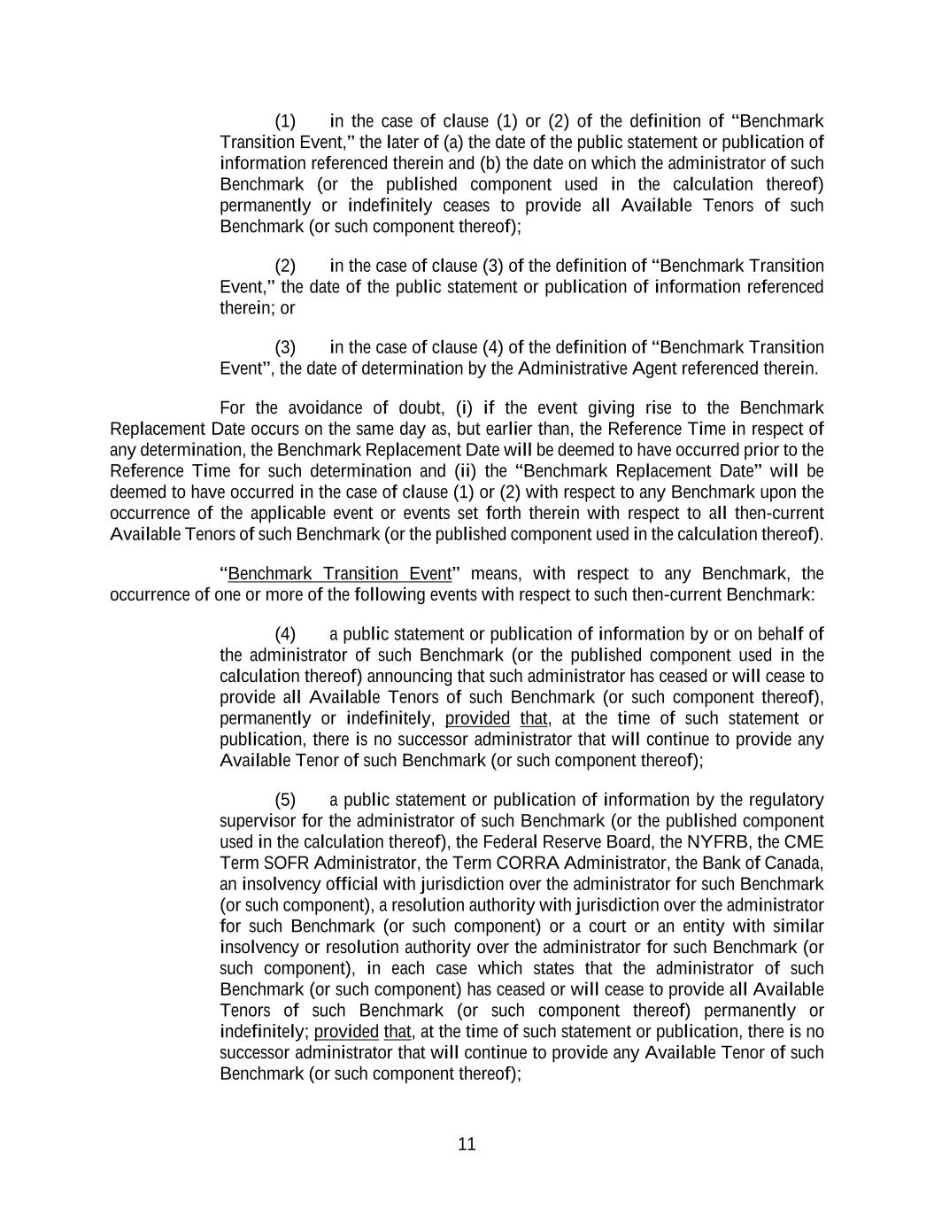 11 (1) in the case of clause (1) or (2) of the definition of “Benchmark Transition Event,” the later of (a) the date of the public statement or publication of information referenced therein and (b) the date on which the administrator of such Benchmark (or the published component used in the calculation thereof) permanently or indefinitely ceases to provide all Available Tenors of such Benchmark (or such component thereof); (2) in the case of clause (3) of the definition of “Benchmark Transition Event,” the date of the public statement or publication of information referenced therein; or (3) in the case of clause (4) of the definition of “Benchmark Transition Event”, the date of determination by the Administrative Agent referenced therein. For the avoidance of doubt, (i) if the event giving rise to the Benchmark Replacement Date occurs on the same day as, but earlier than, the Reference Time in respect of any determination, the Benchmark Replacement Date will be deemed to have occurred prior to the Reference Time for such determination and (ii) the “Benchmark Replacement Date” will be deemed to have occurred in the case of clause (1) or (2) with respect to any Benchmark upon the occurrence of the applicable event or events set forth therein with respect to all then-current Available Tenors of such Benchmark (or the published component used in the calculation thereof). “Benchmark Transition Event” means, with respect to any Benchmark, the occurrence of one or more of the following events with respect to such then-current Benchmark: (4) a public statement or publication of information by or on behalf of the administrator of such Benchmark (or the published component used in the calculation thereof) announcing that such administrator has ceased or will cease to provide all Available Tenors of such Benchmark (or such component thereof), permanently or indefinitely, provided that, at the time of such statement or publication, there is no successor administrator that will continue to provide any Available Tenor of such Benchmark (or such component thereof); (5) a public statement or publication of information by the regulatory supervisor for the administrator of such Benchmark (or the published component used in the calculation thereof), the Federal Reserve Board, the NYFRB, the CME Term SOFR Administrator, the Term CORRA Administrator, the Bank of Canada, an insolvency official with jurisdiction over the administrator for such Benchmark (or such component), a resolution authority with jurisdiction over the administrator for such Benchmark (or such component) or a court or an entity with similar insolvency or resolution authority over the administrator for such Benchmark (or such component), in each case which states that the administrator of such Benchmark (or such component) has ceased or will cease to provide all Available Tenors of such Benchmark (or such component thereof) permanently or indefinitely; provided that, at the time of such statement or publication, there is no successor administrator that will continue to provide any Available Tenor of such Benchmark (or such component thereof);