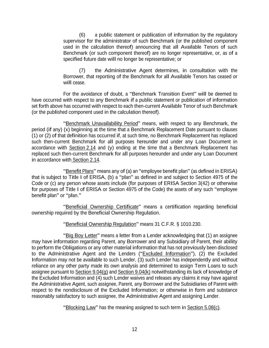 12 (6) a public statement or publication of information by the regulatory supervisor for the administrator of such Benchmark (or the published component used in the calculation thereof) announcing that all Available Tenors of such Benchmark (or such component thereof) are no longer representative, or, as of a specified future date will no longer be representative; or (7) the Administrative Agent determines, in consultation with the Borrower, that reporting of the Benchmark for all Available Tenors has ceased or will cease. For the avoidance of doubt, a “Benchmark Transition Event” will be deemed to have occurred with respect to any Benchmark if a public statement or publication of information set forth above has occurred with respect to each then-current Available Tenor of such Benchmark (or the published component used in the calculation thereof). “Benchmark Unavailability Period” means, with respect to any Benchmark, the period (if any) (x) beginning at the time that a Benchmark Replacement Date pursuant to clauses (1) or (2) of that definition has occurred if, at such time, no Benchmark Replacement has replaced such then-current Benchmark for all purposes hereunder and under any Loan Document in accordance with Section 2.14 and (y) ending at the time that a Benchmark Replacement has replaced such then-current Benchmark for all purposes hereunder and under any Loan Document in accordance with Section 2.14. “Benefit Plans” means any of (a) an “employee benefit plan” (as defined in ERISA) that is subject to Title I of ERISA, (b) a “plan” as defined in and subject to Section 4975 of the Code or (c) any person whose assets include (for purposes of ERISA Section 3(42) or otherwise for purposes of Title I of ERISA or Section 4975 of the Code) the assets of any such “employee benefit plan” or “plan.” “Beneficial Ownership Certificate” means a certification regarding beneficial ownership required by the Beneficial Ownership Regulation. “Beneficial Ownership Regulation” means 31 C.F.R. § 1010.230. “Big Boy Letter” means a letter from a Lender acknowledging that (1) an assignee may have information regarding Parent, any Borrower and any Subsidiary of Parent, their ability to perform the Obligations or any other material information that has not previously been disclosed to the Administrative Agent and the Lenders (“Excluded Information”), (2) the Excluded Information may not be available to such Lender, (3) such Lender has independently and without reliance on any other party made its own analysis and determined to assign Term Loans to such assignee pursuant to Section 9.04(g) and Section 9.04(k) notwithstanding its lack of knowledge of the Excluded Information and (4) such Lender waives and releases any claims it may have against the Administrative Agent, such assignee, Parent, any Borrower and the Subsidiaries of Parent with respect to the nondisclosure of the Excluded Information; or otherwise in form and substance reasonably satisfactory to such assignee, the Administrative Agent and assigning Lender. “Blocking Law” has the meaning assigned to such term in Section 5.08(c).