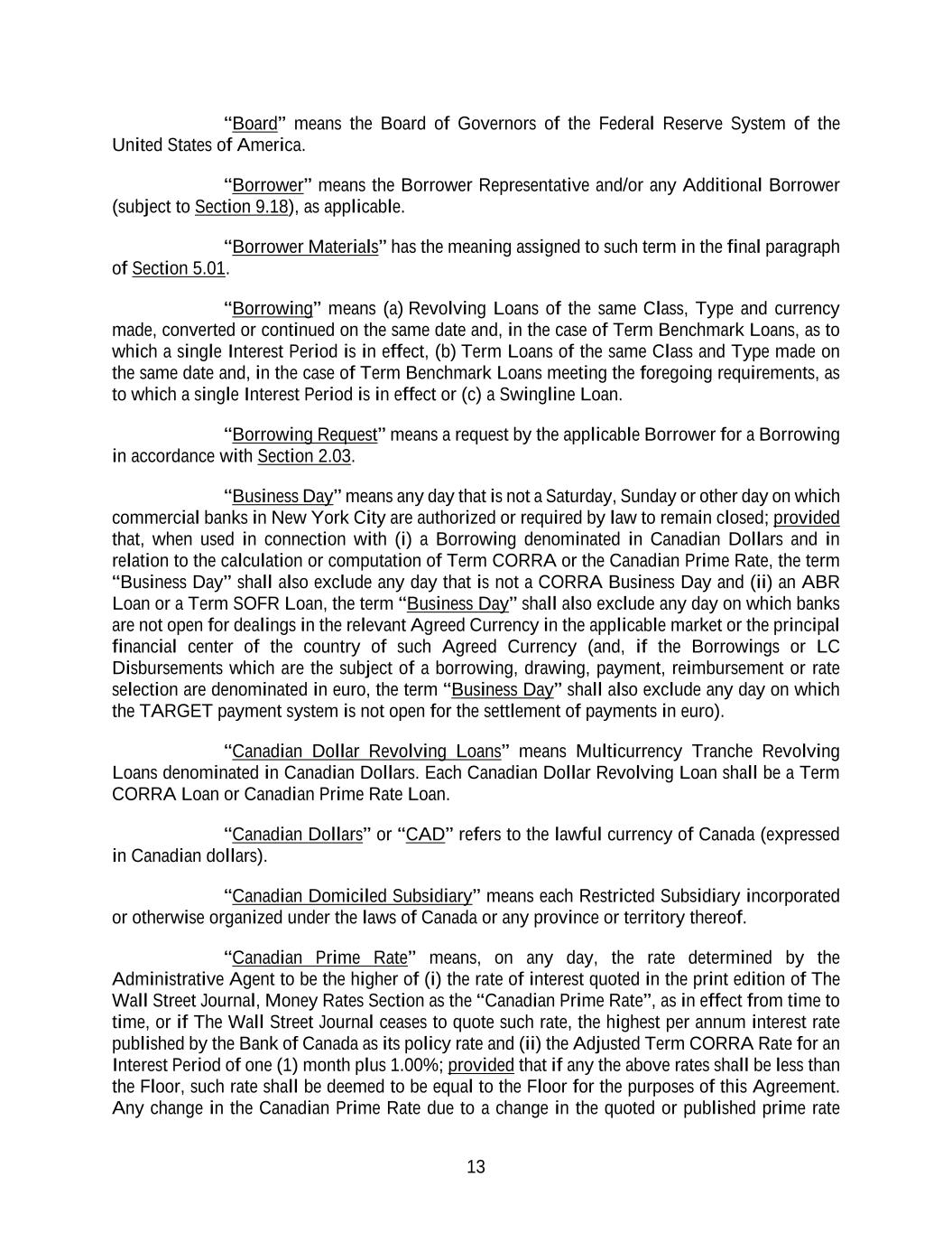 13 “Board” means the Board of Governors of the Federal Reserve System of the United States of America. “Borrower” means the Borrower Representative and/or any Additional Borrower (subject to Section 9.18), as applicable. “Borrower Materials” has the meaning assigned to such term in the final paragraph of Section 5.01. “Borrowing” means (a) Revolving Loans of the same Class, Type and currency made, converted or continued on the same date and, in the case of Term Benchmark Loans, as to which a single Interest Period is in effect, (b) Term Loans of the same Class and Type made on the same date and, in the case of Term Benchmark Loans meeting the foregoing requirements, as to which a single Interest Period is in effect or (c) a Swingline Loan. “Borrowing Request” means a request by the applicable Borrower for a Borrowing in accordance with Section 2.03. “Business Day” means any day that is not a Saturday, Sunday or other day on which commercial banks in New York City are authorized or required by law to remain closed; provided that, when used in connection with (i) a Borrowing denominated in Canadian Dollars and in relation to the calculation or computation of Term CORRA or the Canadian Prime Rate, the term “Business Day” shall also exclude any day that is not a CORRA Business Day and (ii) an ABR Loan or a Term SOFR Loan, the term “Business Day” shall also exclude any day on which banks are not open for dealings in the relevant Agreed Currency in the applicable market or the principal financial center of the country of such Agreed Currency (and, if the Borrowings or LC Disbursements which are the subject of a borrowing, drawing, payment, reimbursement or rate selection are denominated in euro, the term “Business Day” shall also exclude any day on which the TARGET payment system is not open for the settlement of payments in euro). “Canadian Dollar Revolving Loans” means Multicurrency Tranche Revolving Loans denominated in Canadian Dollars. Each Canadian Dollar Revolving Loan shall be a Term CORRA Loan or Canadian Prime Rate Loan. “Canadian Dollars” or “CAD” refers to the lawful currency of Canada (expressed in Canadian dollars). “Canadian Domiciled Subsidiary” means each Restricted Subsidiary incorporated or otherwise organized under the laws of Canada or any province or territory thereof. “Canadian Prime Rate” means, on any day, the rate determined by the Administrative Agent to be the higher of (i) the rate of interest quoted in the print edition of The Wall Street Journal, Money Rates Section as the “Canadian Prime Rate”, as in effect from time to time, or if The Wall Street Journal ceases to quote such rate, the highest per annum interest rate published by the Bank of Canada as its policy rate and (ii) the Adjusted Term CORRA Rate for an Interest Period of one (1) month plus 1.00%; provided that if any the above rates shall be less than the Floor, such rate shall be deemed to be equal to the Floor for the purposes of this Agreement. Any change in the Canadian Prime Rate due to a change in the quoted or published prime rate