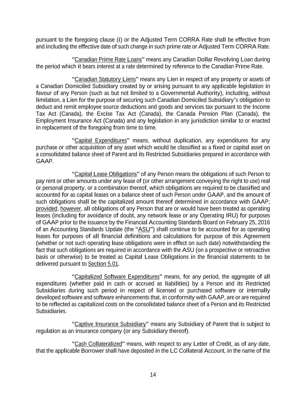 14 pursuant to the foregoing clause (i) or the Adjusted Term CORRA Rate shall be effective from and including the effective date of such change in such prime rate or Adjusted Term CORRA Rate. “Canadian Prime Rate Loans” means any Canadian Dollar Revolving Loan during the period which it bears interest at a rate determined by reference to the Canadian Prime Rate. “Canadian Statutory Liens” means any Lien in respect of any property or assets of a Canadian Domiciled Subsidiary created by or arising pursuant to any applicable legislation in favour of any Person (such as but not limited to a Governmental Authority), including, without limitation, a Lien for the purpose of securing such Canadian Domiciled Subsidiary’s obligation to deduct and remit employee source deductions and goods and services tax pursuant to the Income Tax Act (Canada), the Excise Tax Act (Canada), the Canada Pension Plan (Canada), the Employment Insurance Act (Canada) and any legislation in any jurisdiction similar to or enacted in replacement of the foregoing from time to time. “Capital Expenditures” means, without duplication, any expenditures for any purchase or other acquisition of any asset which would be classified as a fixed or capital asset on a consolidated balance sheet of Parent and its Restricted Subsidiaries prepared in accordance with GAAP. “Capital Lease Obligations” of any Person means the obligations of such Person to pay rent or other amounts under any lease of (or other arrangement conveying the right to use) real or personal property, or a combination thereof, which obligations are required to be classified and accounted for as capital leases on a balance sheet of such Person under GAAP, and the amount of such obligations shall be the capitalized amount thereof determined in accordance with GAAP; provided, however, all obligations of any Person that are or would have been treated as operating leases (including for avoidance of doubt, any network lease or any Operating IRU) for purposes of GAAP prior to the issuance by the Financial Accounting Standards Board on February 25, 2016 of an Accounting Standards Update (the “ASU”) shall continue to be accounted for as operating leases for purposes of all financial definitions and calculations for purpose of this Agreement (whether or not such operating lease obligations were in effect on such date) notwithstanding the fact that such obligations are required in accordance with the ASU (on a prospective or retroactive basis or otherwise) to be treated as Capital Lease Obligations in the financial statements to be delivered pursuant to Section 5.01. “Capitalized Software Expenditures” means, for any period, the aggregate of all expenditures (whether paid in cash or accrued as liabilities) by a Person and its Restricted Subsidiaries during such period in respect of licensed or purchased software or internally developed software and software enhancements that, in conformity with GAAP, are or are required to be reflected as capitalized costs on the consolidated balance sheet of a Person and its Restricted Subsidiaries. “Captive Insurance Subsidiary” means any Subsidiary of Parent that is subject to regulation as an insurance company (or any Subsidiary thereof). “Cash Collateralized” means, with respect to any Letter of Credit, as of any date, that the applicable Borrower shall have deposited in the LC Collateral Account, in the name of the