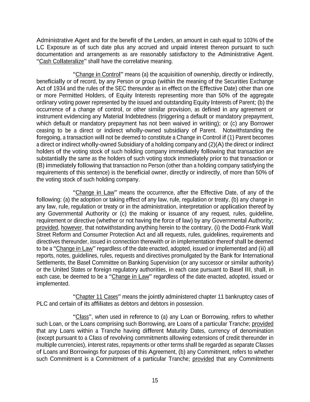 15 Administrative Agent and for the benefit of the Lenders, an amount in cash equal to 103% of the LC Exposure as of such date plus any accrued and unpaid interest thereon pursuant to such documentation and arrangements as are reasonably satisfactory to the Administrative Agent. “Cash Collateralize” shall have the correlative meaning. “Change in Control” means (a) the acquisition of ownership, directly or indirectly, beneficially or of record, by any Person or group (within the meaning of the Securities Exchange Act of 1934 and the rules of the SEC thereunder as in effect on the Effective Date) other than one or more Permitted Holders, of Equity Interests representing more than 50% of the aggregate ordinary voting power represented by the issued and outstanding Equity Interests of Parent; (b) the occurrence of a change of control, or other similar provision, as defined in any agreement or instrument evidencing any Material Indebtedness (triggering a default or mandatory prepayment, which default or mandatory prepayment has not been waived in writing); or (c) any Borrower ceasing to be a direct or indirect wholly-owned subsidiary of Parent. Notwithstanding the foregoing, a transaction will not be deemed to constitute a Change in Control if (1) Parent becomes a direct or indirect wholly-owned Subsidiary of a holding company and (2)(A) the direct or indirect holders of the voting stock of such holding company immediately following that transaction are substantially the same as the holders of such voting stock immediately prior to that transaction or (B) immediately following that transaction no Person (other than a holding company satisfying the requirements of this sentence) is the beneficial owner, directly or indirectly, of more than 50% of the voting stock of such holding company. “Change in Law” means the occurrence, after the Effective Date, of any of the following: (a) the adoption or taking effect of any law, rule, regulation or treaty, (b) any change in any law, rule, regulation or treaty or in the administration, interpretation or application thereof by any Governmental Authority or (c) the making or issuance of any request, rules, guideline, requirement or directive (whether or not having the force of law) by any Governmental Authority; provided, however, that notwithstanding anything herein to the contrary, (i) the Dodd-Frank Wall Street Reform and Consumer Protection Act and all requests, rules, guidelines, requirements and directives thereunder, issued in connection therewith or in implementation thereof shall be deemed to be a “Change in Law” regardless of the date enacted, adopted, issued or implemented and (ii) all reports, notes, guidelines, rules, requests and directives promulgated by the Bank for International Settlements, the Basel Committee on Banking Supervision (or any successor or similar authority) or the United States or foreign regulatory authorities, in each case pursuant to Basel III, shall, in each case, be deemed to be a “Change in Law” regardless of the date enacted, adopted, issued or implemented. “Chapter 11 Cases” means the jointly administered chapter 11 bankruptcy cases of PLC and certain of its affiliates as debtors and debtors in possession. “Class”, when used in reference to (a) any Loan or Borrowing, refers to whether such Loan, or the Loans comprising such Borrowing, are Loans of a particular Tranche; provided that any Loans within a Tranche having different Maturity Dates, currency of denomination (except pursuant to a Class of revolving commitments allowing extensions of credit thereunder in multiple currencies), interest rates, repayments or other terms shall be regarded as separate Classes of Loans and Borrowings for purposes of this Agreement, (b) any Commitment, refers to whether such Commitment is a Commitment of a particular Tranche; provided that any Commitments