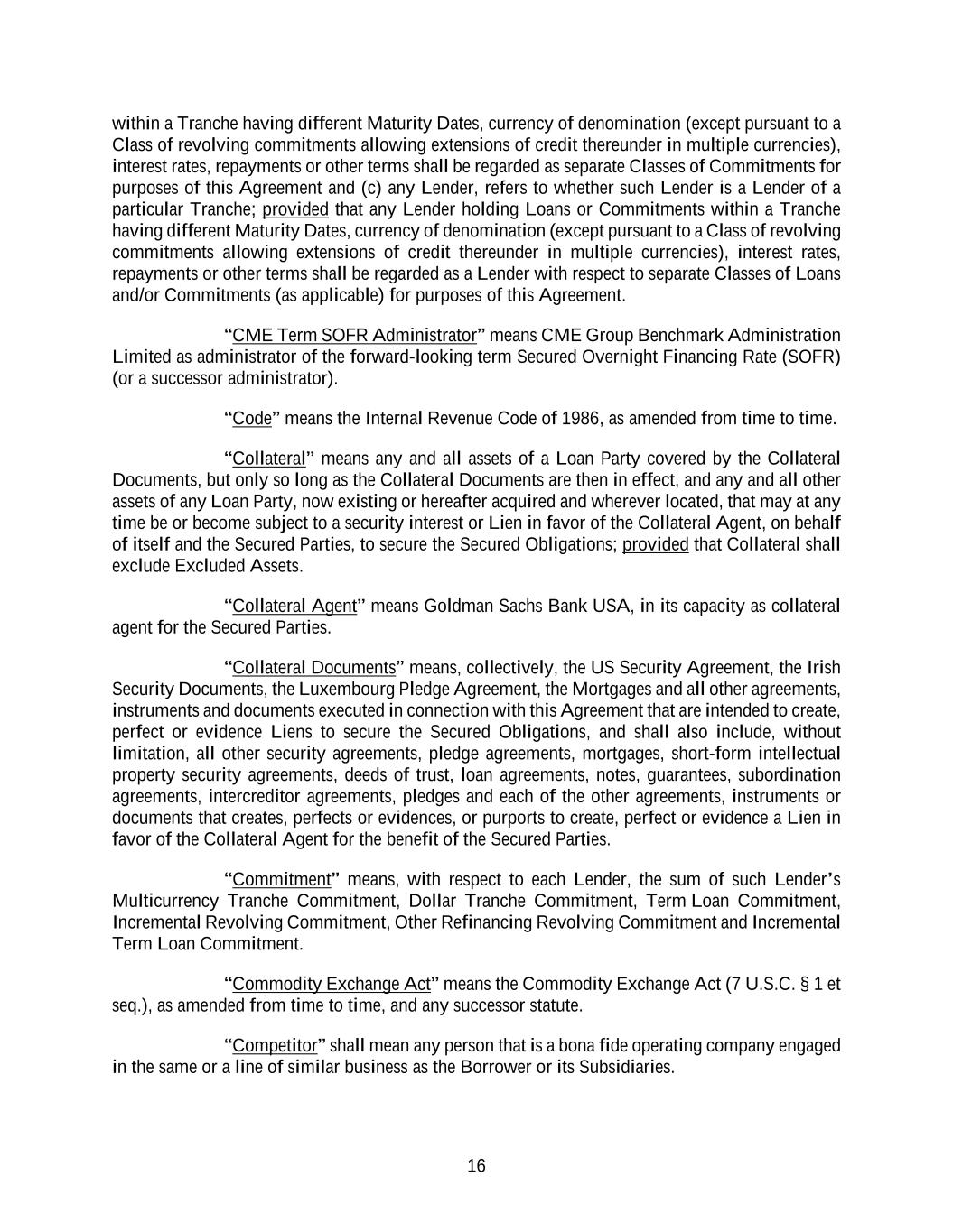 16 within a Tranche having different Maturity Dates, currency of denomination (except pursuant to a Class of revolving commitments allowing extensions of credit thereunder in multiple currencies), interest rates, repayments or other terms shall be regarded as separate Classes of Commitments for purposes of this Agreement and (c) any Lender, refers to whether such Lender is a Lender of a particular Tranche; provided that any Lender holding Loans or Commitments within a Tranche having different Maturity Dates, currency of denomination (except pursuant to a Class of revolving commitments allowing extensions of credit thereunder in multiple currencies), interest rates, repayments or other terms shall be regarded as a Lender with respect to separate Classes of Loans and/or Commitments (as applicable) for purposes of this Agreement. “CME Term SOFR Administrator” means CME Group Benchmark Administration Limited as administrator of the forward-looking term Secured Overnight Financing Rate (SOFR) (or a successor administrator). “Code” means the Internal Revenue Code of 1986, as amended from time to time. “Collateral” means any and all assets of a Loan Party covered by the Collateral Documents, but only so long as the Collateral Documents are then in effect, and any and all other assets of any Loan Party, now existing or hereafter acquired and wherever located, that may at any time be or become subject to a security interest or Lien in favor of the Collateral Agent, on behalf of itself and the Secured Parties, to secure the Secured Obligations; provided that Collateral shall exclude Excluded Assets. “Collateral Agent” means Goldman Sachs Bank USA, in its capacity as collateral agent for the Secured Parties. “Collateral Documents” means, collectively, the US Security Agreement, the Irish Security Documents, the Luxembourg Pledge Agreement, the Mortgages and all other agreements, instruments and documents executed in connection with this Agreement that are intended to create, perfect or evidence Liens to secure the Secured Obligations, and shall also include, without limitation, all other security agreements, pledge agreements, mortgages, short-form intellectual property security agreements, deeds of trust, loan agreements, notes, guarantees, subordination agreements, intercreditor agreements, pledges and each of the other agreements, instruments or documents that creates, perfects or evidences, or purports to create, perfect or evidence a Lien in favor of the Collateral Agent for the benefit of the Secured Parties. “Commitment” means, with respect to each Lender, the sum of such Lender’s Multicurrency Tranche Commitment, Dollar Tranche Commitment, Term Loan Commitment, Incremental Revolving Commitment, Other Refinancing Revolving Commitment and Incremental Term Loan Commitment. “Commodity Exchange Act” means the Commodity Exchange Act (7 U.S.C. § 1 et seq.), as amended from time to time, and any successor statute. “Competitor” shall mean any person that is a bona fide operating company engaged in the same or a line of similar business as the Borrower or its Subsidiaries.