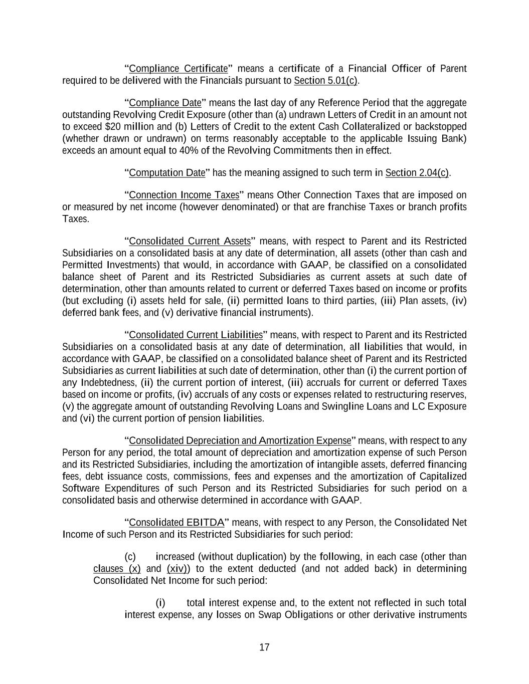 17 “Compliance Certificate” means a certificate of a Financial Officer of Parent required to be delivered with the Financials pursuant to Section 5.01(c). “Compliance Date” means the last day of any Reference Period that the aggregate outstanding Revolving Credit Exposure (other than (a) undrawn Letters of Credit in an amount not to exceed $20 million and (b) Letters of Credit to the extent Cash Collateralized or backstopped (whether drawn or undrawn) on terms reasonably acceptable to the applicable Issuing Bank) exceeds an amount equal to 40% of the Revolving Commitments then in effect. “Computation Date” has the meaning assigned to such term in Section 2.04(c). “Connection Income Taxes” means Other Connection Taxes that are imposed on or measured by net income (however denominated) or that are franchise Taxes or branch profits Taxes. “Consolidated Current Assets” means, with respect to Parent and its Restricted Subsidiaries on a consolidated basis at any date of determination, all assets (other than cash and Permitted Investments) that would, in accordance with GAAP, be classified on a consolidated balance sheet of Parent and its Restricted Subsidiaries as current assets at such date of determination, other than amounts related to current or deferred Taxes based on income or profits (but excluding (i) assets held for sale, (ii) permitted loans to third parties, (iii) Plan assets, (iv) deferred bank fees, and (v) derivative financial instruments). “Consolidated Current Liabilities” means, with respect to Parent and its Restricted Subsidiaries on a consolidated basis at any date of determination, all liabilities that would, in accordance with GAAP, be classified on a consolidated balance sheet of Parent and its Restricted Subsidiaries as current liabilities at such date of determination, other than (i) the current portion of any Indebtedness, (ii) the current portion of interest, (iii) accruals for current or deferred Taxes based on income or profits, (iv) accruals of any costs or expenses related to restructuring reserves, (v) the aggregate amount of outstanding Revolving Loans and Swingline Loans and LC Exposure and (vi) the current portion of pension liabilities. “Consolidated Depreciation and Amortization Expense” means, with respect to any Person for any period, the total amount of depreciation and amortization expense of such Person and its Restricted Subsidiaries, including the amortization of intangible assets, deferred financing fees, debt issuance costs, commissions, fees and expenses and the amortization of Capitalized Software Expenditures of such Person and its Restricted Subsidiaries for such period on a consolidated basis and otherwise determined in accordance with GAAP. “Consolidated EBITDA” means, with respect to any Person, the Consolidated Net Income of such Person and its Restricted Subsidiaries for such period: (c) increased (without duplication) by the following, in each case (other than clauses (x) and (xiv)) to the extent deducted (and not added back) in determining Consolidated Net Income for such period: (i) total interest expense and, to the extent not reflected in such total interest expense, any losses on Swap Obligations or other derivative instruments