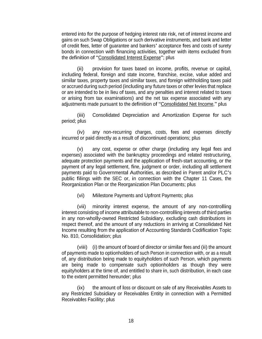 18 entered into for the purpose of hedging interest rate risk, net of interest income and gains on such Swap Obligations or such derivative instruments, and bank and letter of credit fees, letter of guarantee and bankers’ acceptance fees and costs of surety bonds in connection with financing activities, together with items excluded from the definition of “Consolidated Interest Expense”; plus (ii) provision for taxes based on income, profits, revenue or capital, including federal, foreign and state income, franchise, excise, value added and similar taxes, property taxes and similar taxes, and foreign withholding taxes paid or accrued during such period (including any future taxes or other levies that replace or are intended to be in lieu of taxes, and any penalties and interest related to taxes or arising from tax examinations) and the net tax expense associated with any adjustments made pursuant to the definition of “Consolidated Net Income,” plus (iii) Consolidated Depreciation and Amortization Expense for such period; plus (iv) any non-recurring charges, costs, fees and expenses directly incurred or paid directly as a result of discontinued operations; plus (v) any cost, expense or other charge (including any legal fees and expenses) associated with the bankruptcy proceedings and related restructuring, adequate protection payments and the application of fresh-start accounting, or the payment of any legal settlement, fine, judgment or order, including all settlement payments paid to Governmental Authorities, as described in Parent and/or PLC’s public filings with the SEC or, in connection with the Chapter 11 Cases, the Reorganization Plan or the Reorganization Plan Documents; plus (vi) Milestone Payments and Upfront Payments; plus (vii) minority interest expense, the amount of any non-controlling interest consisting of income attributable to non-controlling interests of third parties in any non-wholly-owned Restricted Subsidiary, excluding cash distributions in respect thereof, and the amount of any reductions in arriving at Consolidated Net Income resulting from the application of Accounting Standards Codification Topic No. 810, Consolidation; plus (viii) (i) the amount of board of director or similar fees and (ii) the amount of payments made to optionholders of such Person in connection with, or as a result of, any distribution being made to equityholders of such Person, which payments are being made to compensate such optionholders as though they were equityholders at the time of, and entitled to share in, such distribution, in each case to the extent permitted hereunder; plus (ix) the amount of loss or discount on sale of any Receivables Assets to any Restricted Subsidiary or Receivables Entity in connection with a Permitted Receivables Facility; plus