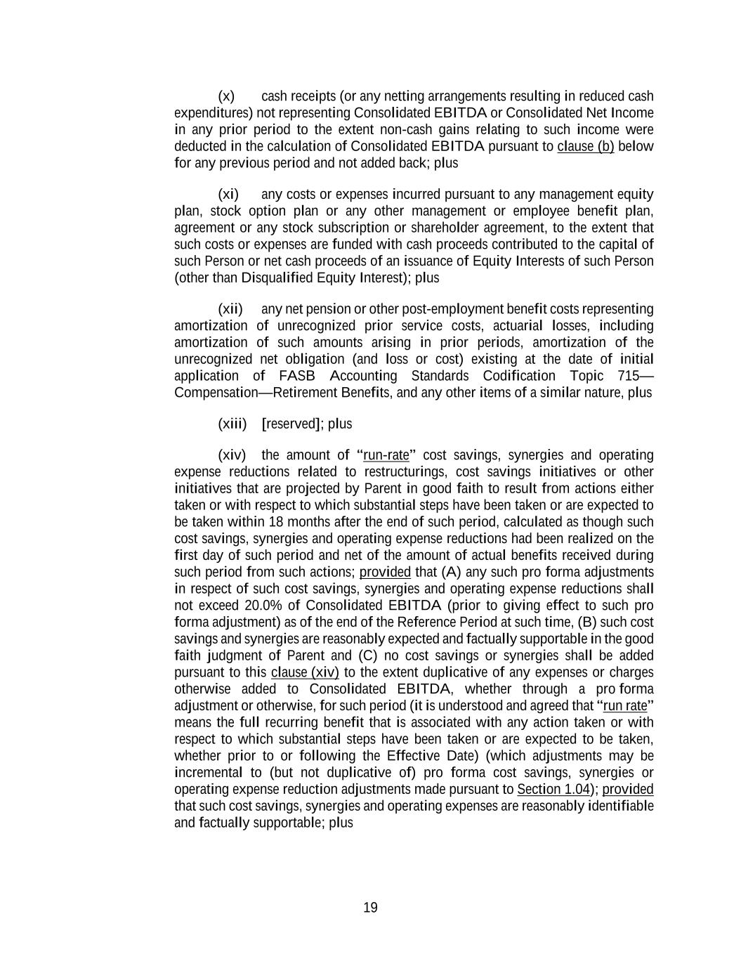 19 (x) cash receipts (or any netting arrangements resulting in reduced cash expenditures) not representing Consolidated EBITDA or Consolidated Net Income in any prior period to the extent non-cash gains relating to such income were deducted in the calculation of Consolidated EBITDA pursuant to clause (b) below for any previous period and not added back; plus (xi) any costs or expenses incurred pursuant to any management equity plan, stock option plan or any other management or employee benefit plan, agreement or any stock subscription or shareholder agreement, to the extent that such costs or expenses are funded with cash proceeds contributed to the capital of such Person or net cash proceeds of an issuance of Equity Interests of such Person (other than Disqualified Equity Interest); plus (xii) any net pension or other post-employment benefit costs representing amortization of unrecognized prior service costs, actuarial losses, including amortization of such amounts arising in prior periods, amortization of the unrecognized net obligation (and loss or cost) existing at the date of initial application of FASB Accounting Standards Codification Topic 715— Compensation—Retirement Benefits, and any other items of a similar nature, plus (xiii) [reserved]; plus (xiv) the amount of “run-rate” cost savings, synergies and operating expense reductions related to restructurings, cost savings initiatives or other initiatives that are projected by Parent in good faith to result from actions either taken or with respect to which substantial steps have been taken or are expected to be taken within 18 months after the end of such period, calculated as though such cost savings, synergies and operating expense reductions had been realized on the first day of such period and net of the amount of actual benefits received during such period from such actions; provided that (A) any such pro forma adjustments in respect of such cost savings, synergies and operating expense reductions shall not exceed 20.0% of Consolidated EBITDA (prior to giving effect to such pro forma adjustment) as of the end of the Reference Period at such time, (B) such cost savings and synergies are reasonably expected and factually supportable in the good faith judgment of Parent and (C) no cost savings or synergies shall be added pursuant to this clause (xiv) to the extent duplicative of any expenses or charges otherwise added to Consolidated EBITDA, whether through a pro forma adjustment or otherwise, for such period (it is understood and agreed that “run rate” means the full recurring benefit that is associated with any action taken or with respect to which substantial steps have been taken or are expected to be taken, whether prior to or following the Effective Date) (which adjustments may be incremental to (but not duplicative of) pro forma cost savings, synergies or operating expense reduction adjustments made pursuant to Section 1.04); provided that such cost savings, synergies and operating expenses are reasonably identifiable and factually supportable; plus