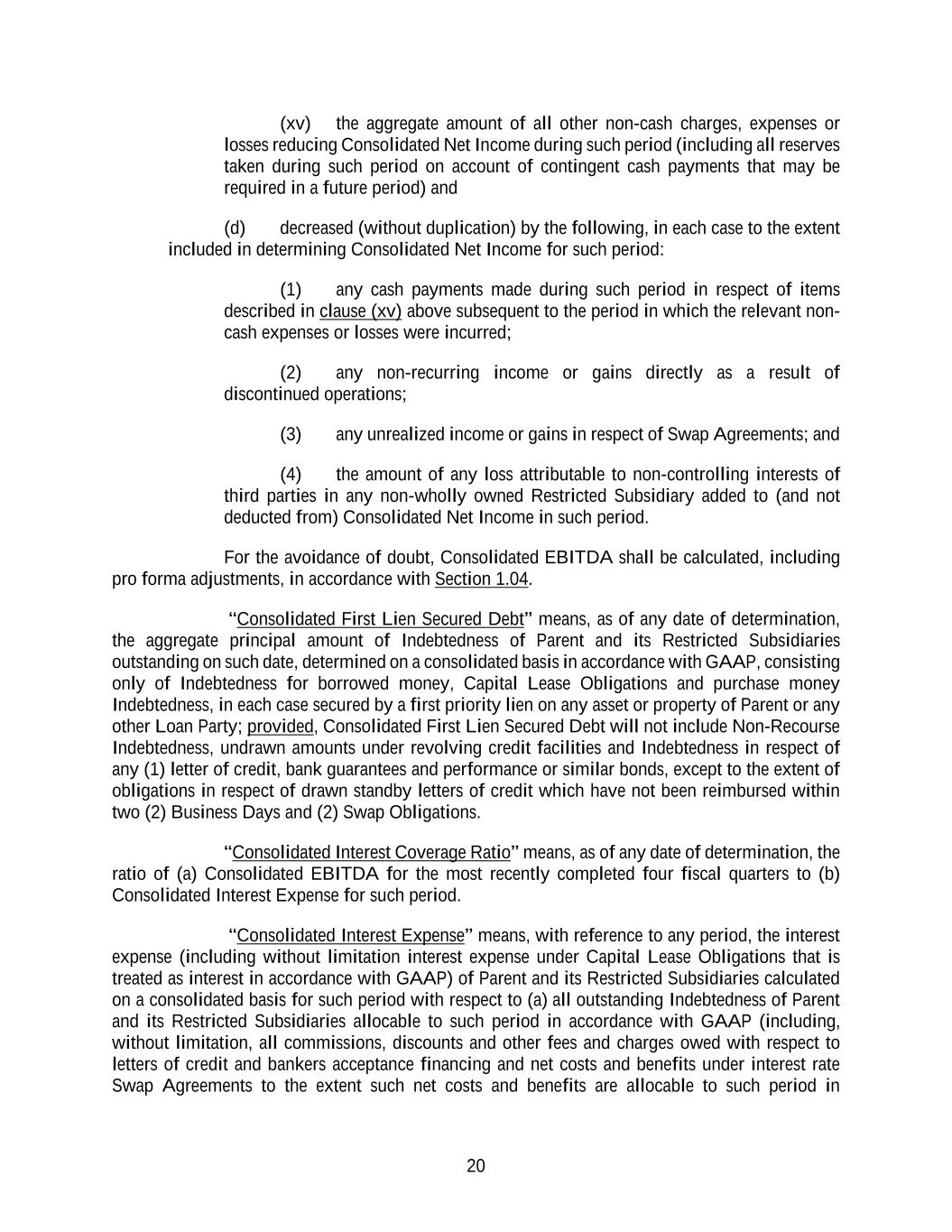 20 (xv) the aggregate amount of all other non-cash charges, expenses or losses reducing Consolidated Net Income during such period (including all reserves taken during such period on account of contingent cash payments that may be required in a future period) and (d) decreased (without duplication) by the following, in each case to the extent included in determining Consolidated Net Income for such period: (1) any cash payments made during such period in respect of items described in clause (xv) above subsequent to the period in which the relevant non- cash expenses or losses were incurred; (2) any non-recurring income or gains directly as a result of discontinued operations; (3) any unrealized income or gains in respect of Swap Agreements; and (4) the amount of any loss attributable to non-controlling interests of third parties in any non-wholly owned Restricted Subsidiary added to (and not deducted from) Consolidated Net Income in such period. For the avoidance of doubt, Consolidated EBITDA shall be calculated, including pro forma adjustments, in accordance with Section 1.04. “Consolidated First Lien Secured Debt” means, as of any date of determination, the aggregate principal amount of Indebtedness of Parent and its Restricted Subsidiaries outstanding on such date, determined on a consolidated basis in accordance with GAAP, consisting only of Indebtedness for borrowed money, Capital Lease Obligations and purchase money Indebtedness, in each case secured by a first priority lien on any asset or property of Parent or any other Loan Party; provided, Consolidated First Lien Secured Debt will not include Non-Recourse Indebtedness, undrawn amounts under revolving credit facilities and Indebtedness in respect of any (1) letter of credit, bank guarantees and performance or similar bonds, except to the extent of obligations in respect of drawn standby letters of credit which have not been reimbursed within two (2) Business Days and (2) Swap Obligations. “Consolidated Interest Coverage Ratio” means, as of any date of determination, the ratio of (a) Consolidated EBITDA for the most recently completed four fiscal quarters to (b) Consolidated Interest Expense for such period. “Consolidated Interest Expense” means, with reference to any period, the interest expense (including without limitation interest expense under Capital Lease Obligations that is treated as interest in accordance with GAAP) of Parent and its Restricted Subsidiaries calculated on a consolidated basis for such period with respect to (a) all outstanding Indebtedness of Parent and its Restricted Subsidiaries allocable to such period in accordance with GAAP (including, without limitation, all commissions, discounts and other fees and charges owed with respect to letters of credit and bankers acceptance financing and net costs and benefits under interest rate Swap Agreements to the extent such net costs and benefits are allocable to such period in