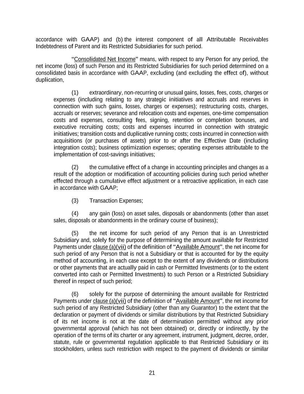 21 accordance with GAAP) and (b) the interest component of all Attributable Receivables Indebtedness of Parent and its Restricted Subsidiaries for such period. “Consolidated Net Income” means, with respect to any Person for any period, the net income (loss) of such Person and its Restricted Subsidiaries for such period determined on a consolidated basis in accordance with GAAP, excluding (and excluding the effect of), without duplication, (1) extraordinary, non-recurring or unusual gains, losses, fees, costs, charges or expenses (including relating to any strategic initiatives and accruals and reserves in connection with such gains, losses, charges or expenses); restructuring costs, charges, accruals or reserves; severance and relocation costs and expenses, one-time compensation costs and expenses, consulting fees, signing, retention or completion bonuses, and executive recruiting costs; costs and expenses incurred in connection with strategic initiatives; transition costs and duplicative running costs; costs incurred in connection with acquisitions (or purchases of assets) prior to or after the Effective Date (including integration costs); business optimization expenses; operating expenses attributable to the implementation of cost-savings initiatives; (2) the cumulative effect of a change in accounting principles and changes as a result of the adoption or modification of accounting policies during such period whether effected through a cumulative effect adjustment or a retroactive application, in each case in accordance with GAAP; (3) Transaction Expenses; (4) any gain (loss) on asset sales, disposals or abandonments (other than asset sales, disposals or abandonments in the ordinary course of business); (5) the net income for such period of any Person that is an Unrestricted Subsidiary and, solely for the purpose of determining the amount available for Restricted Payments under clause (a)(vii) of the definition of “Available Amount”, the net income for such period of any Person that is not a Subsidiary or that is accounted for by the equity method of accounting, in each case except to the extent of any dividends or distributions or other payments that are actually paid in cash or Permitted Investments (or to the extent converted into cash or Permitted Investments) to such Person or a Restricted Subsidiary thereof in respect of such period; (6) solely for the purpose of determining the amount available for Restricted Payments under clause (a)(vii) of the definition of “Available Amount”, the net income for such period of any Restricted Subsidiary (other than any Guarantor) to the extent that the declaration or payment of dividends or similar distributions by that Restricted Subsidiary of its net income is not at the date of determination permitted without any prior governmental approval (which has not been obtained) or, directly or indirectly, by the operation of the terms of its charter or any agreement, instrument, judgment, decree, order, statute, rule or governmental regulation applicable to that Restricted Subsidiary or its stockholders, unless such restriction with respect to the payment of dividends or similar