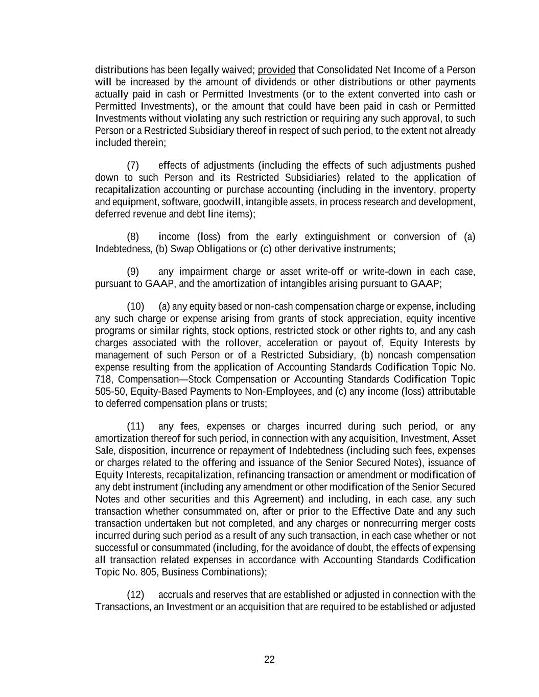 22 distributions has been legally waived; provided that Consolidated Net Income of a Person will be increased by the amount of dividends or other distributions or other payments actually paid in cash or Permitted Investments (or to the extent converted into cash or Permitted Investments), or the amount that could have been paid in cash or Permitted Investments without violating any such restriction or requiring any such approval, to such Person or a Restricted Subsidiary thereof in respect of such period, to the extent not already included therein; (7) effects of adjustments (including the effects of such adjustments pushed down to such Person and its Restricted Subsidiaries) related to the application of recapitalization accounting or purchase accounting (including in the inventory, property and equipment, software, goodwill, intangible assets, in process research and development, deferred revenue and debt line items); (8) income (loss) from the early extinguishment or conversion of (a) Indebtedness, (b) Swap Obligations or (c) other derivative instruments; (9) any impairment charge or asset write-off or write-down in each case, pursuant to GAAP, and the amortization of intangibles arising pursuant to GAAP; (10) (a) any equity based or non-cash compensation charge or expense, including any such charge or expense arising from grants of stock appreciation, equity incentive programs or similar rights, stock options, restricted stock or other rights to, and any cash charges associated with the rollover, acceleration or payout of, Equity Interests by management of such Person or of a Restricted Subsidiary, (b) noncash compensation expense resulting from the application of Accounting Standards Codification Topic No. 718, Compensation—Stock Compensation or Accounting Standards Codification Topic 505-50, Equity-Based Payments to Non-Employees, and (c) any income (loss) attributable to deferred compensation plans or trusts; (11) any fees, expenses or charges incurred during such period, or any amortization thereof for such period, in connection with any acquisition, Investment, Asset Sale, disposition, incurrence or repayment of Indebtedness (including such fees, expenses or charges related to the offering and issuance of the Senior Secured Notes), issuance of Equity Interests, recapitalization, refinancing transaction or amendment or modification of any debt instrument (including any amendment or other modification of the Senior Secured Notes and other securities and this Agreement) and including, in each case, any such transaction whether consummated on, after or prior to the Effective Date and any such transaction undertaken but not completed, and any charges or nonrecurring merger costs incurred during such period as a result of any such transaction, in each case whether or not successful or consummated (including, for the avoidance of doubt, the effects of expensing all transaction related expenses in accordance with Accounting Standards Codification Topic No. 805, Business Combinations); (12) accruals and reserves that are established or adjusted in connection with the Transactions, an Investment or an acquisition that are required to be established or adjusted