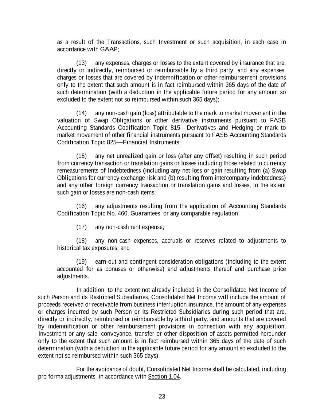 23 as a result of the Transactions, such Investment or such acquisition, in each case in accordance with GAAP; (13) any expenses, charges or losses to the extent covered by insurance that are, directly or indirectly, reimbursed or reimbursable by a third party, and any expenses, charges or losses that are covered by indemnification or other reimbursement provisions only to the extent that such amount is in fact reimbursed within 365 days of the date of such determination (with a deduction in the applicable future period for any amount so excluded to the extent not so reimbursed within such 365 days); (14) any non-cash gain (loss) attributable to the mark to market movement in the valuation of Swap Obligations or other derivative instruments pursuant to FASB Accounting Standards Codification Topic 815—Derivatives and Hedging or mark to market movement of other financial instruments pursuant to FASB Accounting Standards Codification Topic 825—Financial Instruments; (15) any net unrealized gain or loss (after any offset) resulting in such period from currency transaction or translation gains or losses including those related to currency remeasurements of Indebtedness (including any net loss or gain resulting from (a) Swap Obligations for currency exchange risk and (b) resulting from intercompany indebtedness) and any other foreign currency transaction or translation gains and losses, to the extent such gain or losses are non-cash items; (16) any adjustments resulting from the application of Accounting Standards Codification Topic No. 460, Guarantees, or any comparable regulation; (17) any non-cash rent expense; (18) any non-cash expenses, accruals or reserves related to adjustments to historical tax exposures; and (19) earn-out and contingent consideration obligations (including to the extent accounted for as bonuses or otherwise) and adjustments thereof and purchase price adjustments. In addition, to the extent not already included in the Consolidated Net Income of such Person and its Restricted Subsidiaries, Consolidated Net Income will include the amount of proceeds received or receivable from business interruption insurance, the amount of any expenses or charges incurred by such Person or its Restricted Subsidiaries during such period that are, directly or indirectly, reimbursed or reimbursable by a third party, and amounts that are covered by indemnification or other reimbursement provisions in connection with any acquisition, Investment or any sale, conveyance, transfer or other disposition of assets permitted hereunder only to the extent that such amount is in fact reimbursed within 365 days of the date of such determination (with a deduction in the applicable future period for any amount so excluded to the extent not so reimbursed within such 365 days). For the avoidance of doubt, Consolidated Net Income shall be calculated, including pro forma adjustments, in accordance with Section 1.04.