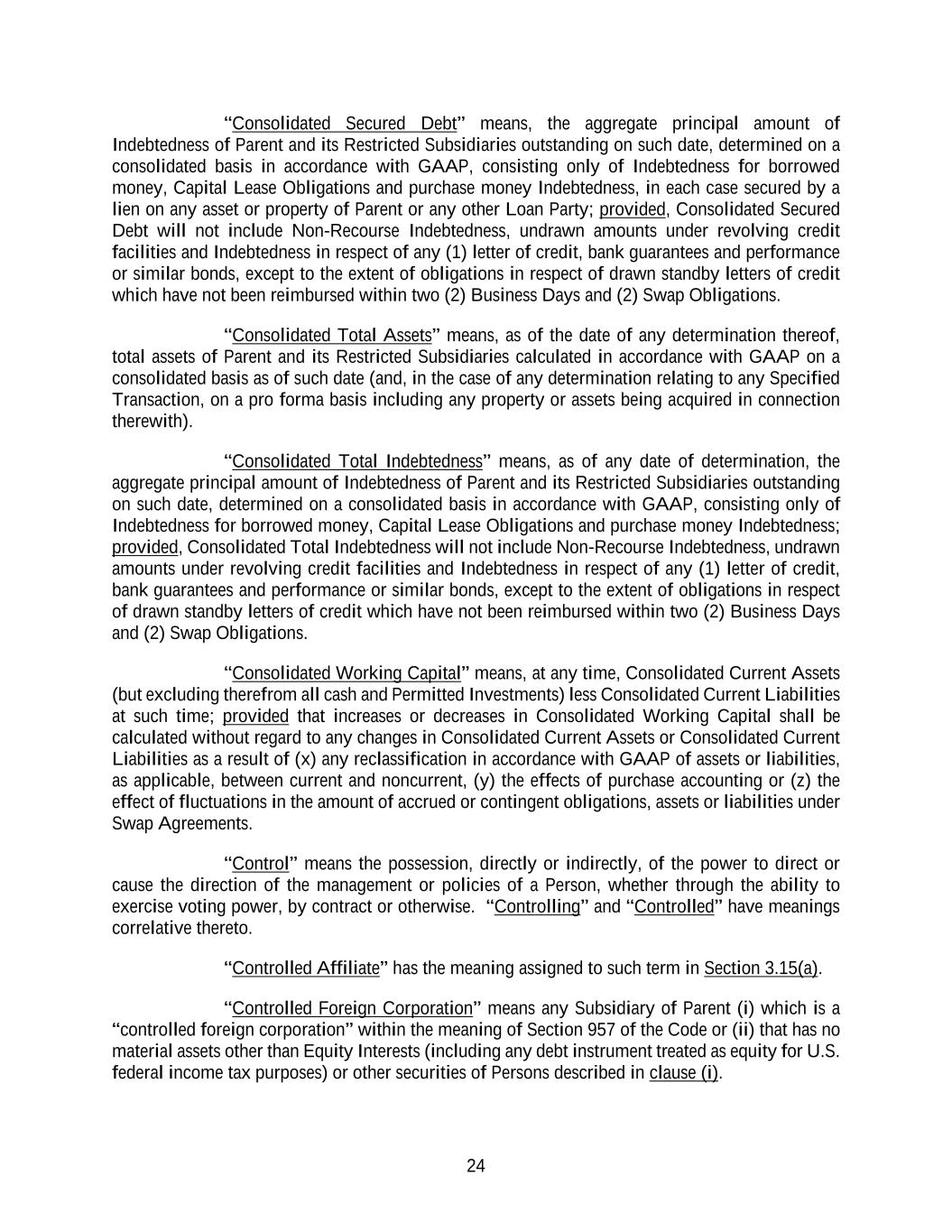 24 “Consolidated Secured Debt” means, the aggregate principal amount of Indebtedness of Parent and its Restricted Subsidiaries outstanding on such date, determined on a consolidated basis in accordance with GAAP, consisting only of Indebtedness for borrowed money, Capital Lease Obligations and purchase money Indebtedness, in each case secured by a lien on any asset or property of Parent or any other Loan Party; provided, Consolidated Secured Debt will not include Non-Recourse Indebtedness, undrawn amounts under revolving credit facilities and Indebtedness in respect of any (1) letter of credit, bank guarantees and performance or similar bonds, except to the extent of obligations in respect of drawn standby letters of credit which have not been reimbursed within two (2) Business Days and (2) Swap Obligations. “Consolidated Total Assets” means, as of the date of any determination thereof, total assets of Parent and its Restricted Subsidiaries calculated in accordance with GAAP on a consolidated basis as of such date (and, in the case of any determination relating to any Specified Transaction, on a pro forma basis including any property or assets being acquired in connection therewith). “Consolidated Total Indebtedness” means, as of any date of determination, the aggregate principal amount of Indebtedness of Parent and its Restricted Subsidiaries outstanding on such date, determined on a consolidated basis in accordance with GAAP, consisting only of Indebtedness for borrowed money, Capital Lease Obligations and purchase money Indebtedness; provided, Consolidated Total Indebtedness will not include Non-Recourse Indebtedness, undrawn amounts under revolving credit facilities and Indebtedness in respect of any (1) letter of credit, bank guarantees and performance or similar bonds, except to the extent of obligations in respect of drawn standby letters of credit which have not been reimbursed within two (2) Business Days and (2) Swap Obligations. “Consolidated Working Capital” means, at any time, Consolidated Current Assets (but excluding therefrom all cash and Permitted Investments) less Consolidated Current Liabilities at such time; provided that increases or decreases in Consolidated Working Capital shall be calculated without regard to any changes in Consolidated Current Assets or Consolidated Current Liabilities as a result of (x) any reclassification in accordance with GAAP of assets or liabilities, as applicable, between current and noncurrent, (y) the effects of purchase accounting or (z) the effect of fluctuations in the amount of accrued or contingent obligations, assets or liabilities under Swap Agreements. “Control” means the possession, directly or indirectly, of the power to direct or cause the direction of the management or policies of a Person, whether through the ability to exercise voting power, by contract or otherwise. “Controlling” and “Controlled” have meanings correlative thereto. “Controlled Affiliate” has the meaning assigned to such term in Section 3.15(a). “Controlled Foreign Corporation” means any Subsidiary of Parent (i) which is a “controlled foreign corporation” within the meaning of Section 957 of the Code or (ii) that has no material assets other than Equity Interests (including any debt instrument treated as equity for U.S. federal income tax purposes) or other securities of Persons described in clause (i).