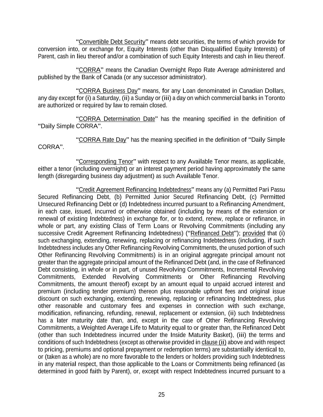 25 “Convertible Debt Security” means debt securities, the terms of which provide for conversion into, or exchange for, Equity Interests (other than Disqualified Equity Interests) of Parent, cash in lieu thereof and/or a combination of such Equity Interests and cash in lieu thereof. “CORRA” means the Canadian Overnight Repo Rate Average administered and published by the Bank of Canada (or any successor administrator). “CORRA Business Day” means, for any Loan denominated in Canadian Dollars, any day except for (i) a Saturday, (ii) a Sunday or (iii) a day on which commercial banks in Toronto are authorized or required by law to remain closed. “CORRA Determination Date” has the meaning specified in the definition of “Daily Simple CORRA”. “CORRA Rate Day” has the meaning specified in the definition of “Daily Simple CORRA”. “Corresponding Tenor” with respect to any Available Tenor means, as applicable, either a tenor (including overnight) or an interest payment period having approximately the same length (disregarding business day adjustment) as such Available Tenor. “Credit Agreement Refinancing Indebtedness” means any (a) Permitted Pari Passu Secured Refinancing Debt, (b) Permitted Junior Secured Refinancing Debt, (c) Permitted Unsecured Refinancing Debt or (d) Indebtedness incurred pursuant to a Refinancing Amendment, in each case, issued, incurred or otherwise obtained (including by means of the extension or renewal of existing Indebtedness) in exchange for, or to extend, renew, replace or refinance, in whole or part, any existing Class of Term Loans or Revolving Commitments (including any successive Credit Agreement Refinancing Indebtedness) (“Refinanced Debt”); provided that (i) such exchanging, extending, renewing, replacing or refinancing Indebtedness (including, if such Indebtedness includes any Other Refinancing Revolving Commitments, the unused portion of such Other Refinancing Revolving Commitments) is in an original aggregate principal amount not greater than the aggregate principal amount of the Refinanced Debt (and, in the case of Refinanced Debt consisting, in whole or in part, of unused Revolving Commitments, Incremental Revolving Commitments, Extended Revolving Commitments or Other Refinancing Revolving Commitments, the amount thereof) except by an amount equal to unpaid accrued interest and premium (including tender premium) thereon plus reasonable upfront fees and original issue discount on such exchanging, extending, renewing, replacing or refinancing Indebtedness, plus other reasonable and customary fees and expenses in connection with such exchange, modification, refinancing, refunding, renewal, replacement or extension, (ii) such Indebtedness has a later maturity date than, and, except in the case of Other Refinancing Revolving Commitments, a Weighted Average Life to Maturity equal to or greater than, the Refinanced Debt (other than such Indebtedness incurred under the Inside Maturity Basket), (iii) the terms and conditions of such Indebtedness (except as otherwise provided in clause (ii) above and with respect to pricing, premiums and optional prepayment or redemption terms) are substantially identical to, or (taken as a whole) are no more favorable to the lenders or holders providing such Indebtedness in any material respect, than those applicable to the Loans or Commitments being refinanced (as determined in good faith by Parent), or, except with respect Indebtedness incurred pursuant to a