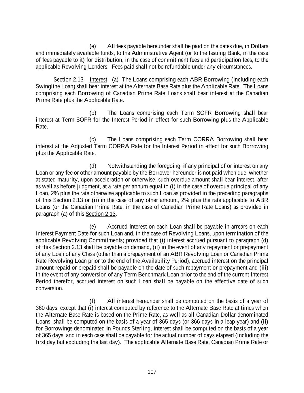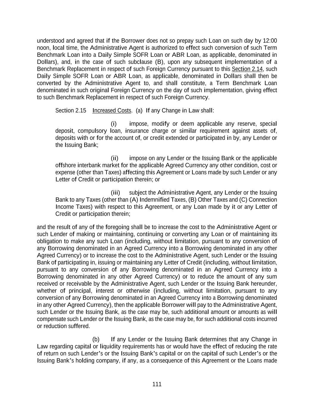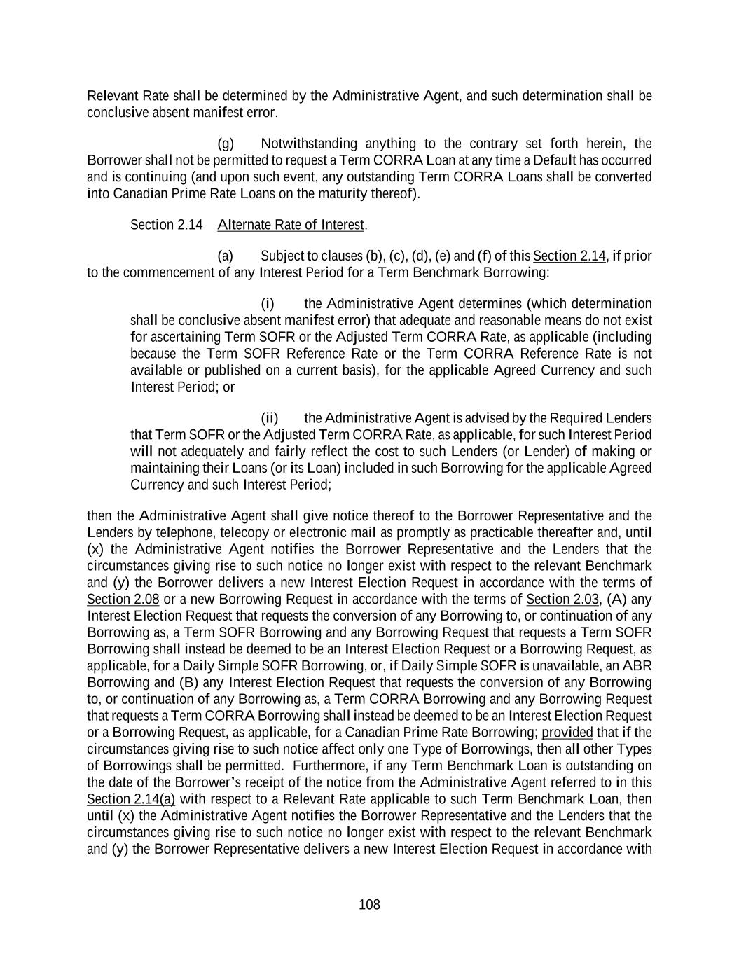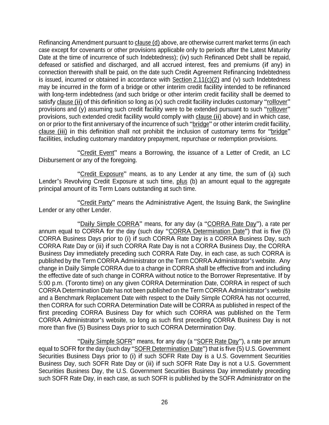 26 Refinancing Amendment pursuant to clause (d) above, are otherwise current market terms (in each case except for covenants or other provisions applicable only to periods after the Latest Maturity Date at the time of incurrence of such Indebtedness); (iv) such Refinanced Debt shall be repaid, defeased or satisfied and discharged, and all accrued interest, fees and premiums (if any) in connection therewith shall be paid, on the date such Credit Agreement Refinancing Indebtedness is issued, incurred or obtained in accordance with Section 2.11(c)(2) and (v) such Indebtedness may be incurred in the form of a bridge or other interim credit facility intended to be refinanced with long-term indebtedness (and such bridge or other interim credit facility shall be deemed to satisfy clause (ii) of this definition so long as (x) such credit facility includes customary “rollover” provisions and (y) assuming such credit facility were to be extended pursuant to such “rollover” provisions, such extended credit facility would comply with clause (ii) above) and in which case, on or prior to the first anniversary of the incurrence of such “bridge” or other interim credit facility, clause (iii) in this definition shall not prohibit the inclusion of customary terms for “bridge” facilities, including customary mandatory prepayment, repurchase or redemption provisions. “Credit Event” means a Borrowing, the issuance of a Letter of Credit, an LC Disbursement or any of the foregoing. “Credit Exposure” means, as to any Lender at any time, the sum of (a) such Lender’s Revolving Credit Exposure at such time, plus (b) an amount equal to the aggregate principal amount of its Term Loans outstanding at such time. “Credit Party” means the Administrative Agent, the Issuing Bank, the Swingline Lender or any other Lender. “Daily Simple CORRA” means, for any day (a “CORRA Rate Day”), a rate per annum equal to CORRA for the day (such day “CORRA Determination Date”) that is five (5) CORRA Business Days prior to (i) if such CORRA Rate Day is a CORRA Business Day, such CORRA Rate Day or (ii) if such CORRA Rate Day is not a CORRA Business Day, the CORRA Business Day immediately preceding such CORRA Rate Day, in each case, as such CORRA is published by the Term CORRA Administrator on the Term CORRA Administrator’s website. Any change in Daily Simple CORRA due to a change in CORRA shall be effective from and including the effective date of such change in CORRA without notice to the Borrower Representative. If by 5:00 p.m. (Toronto time) on any given CORRA Determination Date, CORRA in respect of such CORRA Determination Date has not been published on the Term CORRA Administrator’s website and a Benchmark Replacement Date with respect to the Daily Simple CORRA has not occurred, then CORRA for such CORRA Determination Date will be CORRA as published in respect of the first preceding CORRA Business Day for which such CORRA was published on the Term CORRA Administrator’s website, so long as such first preceding CORRA Business Day is not more than five (5) Business Days prior to such CORRA Determination Day. “Daily Simple SOFR” means, for any day (a “SOFR Rate Day”), a rate per annum equal to SOFR for the day (such day “SOFR Determination Date”) that is five (5) U.S. Government Securities Business Days prior to (i) if such SOFR Rate Day is a U.S. Government Securities Business Day, such SOFR Rate Day or (ii) if such SOFR Rate Day is not a U.S. Government Securities Business Day, the U.S. Government Securities Business Day immediately preceding such SOFR Rate Day, in each case, as such SOFR is published by the SOFR Administrator on the