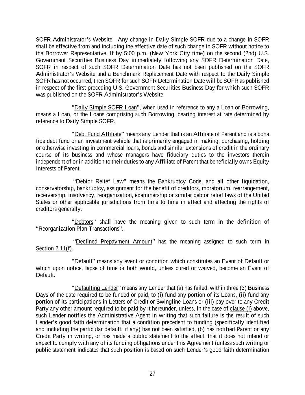 27 SOFR Administrator’s Website. Any change in Daily Simple SOFR due to a change in SOFR shall be effective from and including the effective date of such change in SOFR without notice to the Borrower Representative. If by 5:00 p.m. (New York City time) on the second (2nd) U.S. Government Securities Business Day immediately following any SOFR Determination Date, SOFR in respect of such SOFR Determination Date has not been published on the SOFR Administrator’s Website and a Benchmark Replacement Date with respect to the Daily Simple SOFR has not occurred, then SOFR for such SOFR Determination Date will be SOFR as published in respect of the first preceding U.S. Government Securities Business Day for which such SOFR was published on the SOFR Administrator’s Website. “Daily Simple SOFR Loan”, when used in reference to any a Loan or Borrowing, means a Loan, or the Loans comprising such Borrowing, bearing interest at rate determined by reference to Daily Simple SOFR. “Debt Fund Affiliate” means any Lender that is an Affiliate of Parent and is a bona fide debt fund or an investment vehicle that is primarily engaged in making, purchasing, holding or otherwise investing in commercial loans, bonds and similar extensions of credit in the ordinary course of its business and whose managers have fiduciary duties to the investors therein independent of or in addition to their duties to any Affiliate of Parent that beneficially owns Equity Interests of Parent. “Debtor Relief Law” means the Bankruptcy Code, and all other liquidation, conservatorship, bankruptcy, assignment for the benefit of creditors, moratorium, rearrangement, receivership, insolvency, reorganization, examinership or similar debtor relief laws of the United States or other applicable jurisdictions from time to time in effect and affecting the rights of creditors generally. “Debtors” shall have the meaning given to such term in the definition of “Reorganization Plan Transactions”. “Declined Prepayment Amount” has the meaning assigned to such term in Section 2.11(f). “Default” means any event or condition which constitutes an Event of Default or which upon notice, lapse of time or both would, unless cured or waived, become an Event of Default. “Defaulting Lender” means any Lender that (a) has failed, within three (3) Business Days of the date required to be funded or paid, to (i) fund any portion of its Loans, (ii) fund any portion of its participations in Letters of Credit or Swingline Loans or (iii) pay over to any Credit Party any other amount required to be paid by it hereunder, unless, in the case of clause (i) above, such Lender notifies the Administrative Agent in writing that such failure is the result of such Lender’s good faith determination that a condition precedent to funding (specifically identified and including the particular default, if any) has not been satisfied, (b) has notified Parent or any Credit Party in writing, or has made a public statement to the effect, that it does not intend or expect to comply with any of its funding obligations under this Agreement (unless such writing or public statement indicates that such position is based on such Lender’s good faith determination