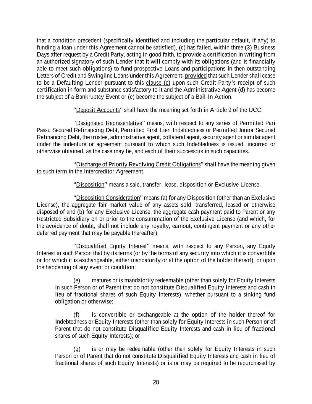 28 that a condition precedent (specifically identified and including the particular default, if any) to funding a loan under this Agreement cannot be satisfied), (c) has failed, within three (3) Business Days after request by a Credit Party, acting in good faith, to provide a certification in writing from an authorized signatory of such Lender that it will comply with its obligations (and is financially able to meet such obligations) to fund prospective Loans and participations in then outstanding Letters of Credit and Swingline Loans under this Agreement; provided that such Lender shall cease to be a Defaulting Lender pursuant to this clause (c) upon such Credit Party’s receipt of such certification in form and substance satisfactory to it and the Administrative Agent (d) has become the subject of a Bankruptcy Event or (e) become the subject of a Bail-In Action. “Deposit Accounts” shall have the meaning set forth in Article 9 of the UCC. “Designated Representative” means, with respect to any series of Permitted Pari Passu Secured Refinancing Debt, Permitted First Lien Indebtedness or Permitted Junior Secured Refinancing Debt, the trustee, administrative agent, collateral agent, security agent or similar agent under the indenture or agreement pursuant to which such Indebtedness is issued, incurred or otherwise obtained, as the case may be, and each of their successors in such capacities. “Discharge of Priority Revolving Credit Obligations” shall have the meaning given to such term in the Intercreditor Agreement. “Disposition” means a sale, transfer, lease, disposition or Exclusive License. “Disposition Consideration” means (a) for any Disposition (other than an Exclusive License), the aggregate fair market value of any assets sold, transferred, leased or otherwise disposed of and (b) for any Exclusive License, the aggregate cash payment paid to Parent or any Restricted Subsidiary on or prior to the consummation of the Exclusive License (and which, for the avoidance of doubt, shall not include any royalty, earnout, contingent payment or any other deferred payment that may be payable thereafter). “Disqualified Equity Interest” means, with respect to any Person, any Equity Interest in such Person that by its terms (or by the terms of any security into which it is convertible or for which it is exchangeable, either mandatorily or at the option of the holder thereof), or upon the happening of any event or condition: (e) matures or is mandatorily redeemable (other than solely for Equity Interests in such Person or of Parent that do not constitute Disqualified Equity Interests and cash in lieu of fractional shares of such Equity Interests), whether pursuant to a sinking fund obligation or otherwise; (f) is convertible or exchangeable at the option of the holder thereof for Indebtedness or Equity Interests (other than solely for Equity Interests in such Person or of Parent that do not constitute Disqualified Equity Interests and cash in lieu of fractional shares of such Equity Interests); or (g) is or may be redeemable (other than solely for Equity Interests in such Person or of Parent that do not constitute Disqualified Equity Interests and cash in lieu of fractional shares of such Equity Interests) or is or may be required to be repurchased by