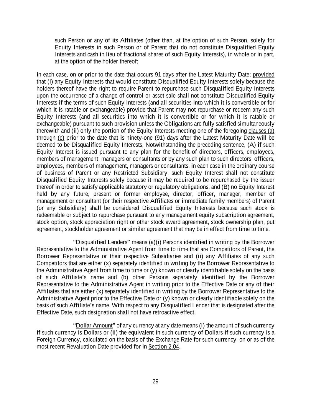 29 such Person or any of its Affiliates (other than, at the option of such Person, solely for Equity Interests in such Person or of Parent that do not constitute Disqualified Equity Interests and cash in lieu of fractional shares of such Equity Interests), in whole or in part, at the option of the holder thereof; in each case, on or prior to the date that occurs 91 days after the Latest Maturity Date; provided that (i) any Equity Interests that would constitute Disqualified Equity Interests solely because the holders thereof have the right to require Parent to repurchase such Disqualified Equity Interests upon the occurrence of a change of control or asset sale shall not constitute Disqualified Equity Interests if the terms of such Equity Interests (and all securities into which it is convertible or for which it is ratable or exchangeable) provide that Parent may not repurchase or redeem any such Equity Interests (and all securities into which it is convertible or for which it is ratable or exchangeable) pursuant to such provision unless the Obligations are fully satisfied simultaneously therewith and (ii) only the portion of the Equity Interests meeting one of the foregoing clauses (a) through (c) prior to the date that is ninety-one (91) days after the Latest Maturity Date will be deemed to be Disqualified Equity Interests. Notwithstanding the preceding sentence, (A) if such Equity Interest is issued pursuant to any plan for the benefit of directors, officers, employees, members of management, managers or consultants or by any such plan to such directors, officers, employees, members of management, managers or consultants, in each case in the ordinary course of business of Parent or any Restricted Subsidiary, such Equity Interest shall not constitute Disqualified Equity Interests solely because it may be required to be repurchased by the issuer thereof in order to satisfy applicable statutory or regulatory obligations, and (B) no Equity Interest held by any future, present or former employee, director, officer, manager, member of management or consultant (or their respective Affiliates or immediate family members) of Parent (or any Subsidiary) shall be considered Disqualified Equity Interests because such stock is redeemable or subject to repurchase pursuant to any management equity subscription agreement, stock option, stock appreciation right or other stock award agreement, stock ownership plan, put agreement, stockholder agreement or similar agreement that may be in effect from time to time. “Disqualified Lenders” means (a)(i) Persons identified in writing by the Borrower Representative to the Administrative Agent from time to time that are Competitors of Parent, the Borrower Representative or their respective Subsidiaries and (ii) any Affiliates of any such Competitors that are either (x) separately identified in writing by the Borrower Representative to the Administrative Agent from time to time or (y) known or clearly identifiable solely on the basis of such Affiliate’s name and (b) other Persons separately identified by the Borrower Representative to the Administrative Agent in writing prior to the Effective Date or any of their Affiliates that are either (x) separately identified in writing by the Borrower Representative to the Administrative Agent prior to the Effective Date or (y) known or clearly identifiable solely on the basis of such Affiliate’s name. With respect to any Disqualified Lender that is designated after the Effective Date, such designation shall not have retroactive effect. “Dollar Amount” of any currency at any date means (i) the amount of such currency if such currency is Dollars or (ii) the equivalent in such currency of Dollars if such currency is a Foreign Currency, calculated on the basis of the Exchange Rate for such currency, on or as of the most recent Revaluation Date provided for in Section 2.04.