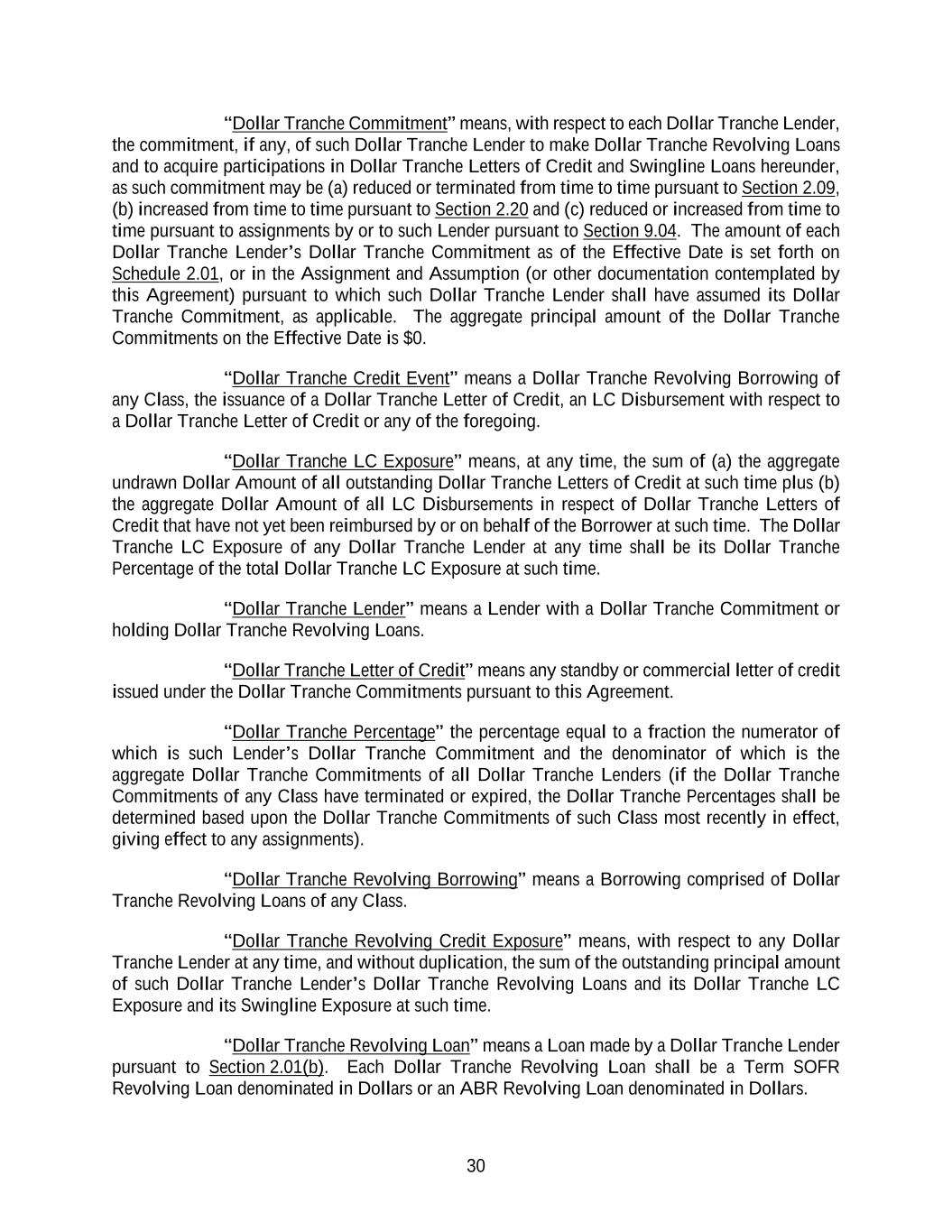 30 “Dollar Tranche Commitment” means, with respect to each Dollar Tranche Lender, the commitment, if any, of such Dollar Tranche Lender to make Dollar Tranche Revolving Loans and to acquire participations in Dollar Tranche Letters of Credit and Swingline Loans hereunder, as such commitment may be (a) reduced or terminated from time to time pursuant to Section 2.09, (b) increased from time to time pursuant to Section 2.20 and (c) reduced or increased from time to time pursuant to assignments by or to such Lender pursuant to Section 9.04. The amount of each Dollar Tranche Lender’s Dollar Tranche Commitment as of the Effective Date is set forth on Schedule 2.01, or in the Assignment and Assumption (or other documentation contemplated by this Agreement) pursuant to which such Dollar Tranche Lender shall have assumed its Dollar Tranche Commitment, as applicable. The aggregate principal amount of the Dollar Tranche Commitments on the Effective Date is $0. “Dollar Tranche Credit Event” means a Dollar Tranche Revolving Borrowing of any Class, the issuance of a Dollar Tranche Letter of Credit, an LC Disbursement with respect to a Dollar Tranche Letter of Credit or any of the foregoing. “Dollar Tranche LC Exposure” means, at any time, the sum of (a) the aggregate undrawn Dollar Amount of all outstanding Dollar Tranche Letters of Credit at such time plus (b) the aggregate Dollar Amount of all LC Disbursements in respect of Dollar Tranche Letters of Credit that have not yet been reimbursed by or on behalf of the Borrower at such time. The Dollar Tranche LC Exposure of any Dollar Tranche Lender at any time shall be its Dollar Tranche Percentage of the total Dollar Tranche LC Exposure at such time. “Dollar Tranche Lender” means a Lender with a Dollar Tranche Commitment or holding Dollar Tranche Revolving Loans. “Dollar Tranche Letter of Credit” means any standby or commercial letter of credit issued under the Dollar Tranche Commitments pursuant to this Agreement. “Dollar Tranche Percentage” the percentage equal to a fraction the numerator of which is such Lender’s Dollar Tranche Commitment and the denominator of which is the aggregate Dollar Tranche Commitments of all Dollar Tranche Lenders (if the Dollar Tranche Commitments of any Class have terminated or expired, the Dollar Tranche Percentages shall be determined based upon the Dollar Tranche Commitments of such Class most recently in effect, giving effect to any assignments). “Dollar Tranche Revolving Borrowing” means a Borrowing comprised of Dollar Tranche Revolving Loans of any Class. “Dollar Tranche Revolving Credit Exposure” means, with respect to any Dollar Tranche Lender at any time, and without duplication, the sum of the outstanding principal amount of such Dollar Tranche Lender’s Dollar Tranche Revolving Loans and its Dollar Tranche LC Exposure and its Swingline Exposure at such time. “Dollar Tranche Revolving Loan” means a Loan made by a Dollar Tranche Lender pursuant to Section 2.01(b). Each Dollar Tranche Revolving Loan shall be a Term SOFR Revolving Loan denominated in Dollars or an ABR Revolving Loan denominated in Dollars.