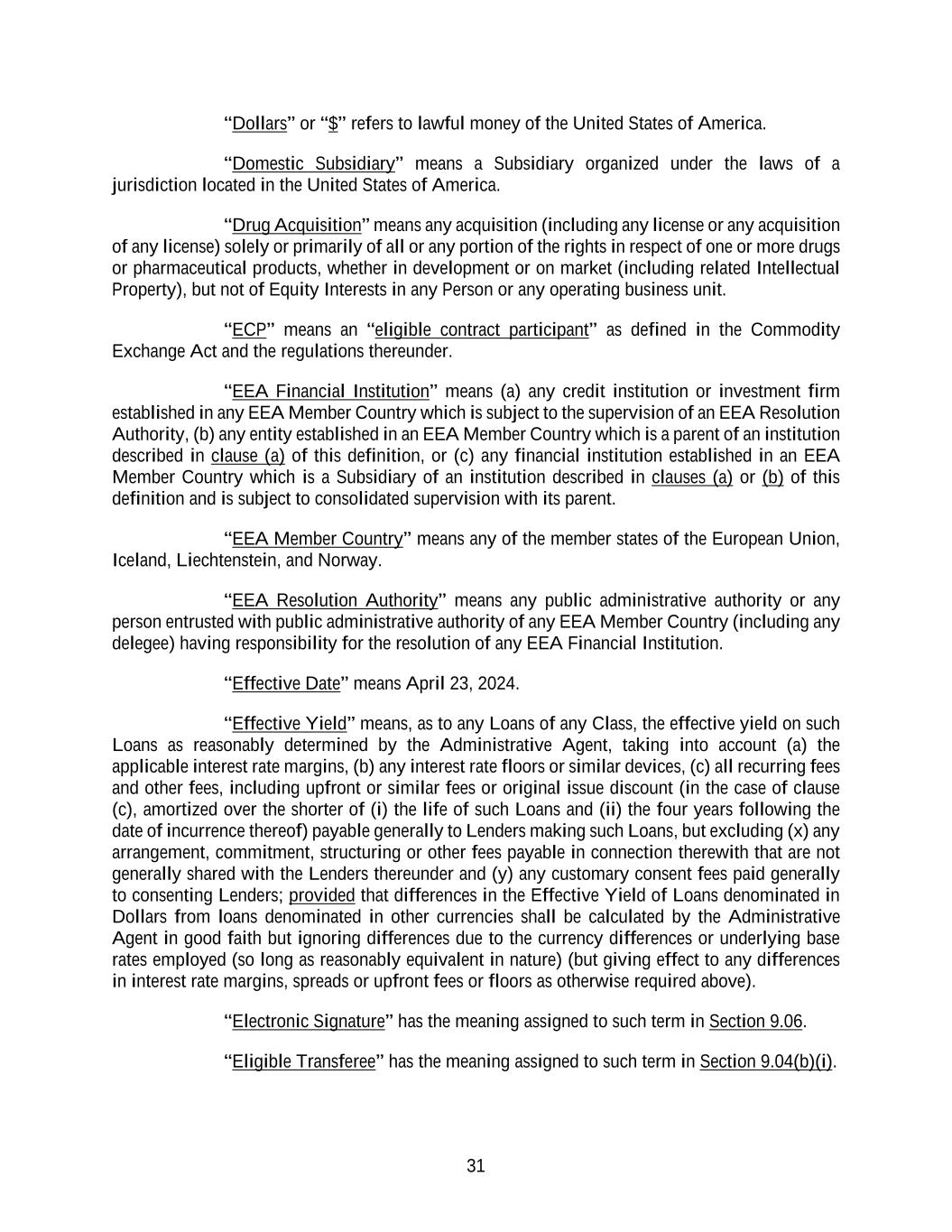 31 “Dollars” or “$” refers to lawful money of the United States of America. “Domestic Subsidiary” means a Subsidiary organized under the laws of a jurisdiction located in the United States of America. “Drug Acquisition” means any acquisition (including any license or any acquisition of any license) solely or primarily of all or any portion of the rights in respect of one or more drugs or pharmaceutical products, whether in development or on market (including related Intellectual Property), but not of Equity Interests in any Person or any operating business unit. “ECP” means an “eligible contract participant” as defined in the Commodity Exchange Act and the regulations thereunder. “EEA Financial Institution” means (a) any credit institution or investment firm established in any EEA Member Country which is subject to the supervision of an EEA Resolution Authority, (b) any entity established in an EEA Member Country which is a parent of an institution described in clause (a) of this definition, or (c) any financial institution established in an EEA Member Country which is a Subsidiary of an institution described in clauses (a) or (b) of this definition and is subject to consolidated supervision with its parent. “EEA Member Country” means any of the member states of the European Union, Iceland, Liechtenstein, and Norway. “EEA Resolution Authority” means any public administrative authority or any person entrusted with public administrative authority of any EEA Member Country (including any delegee) having responsibility for the resolution of any EEA Financial Institution. “Effective Date” means April 23, 2024. “Effective Yield” means, as to any Loans of any Class, the effective yield on such Loans as reasonably determined by the Administrative Agent, taking into account (a) the applicable interest rate margins, (b) any interest rate floors or similar devices, (c) all recurring fees and other fees, including upfront or similar fees or original issue discount (in the case of clause (c), amortized over the shorter of (i) the life of such Loans and (ii) the four years following the date of incurrence thereof) payable generally to Lenders making such Loans, but excluding (x) any arrangement, commitment, structuring or other fees payable in connection therewith that are not generally shared with the Lenders thereunder and (y) any customary consent fees paid generally to consenting Lenders; provided that differences in the Effective Yield of Loans denominated in Dollars from loans denominated in other currencies shall be calculated by the Administrative Agent in good faith but ignoring differences due to the currency differences or underlying base rates employed (so long as reasonably equivalent in nature) (but giving effect to any differences in interest rate margins, spreads or upfront fees or floors as otherwise required above). “Electronic Signature” has the meaning assigned to such term in Section 9.06. “Eligible Transferee” has the meaning assigned to such term in Section 9.04(b)(i).