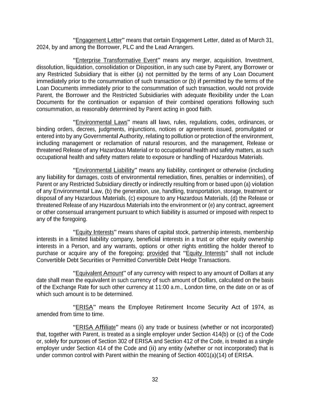 32 “Engagement Letter” means that certain Engagement Letter, dated as of March 31, 2024, by and among the Borrower, PLC and the Lead Arrangers. “Enterprise Transformative Event” means any merger, acquisition, Investment, dissolution, liquidation, consolidation or Disposition, in any such case by Parent, any Borrower or any Restricted Subsidiary that is either (a) not permitted by the terms of any Loan Document immediately prior to the consummation of such transaction or (b) if permitted by the terms of the Loan Documents immediately prior to the consummation of such transaction, would not provide Parent, the Borrower and the Restricted Subsidiaries with adequate flexibility under the Loan Documents for the continuation or expansion of their combined operations following such consummation, as reasonably determined by Parent acting in good faith. “Environmental Laws” means all laws, rules, regulations, codes, ordinances, or binding orders, decrees, judgments, injunctions, notices or agreements issued, promulgated or entered into by any Governmental Authority, relating to pollution or protection of the environment, including management or reclamation of natural resources, and the management, Release or threatened Release of any Hazardous Material or to occupational health and safety matters, as such occupational health and safety matters relate to exposure or handling of Hazardous Materials. “Environmental Liability” means any liability, contingent or otherwise (including any liability for damages, costs of environmental remediation, fines, penalties or indemnities), of Parent or any Restricted Subsidiary directly or indirectly resulting from or based upon (a) violation of any Environmental Law, (b) the generation, use, handling, transportation, storage, treatment or disposal of any Hazardous Materials, (c) exposure to any Hazardous Materials, (d) the Release or threatened Release of any Hazardous Materials into the environment or (e) any contract, agreement or other consensual arrangement pursuant to which liability is assumed or imposed with respect to any of the foregoing. “Equity Interests” means shares of capital stock, partnership interests, membership interests in a limited liability company, beneficial interests in a trust or other equity ownership interests in a Person, and any warrants, options or other rights entitling the holder thereof to purchase or acquire any of the foregoing; provided that “Equity Interests” shall not include Convertible Debt Securities or Permitted Convertible Debt Hedge Transactions. “Equivalent Amount” of any currency with respect to any amount of Dollars at any date shall mean the equivalent in such currency of such amount of Dollars, calculated on the basis of the Exchange Rate for such other currency at 11:00 a.m., London time, on the date on or as of which such amount is to be determined. “ERISA” means the Employee Retirement Income Security Act of 1974, as amended from time to time. “ERISA Affiliate” means (i) any trade or business (whether or not incorporated) that, together with Parent, is treated as a single employer under Section 414(b) or (c) of the Code or, solely for purposes of Section 302 of ERISA and Section 412 of the Code, is treated as a single employer under Section 414 of the Code and (ii) any entity (whether or not incorporated) that is under common control with Parent within the meaning of Section 4001(a)(14) of ERISA.