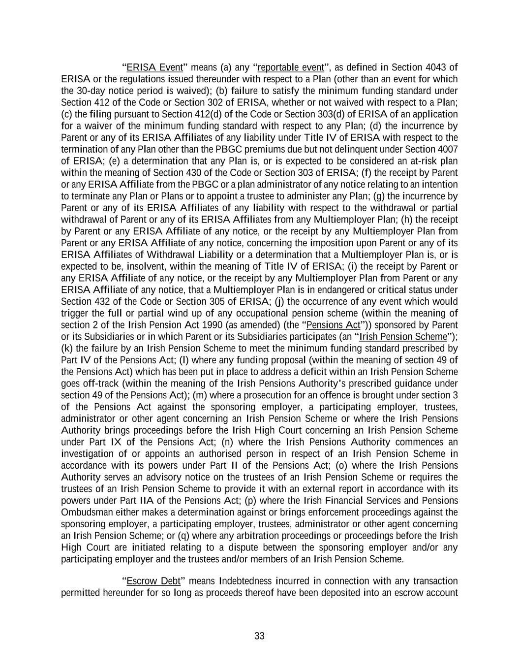 33 “ERISA Event” means (a) any “reportable event”, as defined in Section 4043 of ERISA or the regulations issued thereunder with respect to a Plan (other than an event for which the 30-day notice period is waived); (b) failure to satisfy the minimum funding standard under Section 412 of the Code or Section 302 of ERISA, whether or not waived with respect to a Plan; (c) the filing pursuant to Section 412(d) of the Code or Section 303(d) of ERISA of an application for a waiver of the minimum funding standard with respect to any Plan; (d) the incurrence by Parent or any of its ERISA Affiliates of any liability under Title IV of ERISA with respect to the termination of any Plan other than the PBGC premiums due but not delinquent under Section 4007 of ERISA; (e) a determination that any Plan is, or is expected to be considered an at-risk plan within the meaning of Section 430 of the Code or Section 303 of ERISA; (f) the receipt by Parent or any ERISA Affiliate from the PBGC or a plan administrator of any notice relating to an intention to terminate any Plan or Plans or to appoint a trustee to administer any Plan; (g) the incurrence by Parent or any of its ERISA Affiliates of any liability with respect to the withdrawal or partial withdrawal of Parent or any of its ERISA Affiliates from any Multiemployer Plan; (h) the receipt by Parent or any ERISA Affiliate of any notice, or the receipt by any Multiemployer Plan from Parent or any ERISA Affiliate of any notice, concerning the imposition upon Parent or any of its ERISA Affiliates of Withdrawal Liability or a determination that a Multiemployer Plan is, or is expected to be, insolvent, within the meaning of Title IV of ERISA; (i) the receipt by Parent or any ERISA Affiliate of any notice, or the receipt by any Multiemployer Plan from Parent or any ERISA Affiliate of any notice, that a Multiemployer Plan is in endangered or critical status under Section 432 of the Code or Section 305 of ERISA; (j) the occurrence of any event which would trigger the full or partial wind up of any occupational pension scheme (within the meaning of section 2 of the Irish Pension Act 1990 (as amended) (the “Pensions Act”)) sponsored by Parent or its Subsidiaries or in which Parent or its Subsidiaries participates (an “Irish Pension Scheme”); (k) the failure by an Irish Pension Scheme to meet the minimum funding standard prescribed by Part IV of the Pensions Act; (l) where any funding proposal (within the meaning of section 49 of the Pensions Act) which has been put in place to address a deficit within an Irish Pension Scheme goes off-track (within the meaning of the Irish Pensions Authority’s prescribed guidance under section 49 of the Pensions Act); (m) where a prosecution for an offence is brought under section 3 of the Pensions Act against the sponsoring employer, a participating employer, trustees, administrator or other agent concerning an Irish Pension Scheme or where the Irish Pensions Authority brings proceedings before the Irish High Court concerning an Irish Pension Scheme under Part IX of the Pensions Act; (n) where the Irish Pensions Authority commences an investigation of or appoints an authorised person in respect of an Irish Pension Scheme in accordance with its powers under Part II of the Pensions Act; (o) where the Irish Pensions Authority serves an advisory notice on the trustees of an Irish Pension Scheme or requires the trustees of an Irish Pension Scheme to provide it with an external report in accordance with its powers under Part IIA of the Pensions Act; (p) where the Irish Financial Services and Pensions Ombudsman either makes a determination against or brings enforcement proceedings against the sponsoring employer, a participating employer, trustees, administrator or other agent concerning an Irish Pension Scheme; or (q) where any arbitration proceedings or proceedings before the Irish High Court are initiated relating to a dispute between the sponsoring employer and/or any participating employer and the trustees and/or members of an Irish Pension Scheme. “Escrow Debt” means Indebtedness incurred in connection with any transaction permitted hereunder for so long as proceeds thereof have been deposited into an escrow account